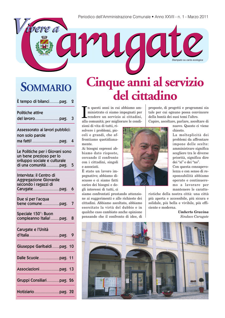 Carugate Vivere a Periodico dell'Amministrazione Comunale • Anno XXVII - n. 1 - Marzo 2011 Stampato su carta ecologica SOMMARIO È tempo di bilanci ...............pag. 2 Politiche attive del lavoro.....................................pag. 3 Assessorato ai lavori pubblici: non solo parole ma fatti! .........................................pag. 4 Le Politiche per i Giovani sono un bene prezioso per lo sviluppo sociale e culturale di una comunità ....................pag. 5 Intervista: il Centro di Aggregazione Giovanile secondo i ragazzi di Carugate........................................pag. 6 Due sì per l’acqua bene comune ..........................pag. 7 Speciale 150°: Buon compleanno Italia! .............pag. 8 Carugate e l’Unità d’Italia ..............................................pag. 9 Giuseppe Garibaldi ...........pag. 10 Dalle Scuole...............................pag. 11 Associazioni ..............................pag. 13 Gruppi Consiliari ...................pag. 26 Notiziario ......................................pag. 32 Cinque anni al servizio del cittadino I n questi anni in cui abbiamo amministrato ci siamo impegnati per rendere un servizio ai cittadini, alla comunità; per migliorare le condizioni di vita di tutti, risolvere i problemi, piccoli e grandi, che affrontiamo quotidianamente. Ai bisogni espressi abbiamo dato risposte, cercando il confronto con i cittadini, singoli e associati. È stato un lavoro impegnativo; abbiamo discusso e ci siamo fatti carico dei bisogni e degli interessi di tutti, ci siamo confrontati prestando attenzione ai suggerimenti e alle richieste dei cittadini. Abbiamo ascoltato, abbiamo esercitato la virtù del dubbio e in qualche caso cambiato anche opinione pensando che il confronto di idee, di proposte, di progetti e programmi sia tale per cui ognuno possa convincere della bontà dei suoi temi l’altro. Capire, ascoltare, parlare, ascoltare di nuovo. Questo ci viene chiesto. La molteplicità dei problemi da affrontare impone delle scelte: amministrare significa scegliere tra le diverse priorità, significa dire dei “sì” e dei “no”. Con questa consapevolezza e con senso di responsabilità abbiamo operato e continueremo a lavorare per mantenere le caratteristiche della nostra città: una città più aperta e accessibile, più sicura e solidale, più bella e vivibile, più efficiente e moderna. Umberto Gravina Sindaco Carugate Amministrazione È tempo di bilanci Tra le incertezze del presente e le sfide del futuro È tempo di bilanci per il nostro comune, per il quale si avvicina la scadenza del bilancio di previsione 2011, e si conclude anche il mandato amministrativo con l’avvicinarsi della scadenza elettorale con le amministrative di primavera. Il bilancio 2011, non bisogna nasconderselo, è un bilancio difficile, sia per i tagli che il governo ha fatto a tutti i comuni, virtuosi e non, ma soprattutto per le incertezze sulle prospettive future che impediscono una seria e coerente programmazione. Abbiamo potuto chiudere il bilancio 2011 senza tagli ai servizi ai cittadini o ritocchi alle tariffe solo grazie ad una oculata gestione del bilancio in questi 5 anni, che ha visto l’amministrazione comunale ridurre l’indebitamento da 13 a 8 milioni di euro e così liberare risorse per sostenere i servizi. Nel 2011 ci soccorre anche l’investimento sul campo fotovoltaico e una ulteriore riduzione dei mutui, ma tra taglio di trasferimenti e vincolo del patto di stabilità la manovra finanziaria ci toglie più di 800 mila euro. Molti comuni, anche in Lombardia, non ce la faranno con questi tagli a chiudere i loro bilanci. Oggi più che mai negli ultimi venti anni si ha la sensazione di un declino della dimensione locale che sta subendo il più pesante attacco centralistico alla sua autonomia dal dopoguerra. Un attacco che si traduce, nonostante il conclamato orientamento federalista del governo, in un taglio del 15% dei trasferimenti agli enti locali mentre non si fa nulla per ridurre sprechi e clientelismi governativi. Tanto che a Catania si sono regalati 140 milioni per coprire i buchi della loro gestione fallimentare e a Roma capitale una legge votata anche dai rappresentanti della Lega si sono dati 500 milioni annui, alla faccia di Roma ladrona. Ma non è solo una questione di trasfe- rimenti: viene di fatto cancellata ogni autonomia impositiva dei comuni, si attacca l’autonomia statutaria, con irragionevoli imposizioni dal centro sugli organismi e le procedure di partecipazione, si colpisce l’autonomia nell’organizzazione delle amministrazioni; soprattutto si impongono regole sul patto di stabilità che penalizzano gli enti locali virtuosi e impediscono di finanziare opere pubbliche che darebbero risposte importanti ai cittadini e lavoro alle imprese. Se all’indebolimento del ruolo dei comuni si sommano i tagli fatti da questo governo alla scuola, alla cultura, alla ricerca, la riduzione delle risorse alle regioni per la sanità pubblica, e i tagli alle forze dell’ordine nonostante l’enfasi sulla sicurezza, il quadro si completa e si capisce che questi interventi sono tutti tasselli di un unico disegno teso ad allentare il ruolo regolatore e solidaristico dell’intervento pubblico e lasciare campo alla logica privatistica del mercato. Perché se si continua a tagliare in modo orizzontale sui comuni, senza distinzioni tra chi ha sprecato e chi invece ha gestito bene le sue risorse, l’obiettivo è quello di colpire i servizi sociali, il sostegno scolastico ai disabili, i contributi alle famiglie con anziani ricoverati nelle case di riposo o per le integrazioni alle rette dell’asilo nido, la rete di solidarietà che si dirama 2 attraverso le associazioni del territorio,e via dicendo. A questa prospettiva ci siamo opposti e ci opporremo, anzi in questi 5 anni il nostro obiettivo è stato quello di incrementare i servizi ai cittadini, con nuovi interventi diretti ma anche aumentando il sostegno alle associazioni