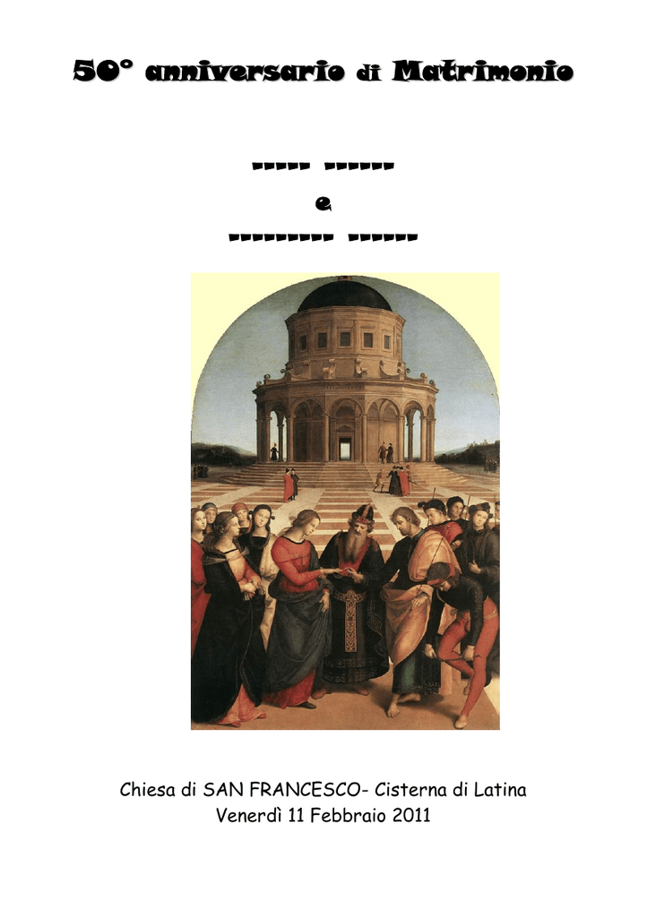 50° anniversario di Matr imonio ----- -----e --------- ------ Chiesa di SAN FRANCESCO- Cisterna di Latina Venerdì 11 Febbraio 2011 Riti di introduzione SALUTO DEL CELEBRANTE Cel.: Nel nome del Padre e del Figlio e dello Spirito Santo Ass: Amen Cel.: Il Signore che guida i nostri cuori nell'amore e nella pienezza di Cristo sia con tutti voi Ass: E con il tuo spirito ATTO PENITENZIALE Cel.: Signore, che sei la pienezza di verità e di grazia, abbi pietà di noi. Ass: Signore, pietà. Cel.: Cristo, che ti sei fatto povero per arricchirci, abbi pietà di noi. Ass: Cristo, pietà. Cel.: Signore, che sei venuto a fare di noi il tuo popolo santo, abbi pietà di noi. Ass: Signore, pietà. Cel.: Dio onnipotente abbia misericordia di noi, perdoni i nostri peccati e conduca alla vita eterna. Ass: Amen. 2 COLLETTA Cel.: Preghiamo: O Dio, che hai guidato questi coniugi in un’indissolubile comunità di vita attraverso gioie e dolori, purifica e accresci il loro amore con la forza del tuo Spirito, e dona loro, dopo 50 anni di vita trascorsi insieme, un’esperienza sempre più ricca e feconda del Tuo amore, perché insieme con i loro figli godano sempre della tua amicizia. Per il nostro Signore Gesù Cristo, Tuo Figlio, che è Dio, e vive e regna con Te, nell’unità dello Spirito Santo, per tutti i secoli dei secoli. Ass.: Amen Liturgia della Parola PRIMA LETTURA Gen 3,1-8 DAL LIBRO DELLA GENESI Il serpente era la più astuta di tutte le bestie selvatiche fatte dal Signore Dio. Egli disse alla donna: «E' vero che Dio ha detto: Non dovete mangiare di nessun albero del giardino?». Rispose la donna al serpente: «Dei frutti degli alberi del giardino noi possiamo mangiare, ma del frutto dell'albero che sta in mezzo al giardino Dio ha detto: Non ne dovete mangiare e non lo dovete toccare, altrimenti morirete». Ma il serpente disse alla donna: «Non morirete affatto! Anzi, Dio sa che quando voi ne mangiaste, si aprirebbero i vostri occhi e diventereste come Dio, conoscendo il bene e il male». Allora la donna vide che l'albero era buono da mangiare, gradito agli occhi e desiderabile per 3 acquistare saggezza; prese del suo frutto e ne mangiò, poi ne diede anche al marito, che era con lei, e anch'egli ne mangiò. Allora si aprirono gli occhi di tutti e due e si accorsero di essere nudi; intrecciarono foglie di fico e se ne fecero cinture. Poi udirono il Signore Dio che passeggiava nel giardino alla brezza del giorno e l'uomo con sua moglie si nascosero dal Signore Dio, in mezzo agli alberi del giardino. Parola di Dio Ass.: Rendiamo grazie a Dio Salmo responsoriale Beato l’uomo a cui è tolta la colpa. Beato l’uomo a cui è tolta la colpa e coperto il peccato. Beato l’uomo a cui Dio non imputa il delitto e nel cui spirito non è inganno. Ti ho fatto conoscere il mio peccato, non ho coperto la mia colpa. Ho detto: «Confesserò al Signore le mie iniquità» e tu hai tolto la mia colpa e il mio peccato. Per questo ti prega ogni fedele nel tempo dell’angoscia; quando irromperanno grandi acque non potranno raggiungerlo. Tu sei il mio rifugio, mi liberi dall’angoscia, mi circondi di canti di liberazione. 4 SECONDA LETTURA Ef 1, 3-6. 15-18 Dalla lettera di san Paolo apostolo agli Efesini. Benedetto Dio, Padre del Signore nostro Gesù Cristo, che ci ha benedetti con ogni benedizione spirituale nei cieli in Cristo. In lui ci ha scelti prima della creazione del mondo per essere santi e immacolati di fronte a lui nella carità, predestinandoci a essere per lui figli adottivi mediante Gesù Cristo, secondo il disegno d'amore della sua volontà, a lode dello splendore della sua grazia, di cui ci ha gratificati nel Figlio amato. Perciò anch'io [Paolo], avendo avuto notizia della vostra fede nel Signore Gesù e dell'amore che avete verso tutti i santi, continuamente rendo grazie per voi ricordandovi nelle mie preghiere, affinché il Dio del Signore nostro Gesù Cristo, il Padre della gloria, vi dia uno spirito di sapienza e di rivelazione per una profonda conoscenza di lui; illumini gli occhi del vostro cuore per farvi comprendere a quale speranza vi ha chiamati, quale tesoro di gloria racchiude la sua eredità fra i santi. Parola di Dio Ass.: Rendiamo grazie a Dio Canto al Vangelo (At 16,14) Alleluia, alleluia. Apri, Signore, il nostro cuore e accoglieremo le parole del Figlio tuo. Alleluia. 5 Vangelo Mc 7,31-37 Dal Vangelo secondo Marco In quel tempo, Gesù, uscito dalla regione di Tiro, passando per Sidòne, venne verso il mare di Galilea in pieno territorio della Decàpoli. Gli portarono un sordomuto e lo pregarono di imporgli la mano. Lo prese in disparte, lontano dalla folla, gli pose le dita negli orecchi e con la saliva gli toccò la lingua; guardando quindi verso il cielo, emise un sospiro e gli disse: «Effatà», cioè: «Apriti!». E subito gli si aprirono gli orecchi, si sciolse il nodo della sua lingua e parlava correttamente. E comandò loro di non dirlo a nessuno. Ma più egli lo proibiva, più essi lo proclamavano e, pieni di stupore, dicevano: «Ha fatto bene ogni cosa: fa udire i sordi e fa parlare i muti!». Parola del Signore Benedizione degli Sposi Cel.: ----------- e -----------, ricorrendo il 50° anniversario del giorno in cui, mediante il sacramento del matrimonio, congiungeste le vostre vite in un vincolo indissolubile, siete venuti nella casa del Signore per rinnovare gli impegni solennemente sanciti davanti all'altare. Perché la divina grazia vi confermi nel santo proposito, rivolgete a Dio il vostro ringraziamento e la vostra supplica. 6 sposo: Benedetto sei tu, o Padre; nella tua bontà mi hai donato ----------come mia moglie. sposa: Benedetto sei tu, o Padre; nella tua bontà mi hai donato ----------come mio marito. l’assemblea risponde cantando: Grazie Signore figlia/o: Mio Dio, ti vogliamo ringraziare per averci messo a fianco un papà ed una mamma generosi e solleciti. Dona loro ancora tanta forza e benedizione perché continuino ad essere per noi e i nipoti un aiut