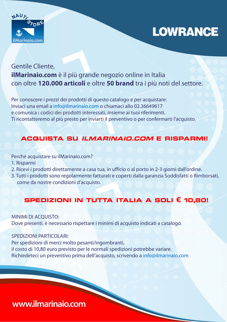 Gentile Cliente, ilMarinaio.com è il più grande negozio online in Italia con oltre 120.000 articoli e oltre 50 brand tra i più noti del settore. Per conoscere i prezzi dei prodotti di questo catalogo e per acquistare: Inviaci una email a [email protected] o chiamaci allo 02.36649617 e comunica i codici dei prodotti interessati, insieme ai tuoi riferimenti. Ti ricontatteremo al più presto per inviarti il preventivo o per confermarti l'acquisto. ACQUISTA SU ILMARINAIO.COM E RISPARMI! Perché acquistare su ilMarinaio.com? 1. Risparmi 2. Ricevi i prodotti direttamente a casa tua, in ufficio o al porto in 2-3 giorni dall’ordine. 3. Tutti i prodotti sono regolarmente fatturati e coperti dalla garanzia Soddisfatti o Rimborsati, come da nostre condizioni d’acquisto. SPEDIZIONI IN TUTTA ITALIA A SOLI € 10,80! MINIMI DI ACQUISTO: Dove presenti, è necessario rispettare i minimi di acquisto indicati a catalogo. SPEDIZIONI PARTICOLARI: Per spedizioni di merci molto pesanti/ingombranti, il costo di 10,80 euro previsto per le normali spedizioni potrebbe variare. Richiedeteci un preventivo prima dell’acquisto, scrivendo a [email protected] Introduzione Introduzione Benvenuti al Listino Prezzi Lowrance 2011 Da più di 50 anni la Lowrance è leader mondiale nell'elettronica per la nautica, nel mercato delle barche a motore e della pesca sportiva. Nel corso degli anni la Lowrance ha sviluppato una impressionante gamma di prodotti non solo avanzati, ma anche a prezzi ragionevoli e di facile utilizzo. Indice del Listino Prezzi Di seguito viene riportato un elenco di tutti i capitoli del Listino Prezzi con il dettaglio dei prodotti contenuti in ciascuno di essi. Sistema Alta Definizione HDS Serie Elite e Mark HDS-10, HDS-8, HDS-7, HDS-5 HDS-10m, HDS-8m, HDS-7m, HDS-5m HDS-5x Espandete il vostro HDS Elite-5 DSI, Elite-5x DSI, Mark-5x DSI, Mark-5x DSI Portatile Elite-5, Elite-5m, Elite-5x, Mark-5x PRO, Mark-5x, Mark 5x Portatile Serie X e M X-67c, X-59 DF, X-52, M-52i X-4, X-4 Pro, X-4 Portatile StructureScan™ Sonar Imaging co m LSS-1 Comunicazioni VHF Server Audio Marino LVR-880, LVR-250, LHR-80 SonicHub™ Indicatori Digitali LMF-400, LMF-200, LST-3800 Broadband Radar™ BR24 Navigazione GPS all'Aperto o. Endura™ Series - Sierra, Safari, Out&Back Radar Digitale Alta Definizione LRA-1800, LRA-2400, TX06L-1 Accessori e Parti di Ricambio ai Broadband Sounder™ ar in BSM-1 Sistema Automatico Identificazione NAIS-300 ilM Come contattare la Navico: SUPPORTO CLIENTI: Telefono: +39 02/26149517 Email: [email protected] SUPPORTO CONCESSIONARI/DISTRIBUTORI: Telefono: +39 02/26149517 Email: [email protected] GESTIONE ORDINI: Telefono: +39 02/26149517 Email: [email protected] PER ULTERIORI INFORMAZIONI: Accedere al portale Navico Partner http://partners.navico.com per le informazioni sui programmi e sui prezzi. Contattare il vostro Direttore Vendite locale, oppure il Navico Order Management per informazioni login o per altre informazioni. Documento non contrattuale. Prezzi e prodotti sono soggetti a revisioni senza preavviso. Eventuali errori tipografici presenti nel listino non coinvolgono la responsabilità navico. Listino Prezzi 2011 1 Versione 1.0 Introduzione Introduzione Utilizzo del Listino Prezzi Lowrance Il listino prezzi 2011 è stato sudiato in modo da costituire una guida comprensiva per tutti i prodotti principali, per gli accessori e per le parti di ricambio. Per agevolarne l'uso, gli accessori e le parti di ricambio associati ai prodotti principali sono riportati sotto gli stessi. Scelta Prodotto Nome Prodotto ed Introduzione Una breve introduzione sintetizza il prodotto o la sua gamma. Caratteristiche Principali Punti eslusivi del prodotto o della sua gamma. co m Immagine Prodotto Immagine che mostra lo specifico prodotto. o. Modello Illustrato Parti che possono essere usate con o aggiunte ai prodotti principali. ilM Parti di Ricambio Parti di Ricambio per i prodotti principali. ar in Accessori ai Prodotti Principali Linea Principale della gamma di prodotti Lowrance associati a questo modello. Data Validità Prezzi Listino Prezzi 2011 22 Versione 1.0 Numero Pagina Usate questo numero quando fate riferimento alla specifica pagina del Listino Prezzi. Il piede pagina contiene anche un numero di versione. Listino Prezzi 2011 2 Versione 1.0 SistemaAlta AltaDefinizione DefinizioneHDS HDS Sistema HDS Multifunzione Ecoscandaglio/GPS Plotter Cartografico Il miglior scandaglio e plotter cartografico GPS combinati in un brillante apparato. Lo scandaglio a banda larga incorporato mostra immagini a grande profondità, target di chiarezza cristallina, con una ampiezza di copertura che raggiunge i 120° con l'aggiunta degli 83 kHz. La sensibilissima antenna a 16 canali fornisce precisi rilevamenti anche quando l'apparato viene montato ad incasso nella plancia. Compatibile con la gamma completa delle carte Navionics comprese quelle 3D capaci di offrire la nuova funzione Turbo View per una migliorata visione 3D. I modelli HDS-8 e 10 dispongono della nuova manopola di comando con i tasti ad un solo tocco che consentono controlli più facili e rapidi. Gli HDS-7, 8 e 10 hanno schermi luminosissimi con retroilluminazione bianca a LED per migliorare la visione in tutte le condizioni di luce. Caratteristiche Principali HDS-8 HDS-7 HDS-5 ilM ar in HDS-10 ai o. co m • Antenna GPS WAAS interna a 16 canali ad alta sensibilità • Ecoscandaglio incorporato Broadband Sounder™ • Display SolarMAX™ PLUS per visibilità in pieno sole • Cartografia base Navionics pre caricata • Opzioni Cartografiche che comprendono Navionics® Platinum+HotMaps Platinum con TurboView™ • Opzioni aggiuntive Ethernet: LSS-1 Sonar StructureScan™, BR24 Broadband Radar™, Antenne Radar Digitali HD. • Rete NMEA 2000® Nuove migliorie software per navigazione con Broad Band Radar™: Veloce rotazione di Scansione, MARPA, Zone di Guardia. Nuova integrazione con commutazione digitale • Due anni di Garanzia Limitata Gauges inf