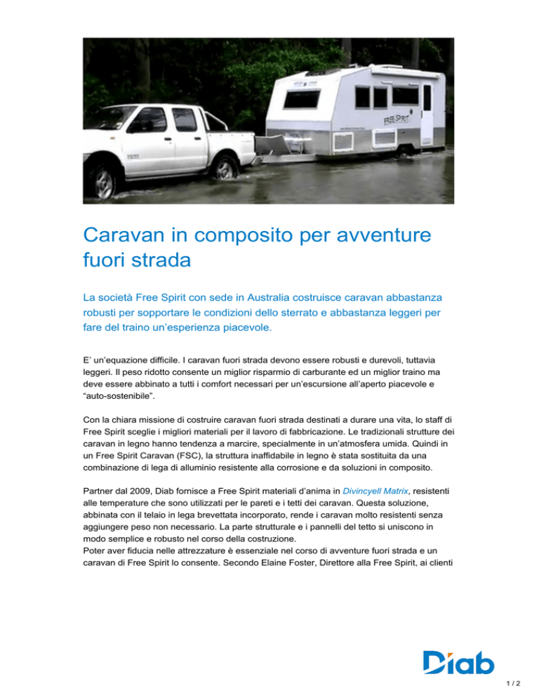 Caravan in composito per avventure fuori strada La società Free Spirit con sede in Australia costruisce caravan abbastanza robusti per sopportare le condizioni dello sterrato e abbastanza leggeri per fare del traino un’esperienza piacevole. E’ un’equazione difficile. I caravan fuori strada devono essere robusti e durevoli, tuttavia leggeri. Il peso ridotto consente un miglior risparmio di carburante ed un miglior traino ma deve essere abbinato a tutti i comfort necessari per un’escursione all’aperto piacevole e “auto-sostenibile”. Con la chiara missione di costruire caravan fuori strada destinati a durare una vita, lo staff di Free Spirit sceglie i migliori materiali per il lavoro di fabbricazione. Le tradizionali strutture dei caravan in legno hanno tendenza a marcire, specialmente in un’atmosfera umida. Quindi in un Free Spirit Caravan (FSC), la struttura inaffidabile in legno è stata sostituita da una combinazione di lega di alluminio resistente alla corrosione e da soluzioni in composito. Partner dal 2009, Diab fornisce a Free Spirit materiali d’anima in Divincyell Matrix, resistenti alle temperature che sono utilizzati per le pareti e i tetti dei caravan. Questa soluzione, abbinata con il telaio in lega brevettata incorporato, rende i caravan molto resistenti senza aggiungere peso non necessario. La parte strutturale e i pannelli del tetto si uniscono in modo semplice e robusto nel corso della costruzione. Poter aver fiducia nelle attrezzature è essenziale nel corso di avventure fuori strada e un caravan di Free Spirit lo consente. Secondo Elaine Foster, Direttore alla Free Spirit, ai clienti 1/2 piace veramente la struttura accuratamente progettata, che offre tutta una serie di vantaggi. Con il suo miglior isolamento termico — con tempo caldo e freddo — non c’è condensa o marcescenza del legno. Più facile da riparare dei caravan tradizionali un FSc è impermeabile agli insetti e all’acqua. E il caravan non compromette il comfort. Le unità interne del caravan sono assemblate da un team esperto e qualificato, che crea una zona cucina, lounge e notte unica — con le soluzioni in composito che permettono ai clienti di scegliere il colore della finitura. Diab ha assistito inizialmente lo staff Free Spirit ma oggi i membri dello staff gestiscono il lavoro di costruzione autonomamente. Parte essenziale del marchio di successo Free Spirit, la soluzione Diab è molto apprezzata dai clienti Free Spirit, che beneficiano dell’opportunità di sperimentare avventure con tutti i comfort in ambienti selvaggi. www.freespiritcaravans.com.au/ 2/2