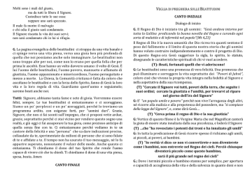 Molti sono i mali del giusto, ma da tutti lo libera il Signore. Custodisce tutte le sue ossa: neppure uno sarà spezzato. Il male fa morire il malvagio e chi odia il giusto sarà condannato. Il Signore riscatta la vita dei suoi servi; non sarà condannato chi in lui si rifugia. G. La pagina evangelica delle beatitudini ci strappa da una vita banale e ci spinge verso una vita piena, verso una gioia ben più profonda di quella che noi possiamo anche solo immaginare. Le beatitudini non sono troppo alte per noi, come non lo erano per quella folla che per prima le ascoltò. Esse hanno un volto davvero umano: il volto di Gesù. È lui l'uomo delle beatitudini, l'uomo povero, mansueto e affamato di giustizia, l'uomo appassionato e misericordioso, l'uomo perseguitato e messo a morte. La Chiesa, la Comunità cristiana è fatta da coloro che ascoltano le beatitudini e con la forza dello Spirito, fanno di Gesù la loro vita e la loro regola di vita. Guardiamo quest'uomo e seguiamolo; saremo beati anche noi. Tutti: Signore, abbiamo tanta fame e sete di gioia. Vorremmo essere felici, sempre. Le tue beatitudini ci entusiasmano e ci scoraggiano. Siamo un po’ perplessi e un po’ scoraggiati, perché lo troviamo un programma ardito, con esigenze forti, per “uomini duri”. Grazie, Signore, che non ci fai sconti sull’impegno, che ci proponi vette ardue, grazie, soprattutto perché ci stai vicino per rendere questo sogno una realtà, e già oggi ci fai assaporare la tua gioia, come prezioso anticipo di quella senza fine con te. Ci entusiasmano perché vediamo in te un cantore della felicità e una “persona” che sa dare indicazioni precise, collaudate da te, sperimentate da milioni di persone che si sono fidate di te e affidate a te. Il tempo non ha usurato il tuo messaggio, né lo fa apparire superato, nonostante il valzer delle mode. Anche questo ci entusiasma. Ti chiediamo il dono del tuo Spirito che rende l’uomo capace di vivere ciò che tu chiedi. Ti chiediamo il dono di una vita piena, spesa, beata. Amen CANTO FINALE VEGLIA DI PREGHIERA SULLE BEATITUDINI CANTO INIZIALE Dialogo di inizio: G. Il Regno di Dio è iniziato tra gli uomini: "Gesù andava intorno per tutta la Galilea predicando la buona novella del Regno e curando ogni sorta di malattie e di infermità nel popolo"(Mt 4,23) Il Regno di Dio è la nuova umanità che Dio ricrea tra quanti sentono il peso del fallimento e il limite di questa nostra storia che gli uomini hanno voluto costruire indipendentemente e contro il progetto di Dio. Di questo Regno ora Gesù suggerisce la sigla, lo spirito, lo statuto, disegnando le caratteristiche spirituali di chi vi vuol accedere. (T): Beati, fortunati quelli che vi aderiscono! G: Le beatitudini sono una promessa di vera felicità. Una promessa che può illuminare e sorreggere la vita soprattutto dei "Poveri di Jahvè", coloro cioè che vivono la propria vita integra nella fedeltà al Signore e nella aspettativa della sua ricompensa. (T) "Cercate il Signore voi tutti, poveri della terra, che seguite i suoi ordini; cercate la giustizia e l'umiltà, per trovarvi al riparo nel giorno dell'ira del Signore" G: E' "un popolo umile e povero" perché non vive l'arroganza degli altri, né ricorre alla malizia e alla prepotenza del possedere, ma "si compiace della legge del Signore", e, come dirà Gesù… (T) "Cerca prima il regno di Dio e la sua giustizia" G: Vertice di questo filone è la Vergine Maria che nel Magnificat canterà la gioia di essere stata innalzata dalla sua piccolezza, e loderà il Signore (T) …che "ha rovesciato i potenti dai troni e ha innalzato gli umili" G: In tutta la predicazione di Gesù ricorre spesso il richiamo agli umili, ai piccoli, ai poveri, ai bambini. (T) "In verità vi dico: se non vi convertirete e non diventerete come i bambini, non entrerete nel Regno dei cieli. Perciò chiunque diventerà piccolo come questo bambino, sarà il più grande nel regno dei cieli" G.: Dove i termini piccolo e bambino stanno per semplice, per apertura e capacità di accoglienza della vita e della salvezza in quanto doni e non come pretesa o propria conquista. Guardando i primi discepoli che l'avevano seguito, un giorno Gesù disse: (T) "Ti benedico, o Padre, Signore del cielo e della terra, perché hai tenuto nascoste queste cose ai sapienti e agli intelligenti e le hai rivelate ai piccoli. Sì, o Padre, perché così è piaciuto a te" G: Questo dato di fatto si ripercuote nella Chiesa. Ce ne parla san Paolo in riferimento alla comunità di Corinto: (T) "Considerate la vostra vocazione, fratelli: non ci sono tra voi molti sapienti secondo la carne, non molti potenti, non molti nobili". G: Solo il cuore umile e povero si apre a Dio. Il motivo lo spiega nuovamente Paolo: (T) "Dio ha scelto ciò che nel mondo è stolto per confondere i sapienti, Dio ha scelto ciò che nel mondo è debole per confondere i forti, Dio ha scelto ciò che nel mondo è ignobile e disprezzato e ciò che è nulla per ridurre a nulla le cose che sono, perché nessuno possa gloriarsi davanti a Dio" G: Ecco il punto: nessuno deve pensare di salvarsi da sé. Senza l'aiuto di Dio e la sua grazia l'uomo fallisce. (T) Fidiamoci delle promesse e dei criteri di Dio, perché il Signore è fedele per sempre. Egli è amorevole e provvidente, si interessa dei deboli, degli oppressi, in una parola degli umili. Beati i poveri in spirito! GESTO Ascoltiamo la parola del Signore dal Vangelo secondo Matteo: In quel tempo, vedendo le folle, Gesù salì sul monte: si pose a sedere e si avvicinarono a lui i suoi discepoli. Si mise a parlare e insegnava loro dicendo: «Beati i poveri in spirito, perché di essi è il regno dei cieli. Beati quelli che sono nel pianto, perché saranno consolati. Beati i miti, perché avranno in eredità la terra. Beati quelli che hanno fame e sete della giustizia, perché saranno saziati. Beati i misericordiosi, perché troveranno misericordia. Beati i puri di cuore, perché vedranno Dio. CANTO Salmo 1