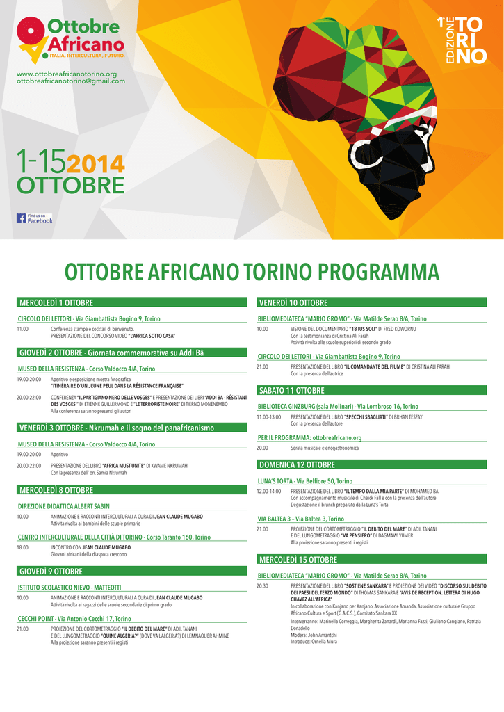 ITALIA, INTERCULTURA, FUTURO. OTTOBRE AFRICANO TORINO PROGRAMMA MERCOLEDÌ 1 OTTOBRE VENERDÌ 10 OTTOBRE CIRCOLO DEI LETTORI - Via Giambattista Bogino 9, Torino BIBLIOMEDIATECA “MARIO GROMO” - Via Matilde Serao 8/A, Torino 11.00 10.00 Conferenza stampa e cocktail di benvenuto. PRESENTAZIONE DEL CONCORSO VIDEO “L’AFRICA SOTTO CASA” GIOVEDÌ 2 OTTOBRE - Giornata commemorativa su Addi Bâ MUSEO DELLA RESISTENZA - Corso Valdocco 4/A, Torino 19.00-20.00 Aperitivo e esposizione mostra fotografica “ITINÉRAIRE D’UN JEUNE PEUL DANS LA RÉSISTANCE FRANÇAISE” 20.00-22.00 CONFERENZA “IL PARTIGIANO NERO DELLE VOSGES” E PRESENTAZIONE DEI LIBRI “ADDI BA - RÉSISTANT DES VOSGES “ DI ETIENNE GUILLERMOND E “LE TERRORISTE NOIRE” DI TIERNO MONENEMBO Alla conferenza saranno presenti gli autori VENERDÌ 3 OTTOBRE - Nkrumah e il sogno del panafricanismo MUSEO DELLA RESISTENZA - Corso Valdocco 4/A, Torino 19.00-20.00 Aperitivo 20.00-22.00 PRESENTAZIONE DEL LIBRO “AFRICA MUST UNITE” DI KWAME NKRUMAH Con la presenza dell’ on. Samia Nkrumah MERCOLEDÌ 8 OTTOBRE CIRCOLO DEI LETTORI - Via Giambattista Bogino 9, Torino 21.00 ANIMAZIONE E RACCONTI INTERCULTURALI A CURA DI JEAN CLAUDE MUGABO Attività rivolta ai bambini delle scuole primarie CENTRO INTERCULTURALE DELLA CITTÀ DI TORINO - Corso Taranto 160, Torino 18.00 INCONTRO CON JEAN CLAUDE MUGABO Giovani africani della diaspora crescono GIOVEDÌ 9 OTTOBRE ISTITUTO SCOLASTICO NIEVO - MATTEOTTI 10.00 ANIMAZIONE E RACCONTI INTERCULTURALI A CURA DI JEAN CLAUDE MUGABO Attività rivolta ai ragazzi delle scuole secondarie di primo grado CECCHI POINT - Via Antonio Cecchi 17, Torino 21.00 PROIEZIONE DEL CORTOMETRAGGIO “IL DEBITO DEL MARE” DI ADIL TANANI E DEL LUNGOMETRAGGIO “OUINE ALGERIA?” (DOVE VA L’ALGERIA?) DI LEMNAOUER AHMINE Alla proiezione saranno presenti i registi PRESENTAZIONE DEL LIBRO “IL COMANDANTE DEL FIUME” DI CRISTINA ALI FARAH Con la presenza dell’autrice SABATO 11 OTTOBRE BIBLIOTECA GINZBURG (sala Molinari) - Via Lombroso 16, Torino 11.00-13.00 PRESENTAZIONE DEL LIBRO “SPECCHI SBAGLIATI” DI BRHAN TESFAY Con la presenza dell’autore PER IL PROGRAMMA: ottobreafricano.org 20.00 Serata musicale e enogastronomica DOMENICA 12 OTTOBRE LUNA’S TORTA - Via Belfiore 50, Torino 12.00-14.00 DIREZIONE DIDATTICA ALBERT SABIN 10.00 VISIONE DEL DOCUMENTARIO “18 IUS SOLI” DI FRED KOWORNU Con la testimonianza di Cristina Ali Farah Attività rivolta alle scuole superiori di secondo grado PRESENTAZIONE DEL LIBRO “IL TEMPO DALLA MIA PARTE” DI MOHAMED BA Con accompagnamento musicale di Cheick Fall e con la presenza dell’autore Degustazione il brunch preparato dalla Luna’s Torta VIA BALTEA 3 – Via Baltea 3, Torino 21.00 PROIEZIONE DEL CORTOMETRAGGIO “IL DEBITO DEL MARE” DI ADIL TANANI E DEL LUNGOMETRAGGIO “VA PENSIERO” DI DAGMAWI YIIMER Alla proiezione saranno presenti i registi MERCOLEDÌ 15 OTTOBRE BIBLIOMEDIATECA “MARIO GROMO” - Via Matilde Serao 8/A, Torino 20.30 PRESENTAZIONE DEL LIBRO “SOSTIENE SANKARA” E PROIEZIONE DEI VIDEO “DISCORSO SUL DEBITO DEI PAESI DEL TERZO MONDO” DI THOMAS SANKARA E “AVIS DE RECEPTION. LETTERA DI HUGO CHAVEZ ALL’AFRICA” In collaborazione con Kanjano per Kanjano, Associazione Amanda, Associazione culturale Gruppo Africano Cultura e Sport (G.A.C.S.), Comitato Sankara XX Interverranno: Marinella Correggia, Margherita Zanardi, Marianna Fazzi, Giuliano Cangiano, Patrizia Donadello Modera: John Amantchi Introduce: Ornella Mura MOSTRE MARTINS DACOSTA é nato a Lagos, Nigeria, 1966. Diplomato al Yaba College of Technology di Lagos. Attualmente vive e lavora a Torino dal 2002 . Pittore, JUDƓFRDWWRUHHVFHQHJJLDWRUH Ha già partecipato a varie mostre sia a Torino che in altre città. ROMAIN SYLVERE MAYOULOU, artista pittore, nasce a Brazzaville, in Congo , e studia all’école de peinture de Poto-Poto sotto la guida di diversi maestri, rivelando tuttavia una marcata tendenza per le arti decorative e l’astratto. Grande intelligenza e ottima tecnica, il suo lavoro è impregnato di serenità, KEITA MOHAMMED, scappato dalla Costa d’Avorio verso il Mali, incarcerato a Tripoli e fuggito, si imbarca per la Sicilia e a diciassette anni raggiunge Roma. $OODVWD]LRQH7HUPLQLLQL]LDDVFDWWDUHIRWRJUDƓHSHUQRQGLPHQWLFDUHSHUQRQ lasciarsi divorare né dalla noia né dalla fame. Per passione. Per denuncia. A OTTOBRE AFRICANO TORINO MARTINS ORGANIZZA UNA MOSTRA DELLE SUE ULTIME OPERE PITTORICHE. AL FESTIVAL OTTOBRE AFRICANO DI TORINO ROMAIN SARÀ PRESENTE CON UNA MOSTRA PITTORICA INTITOLATA AFRICA TERRA DI COLORI. A OTTOBRE AFRICANO TORINO KEITA PRESENTA LA SUA MOSTRA “PIEDI, SCARPE, BAGAGLI” PER IL PROGRAMMA E LE DATE DI INAUGURAZIONE DELLE MOSTRE CONSULTARE IL SITO: ottobreafricanotorino.org Lato interno EVENTO ORGANIZZATO DA CON IL PATROCINIO DI CON IL SOSTEGNO DI CON IL CONTRIBUTO DI CON L’ADESIONE DI