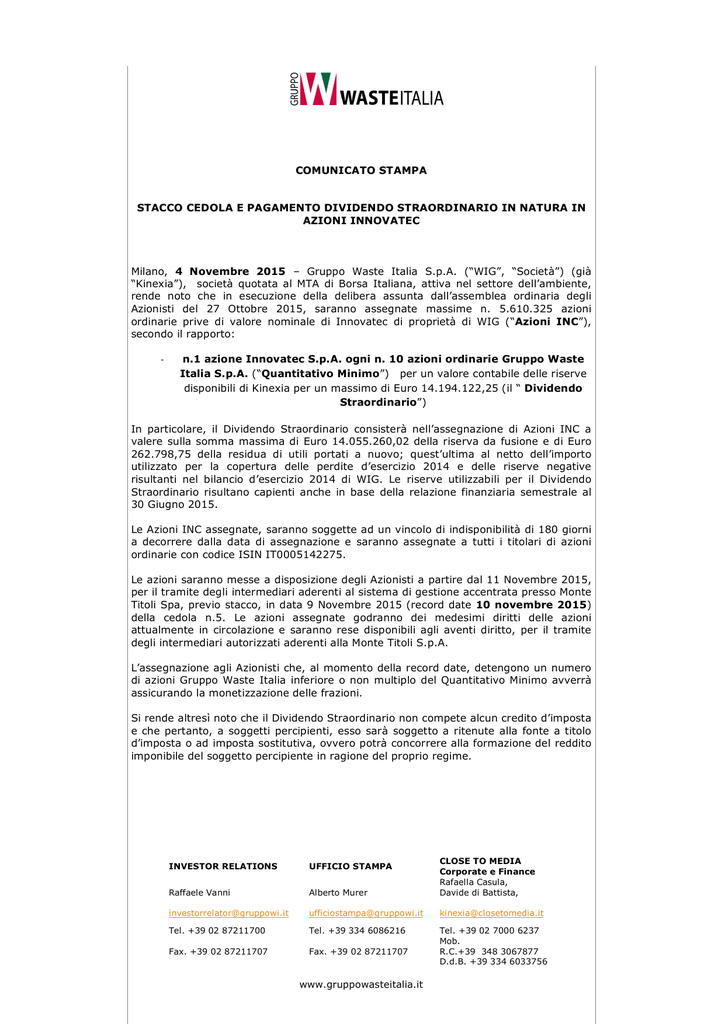 COMUNICATO STAMPA STACCO CEDOLA E PAGAMENTO DIVIDENDO STRAORDINARIO IN NATURA IN AZIONI INNOVATEC Milano, 4 Novembre 2015 – Gruppo Waste Italia S.p.A. (“WIG”, “Società”) (già “Kinexia”), società quotata al MTA di Borsa Italiana, attiva nel settore dell’ambiente, rende noto che in esecuzione della delibera assunta dall’assemblea ordinaria degli Azionisti del 27 Ottobre 2015, saranno assegnate massime n. 5.610.325 azioni ordinarie prive di valore nominale di Innovatec di proprietà di WIG (“Azioni INC”), secondo il rapporto: - n.1 azione Innovatec S.p.A. ogni n. 10 azioni ordinarie Gruppo Waste Italia S.p.A. (“Quantitativo Minimo”) per un valore contabile delle riserve disponibili di Kinexia per un massimo di Euro 14.194.122,25 (il “ Dividendo Straordinario”) In particolare, il Dividendo Straordinario consisterà nell’assegnazione di Azioni INC a valere sulla somma massima di Euro 14.055.260,02 della riserva da fusione e di Euro 262.798,75 della residua di utili portati a nuovo; quest’ultima al netto dell’importo utilizzato per la copertura delle perdite d’esercizio 2014 e delle riserve negative risultanti nel bilancio d’esercizio 2014 di WIG. Le riserve utilizzabili per il Dividendo Straordinario risultano capienti anche in base della relazione finanziaria semestrale al 30 Giugno 2015. Le Azioni INC assegnate, saranno soggette ad un vincolo di indisponibilità di 180 giorni a decorrere dalla data di assegnazione e saranno assegnate a tutti i titolari di azioni ordinarie con codice ISIN IT0005142275. Le azioni saranno messe a disposizione degli Azionisti a partire dal 11 Novembre 2015, per il tramite degli intermediari aderenti al sistema di gestione accentrata presso Monte Titoli Spa, previo stacco, in data 9 Novembre 2015 (record date 10 novembre 2015) della cedola n.5. Le azioni assegnate godranno dei medesimi diritti delle azioni attualmente in circolazione e saranno rese disponibili agli aventi diritto, per il tramite degli intermediari autorizzati aderenti alla Monte Titoli S.p.A. L’assegnazione agli Azionisti che, al momento della record date, detengono un numero di azioni Gruppo Waste Italia inferiore o non multiplo del Quantitativo Minimo avverrà assicurando la monetizzazione delle frazioni. Si rende altresì noto che il Dividendo Straordinario non compete alcun credito d’imposta e che pertanto, a soggetti percipienti, esso sarà soggetto a ritenute alla fonte a titolo d’imposta o ad imposta sostitutiva, ovvero potrà concorrere alla formazione del reddito imponibile del soggetto percipiente in ragione del proprio regime. INVESTOR RELATIONS UFFICIO STAMPA Raffaele Vanni Alberto Murer CLOSE TO MEDIA Corporate e Finance Rafaella Casula, Davide di Battista, [email protected] [email protected] [email protected] Tel. +39 02 87211700 Tel. +39 334 6086216 Fax. +39 02 87211707 Fax. +39 02 87211707 Tel. +39 02 7000 6237 Mob. R.C.+39 348 3067877 D.d.B. +39 334 6033756 www.gruppowasteitalia.it Ulteriori informazioni possono essere consultate nella relazione illustrativa per l’assemblea ordinaria del giorno 27 Ottobre 2015 e nel verbale della stessa, messi a disposizione del pubblico presso la sede legale, sul meccanismo di stoccaggio autorizzato 1Info (www.1Info.it) e sul sito web della società (www.gruppowasteitalia.it) alla sezione Investor Relations - Documenti. *** Gruppo Waste Italia S.p.A (già Kinexia S.p.A.), quotata al segmento MTA di Borsa Italiana è leader italiano, anche in prospettiva dell’annunciata fusione con il Gruppo Biancamano all’esito dell’avveramento delle condizioni sospensive, nel settore della gestione dei rifiuti e dei servizi per l’ambiente, coprendo integralmente tutta la filiera della gestione integrata dei rifiuti attraverso la raccolta, il trasporto, la selezione, il trattamento, il recupero, la valorizzazione e lo smaltimento dei rifiuti speciali. Recentemente l’Emittente ha finalizzato una riorganizzazione strategico societaria al fine di focalizzarsi esclusivamente nel settore ambientale semplificando la propria struttura societaria in un’unica area di business – quella Ambientale – attraverso la cessione del business delle rinnovabili alla controllata Innovatec S.p.A. con successiva cessione della stessa agli azionisti attraverso l’erogazione di un dividendo straordinario in natura. INVESTOR RELATIONS UFFICIO STAMPA Raffaele Vanni Alberto Murer CLOSE TO MEDIA Corporate e Finance Rafaella Casula, Davide di Battista, [email protected] [email protected] [email protected] Tel. +39 02 87211700 Tel. +39 334 6086216 Fax. +39 02 87211707 Fax. +39 02 87211707 Tel. +39 02 7000 6237 Mob. R.C.+39 348 3067877 D.d.B. +39 334 6033756 www.gruppowasteitalia.it