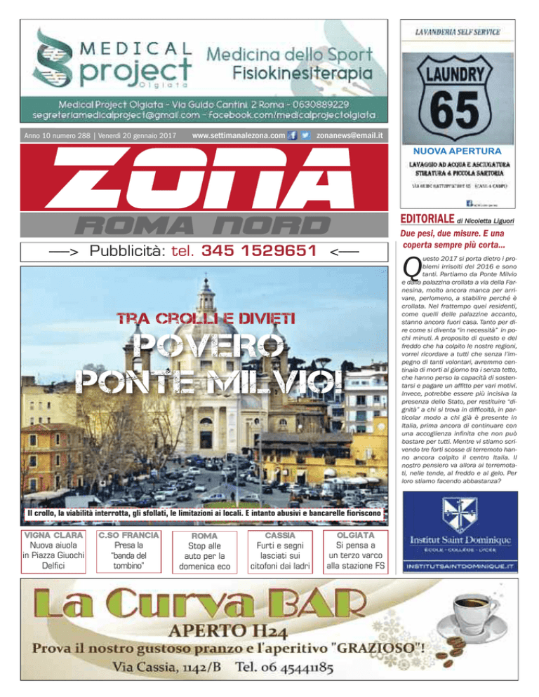 Anno 10 numero 288 | Venerdì 20 gennaio 2017 www.settimanalezona.com [email protected] NUOVA APERTURA EditorialE di Nicoletta Liguori ROMA NORD -----> Pubblicità: tel. 345 1529651 <----- tra crolli e divieti POVERO PONTE MILVIO! Il crollo, la viabilità interrotta, gli sfollati, le limitazioni ai locali. E intanto abusivi e bancarelle fioriscono vigna clara c.so francia roma cassia olgiata Nuova aiuola in Piazza Giuochi Delfici Presa la “banda del tombino” Stop alle auto per la domenica eco Furti e segni lasciati sui citofoni dai ladri Si pensa a un terzo varco alla stazione FS Due pesi, due misure. E una coperta sempre più corta... Q uesto 2017 si porta dietro i problemi irrisolti del 2016 e sono tanti. Partiamo da Ponte Milvio e dalla palazzina crollata a via della Farnesina, molto ancora manca per arrivare, perlomeno, a stabilire perché è crollata. Nel frattempo quei residenti, come quelli delle palazzine accanto, stanno ancora fuori casa. Tanto per dire come si diventa “in necessità” in pochi minuti. A proposito di questo e del freddo che ha colpito le nostre regioni, vorrei ricordare a tutti che senza l’impegno di tanti volontari, avremmo centinaia di morti al giorno tra i senza tetto, che hanno perso la capacità di sostentarsi e pagare un affitto per vari motivi. Invece, potrebbe essere più incisiva la presenza dello Stato, per restituire “dignità” a chi si trova in difficoltà, in particolar modo a chi già è presente in Italia, prima ancora di continuare con una accoglienza infinita che non può bastare per tutti. Mentre vi stiamo scrivendo tre forti scosse di terremoto hanno ancora colpito il centro Italia. Il nostro pensiero va allora ai terremotati, nelle tende, al freddo e al gelo. Per loro stiamo facendo abbastanza? 2 Roma nord ROMA NORD le criticità di ponte milvio E’ il simbolo di Roma nord, ma la zona soffre a causa di limitazioni al traffico e al commercio di ANDREA NARDINI Bancarelle e degrado a Ponte Milvio (Foto: Marco Perina) C e’ra una volta Ponte Milvio, fiore all’occhiello di Roma nord. Questo inverno però la zona ha attraversato non poche difficoltà, prima fra tutte il crollo della palazzina in via della Farnesina 5, che ha spaccato in due il quartiere, dividendo la parte del piazzale da quella della Farnesina, con ovvie difficoltà per i residenti e i commercianti, in forte sofferenza. Con decine di sfollati, costretti tra l’altro a pagarsi la demolizione a spese proprie, è stato sicuramente un Natale critico per questo quadrante. Come se non bastasse, è arrivata la doccia gelata del mancato rinnovo di alcune occupazioni di suolo pubblico per i locali della piazza, luogo storic della Capitale tutta. Basti pensare che per frequenta- re bar e ristoranti sulla piazza vengono da tutta la città. Eppure, con tempismo “perfetto”, è stato deciso un nuovo piano di massima occupabilità, costringendo numerosi avventori a ritirare file di tavolini, gazebi e dehors. Tutto questo mentre nella piazza e nelle vie adiacenti, soprattutto la mattina, pullulano e prosperano bancarelle ad ogni angolo, furgoni in quarta fila, mendicanti insistenti, parcheggiatori abusivi e chi più ne ha più ne metta. Forse allora era il caso di mettere prima un freno a questi fenomeni, prima di mettere i bastoni tra le ruote al vero commercio locale (anche se si fosse dovuto aspettare la scadenza della concessione nel 2020 - legge Bolkenstein). E se il piazzale versa in queste condi- zioni, meglio non se la passa Ponte Mollo, ovvero il ponte stesso. Sono tornati lucchetti e scritte sui muri, grazie anche a due abusivi che vendono pennarelli e lucchetti sul posto con tanto di banchetto. E la Torretta Valadier? Chiusa fino a data da destinarsi, impossibile da visitare per i turisti. Pensare a cosa c’è, vuol dire pensare anche a cosa non c’è, o a cosa sarebbe potuto esserci. Con le Olimpiadi Roma avrebbe potutto finalmente avere la Metro C a Roma nord, proprio accanto a Ponte Milvio, e cioè il capolinea “Farnesina”, vertice nord della nuova costruenda linea. Più giù, lungo viale Tor di Quinto, solo il prezioso lavoro di volontari e ciclisti ha reso un po’ più vivibile la pista ciclabile, che solo fino a qualche mese fa era da considerarsi una giungla. E così, tra divieti, blocchi, una probabile estensione dell’ordinanza antialcol non solo più ai mesi estivi, ma (è allo studio) anche per tutto il resto dell’anno non stanno facendo che complicare la vita a chi vedeva, vede e ha sempre visto Ponte Milvio come un gioiello di questa zona nord di Roma, un luogo che ci invidiano in tutta Italia e che, non a caso, è arrivato al nono posto tra i luoghi e monumenti più amati del nostro Paese secondo il sito di turismo internazionale “Trivago”, piazzandosi addirittura prima del Pantheon e primo tra le attrazioni romane. 4 Ponte Milvio ROMA NORD crollo, sfollati senza casa Fine dell’assistenza allogiativa da parte del Comune. E adesso dovranno arrangiarsi... di LUCA PAGNI E ' finita l'assistenza alloggiativa per le vittime del crollo della palazzina di via della Farnesina 5 a Ponte Milvio a Roma. Il Presidente del XV Municipio, Stefano Simonelli, ha nuovamente incontrato i residenti delle palazzine di via della Farnesina 3, 5, 7C e 7E comunicando che l'assistenza alloggiativa sarà garantita solo fino al 30 gennaio 2017. Da febbraio 2017 in poi si pensa di far accedere le famiglie sfollate al BUONO CASA che è un sostegno economico al pagamento dell'affitto di una casa, ma si dovranno superare i paletti sui limiti di reddito evidenziati dall'I.S.E.E che fondandosi sulla dichiarazione dei redditi 2016, include il valore delle case che sono state demolite. Al di là dei tecnicismi legislativi che consentono a ROMA CAPITALE di fare o non fare azioni di sostegno ai Cittadini vittime del crollo della palazzina di via della Farnesina 5, ha prevalso sconforto e consapevolezza per tante famiglie che non hanno più una casa, a fronte della dichiara