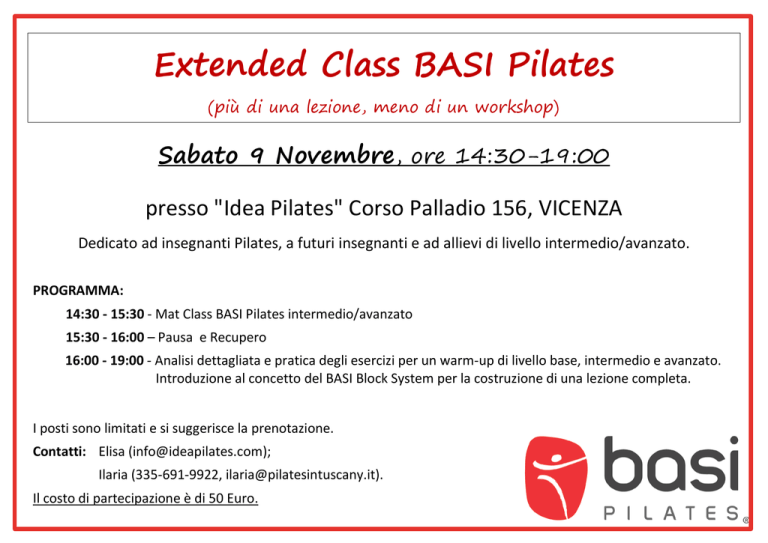Extended Class BASI Pilates (più di una lezione, meno di un workshop) Sabato 9 Novembre, ore 14:30-19:00 presso "Idea Pilates" Corso Palladio 156, VICENZA Dedicato ad insegnanti Pilates, a futuri insegnanti e ad allievi di livello intermedio/avanzato. PROGRAMMA: 14:30 - 15:30 - Mat Class BASI Pilates intermedio/avanzato 15:30 - 16:00 – Pausa e Recupero 16:00 - 19:00 - Analisi dettagliata e pratica degli esercizi per un warm-up di livello base, intermedio e avanzato. Introduzione al concetto del BASI Block System per la costruzione di una lezione completa. I posti sono limitati e si suggerisce la prenotazione. Contatti: Elisa ([email protected]); Ilaria (335-691-9922, [email protected]). Il costo di partecipazione è di 50 Euro.
