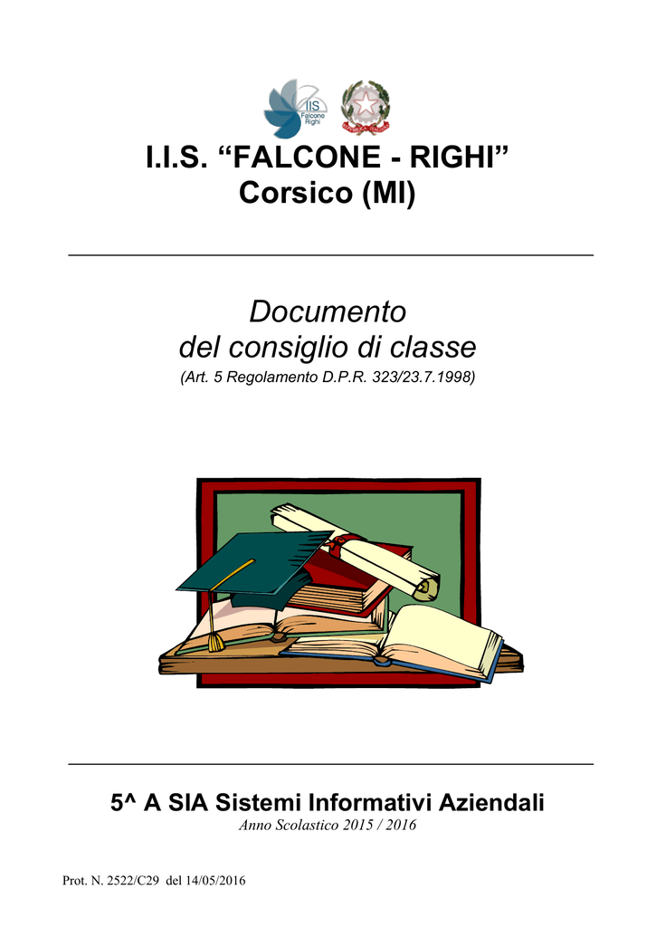 I.I.S. “FALCONE - RIGHI” Corsico (MI) Documento del consiglio di classe (Art. 5 Regolamento D.P.R. 323/23.7.1998) 5^ A SIA Sistemi Informativi Aziendali Anno Scolastico 2015 / 2016 Prot. N. 2522/C29 del 14/05/2016 Documento del Consiglio di classe – Classe 5^ A SIA a.s. 2015/2016 – IIS ” Falcone–Righi” – Corsico 5^ A SIA Sistemi Informativi Aziendali Anno Scolastico 2015 / 2016 Indice 1. PRESENTAZIONE DELLA CLASSE ....................................................................................................................3 1.1 Storia della classe .................................................................................................................................... 3 1.2 Composizione del Consiglio di Classe .................................................................................................... 3 1.3 Relazione sulla classe ............................................................................................................................. 4 1.4 Obiettivi del corso di studi ........................................................................................................................ 4 1.5 Obiettivi del Consiglio di Classe .............................................................................................................. 5 1.4 Attività di recupero ................................................................................................................................... 6 1.5 Attività integrative e di orientamento........................................................................................................ 6 1.6 Attività complementari/integrative ............................................................................................................ 7 1.7 Progetti .................................................................................................................................................... 8 1.8 Certificazioni ............................................................................................................................................ 7 2. MODALITA’ DI LAVORO DEL CONSIGLIO DI CLASSE ............................................................................. 9 2.1 Sussidi didattici ........................................................................................................................................ 9 2.2 Obiettivi di area ........................................................................................................................................ 9 2.3 Strumenti di verifica ............................................................................................................................... 10 2.4 Criteri di attribuzione del credito scolastico e del credito formativo ...................................................... 11 2.5 Criteri di valutazione P.O.F. 2014 - 2015 .............................................................................................. 12 3. PREPARAZIONE ALL’ ESAME DI STATO .........................................................................................................13 3.1 Scheda riassuntiva delle simulazioni della terza prova scritta ............................................................... 12 3.2 Tabella della corrispondenza dei voti in decimi e in quindicesimi ......................................................... 12 4. PROPOSTA PER LA VALUTAZIONE DELLE PROVE DELL’ ESAME DI STATO ..........................................13 4.1 Griglia di valutazione per la prima prova ................................................................................................ 14 4.2 Griglia di valutazione della seconda prova ............................................................................................ 15 4.3 Griglia di valutazione della terza prova.................................................................................................. 16 4.4 Griglia di valutazione per il colloquio ..................................................................................................... 17 PROGRAMMI DELLE DISCIPLINE ........................................................................................................................19 SIMULAZIONI PROVE D’ESAME ...........................................................................................................................43 Simulazione Prima Prova ............................................................................................................................. 44 Simulazione Seconda Prova ........................................................................................................................ 52 Simulazione Terza Prova .............................................................................................................................. 54 pag. 2 / 69 Documento del Consiglio di classe – Classe 5^ A SIA a.s. 2015/2016 – IIS ” Falcone–Righi” – Corsico Simulazione Terza Prova .............................................................................................................................. 61 FIRME DEL DOCUMENTO .....................................................................................................................................68 Il Consiglio di Classe .................................................................................................................................... 68 I rappresentanti degli studenti ...................................................................................................................... 69 1. PRESENTAZIONE DELLA CLASSE 1.1 Storia della classe Classe a. s. Numero iscritti 2013/14 2014/15 2015/16 Provenienti Nuovi iscritti/ anno ripetenti precedente Totale promossi 19 20 3 15 - Totale ritirati Totale respinti 17 2 15 5 Totale trasferiti 1.2 Composizione del Consiglio di Classe a Continuità didattica a a 4 5 X X Disciplina Lingua e Letteratura Italiana Docente classe quinta CAPPELL