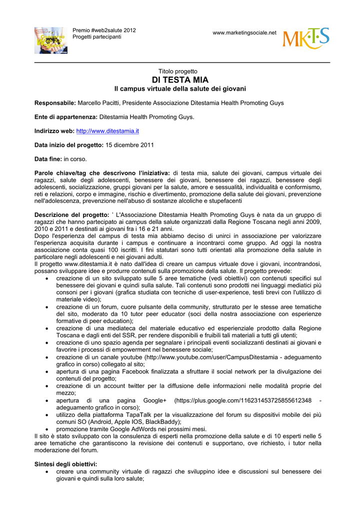 Premio #web2salute 2012 Progetti partecipanti www.marketingsociale.net Titolo progetto DI TESTA MIA Il campus virtuale della salute dei giovani Responsabile: Marcello Pacitti, Presidente Associazione Ditestamia Health Promoting Guys Ente di appartenenza: Ditestamia Health Promoting Guys. Indirizzo web: http://www.ditestamia.it Data inizio del progetto: 15 dicembre 2011 Data fine: in corso. Parole chiave/tag che descrivono l’iniziativa: di testa mia, salute dei giovani, campus virtuale dei ragazzi, salute degli adolescenti, benessere dei giovani, benessere dei ragazzi, benessere degli adolescenti, socializzazione, gruppi giovani per la salute, amore e sessualità, individualità e conformismo, reti e relazioni, corpo e immagine, rischio e divertimento, promozione della salute dei giovani, prevenzione nell'adolescenza, prevenzione nell'abuso di sostanze alcoliche e stupefacenti Descrizione del progetto: ’ L'Associazione Ditestamia Health Promoting Guys è nata da un gruppo di ragazzi che hanno partecipato ai campus della salute organizzati dalla Regione Toscana negli anni 2009, 2010 e 2011 e destinati ai giovani fra i 16 e 21 anni. Dopo l'esperienza del campus di testa mia abbiamo deciso di unirci in associazione per valorizzare l'esperienza acquisita durante i campus e continuare a incontrarci come gruppo. Ad oggi la nostra associazione conta quasi 100 iscritti. I fini statutari sono tutti orientati alla promozione della salute in particolare negli adolescenti e nei giovani adulti. Il progetto www.ditestamia.it è nato dall'idea di creare un campus virtuale dove i giovani, incontrandosi, possano sviluppare idee e produrre contenuti sulla promozione della salute. Il progetto prevede: • creazione di un sito sviluppato sulle 5 aree tematiche (vedi obiettivi) con contenuti specifici sul benessere dei giovani e quindi sulla salute. Tali contenuti sono prodotti nei linguaggi mediatici più consoni per i giovani (grafica studiata con tecniche di user-experience, testi brevi con l'utilizzo di materiale video); • creazione di un forum, cuore pulsante della community, strutturato per le stesse aree tematiche del sito, moderato da 10 tutor peer educator (soci della nostra associazione con esperienze formative di peer education); • creazione di una mediateca del materiale educativo ed esperienziale prodotto dalla Regione Toscana e dagli enti del SSR, per rendere disponibili e fruibili tali materiali a tutti gli utenti; • creazione di uno spazio agenda per segnalare i principali eventi socializzanti destinati ai giovani e favorire i processi di empowerment nel benessere sociale; • creazione di un canale youtube (http://www.youtube.com/user/CampusDitestamia - adeguamento grafico in corso) collegato al sito; • apertura di una pagina Facebook finalizzata a sfruttare il social network per la divulgazione dei contenuti del progetto; • creazione di un account twitter per la diffusione delle informazioni nelle modalità proprie del mezzo; • apertura di una pagina Google+ (https://plus.google.com/116231453725855612348 adeguamento grafico in corso); • utilizzo della piattaforma TapaTalk per la visualizzazione del forum su dispositivi mobile dei più comuni SO (Android, Apple IOS, BlackBaddy); • promozione tramite Google AdWords nei prossimi mesi. Il sito è stato sviluppato con la consulenza di esperti nella promozione della salute e di 10 esperti nelle 5 aree tematiche che garantiscono la revisione dei contenuti e supportano, ove richiesto, i tutor nella moderazione del forum. Sintesi degli obiettivi: • creare una community virtuale di ragazzi che sviluppino idee e discussioni sul benessere dei giovani e quindi sulla loro salute; • • fornire contenuti informativi sulle tematiche della salute e del benessere dei giovani in 5 aree tematiche individuate: amore e sessualità, individualità e conformismo, reti e relazioni, corpo e immagine, rischio e divertimento; sfruttare l'attività di tutor peer educator (moderatori del forum) per favorire processi educativi all'interno della community. Destinatari: Giovani, adolescenti, ragazzi del territorio toscano ed extra regionale. Partner eventualmente coinvolti: Regione Toscana (Assessorato Diritto alla Salute), le 12 Aziende Locali Territoriali Regione Toscana ed in particolare Azienda USL2 di Lucca. Risultati raggiunti (o previsti): • il sito è online dal 30 Aprile 2012; • attualmente sono iscritti al forum 84 utenti, sono state aperte 88 discussioni e postati 793 messaggi; • dal 30 aprile al 23 maggio 2012 hanno visitato il sito 442 utenti per un totale di 2010 pagine visitate con una media di 4,55 pagine/per utente; l'85% degli utenti è stato geo-localizzato in Toscana; il 7% dei visitatori è di lingua Inglese; • in un anno di attività poniamo come obiettivo il raggiungimento di 1000 iscritti al forum.