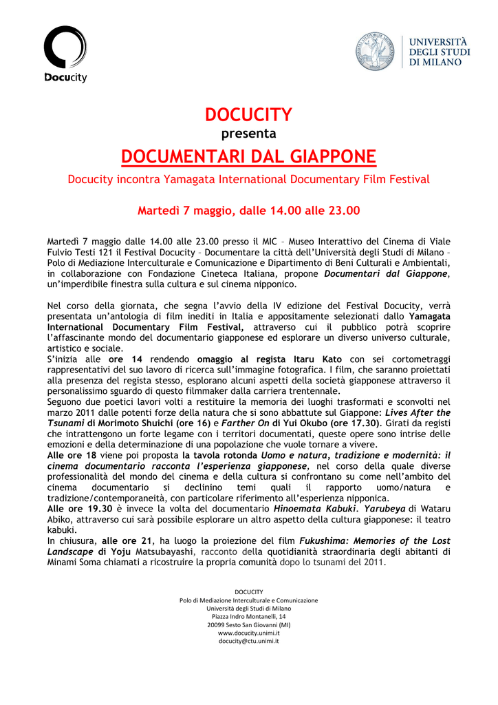 DOCUCITY presenta DOCUMENTARI DAL GIAPPONE Docucity incontra Yamagata International Documentary Film Festival Martedì 7 maggio, dalle 14.00 alle 23.00 Martedì 7 maggio dalle 14.00 alle 23.00 presso il MIC – Museo Interattivo del Cinema di Viale Fulvio Testi 121 il Festival Docucity – Documentare la città dell’Università degli Studi di Milano – Polo di Mediazione Interculturale e Comunicazione e Dipartimento di Beni Culturali e Ambientali, in collaborazione con Fondazione Cineteca Italiana, propone Documentari dal Giappone, un’imperdibile finestra sulla cultura e sul cinema nipponico. Nel corso della giornata, che segna l’avvio della IV edizione del Festival Docucity, verrà presentata un’antologia di film inediti in Italia e appositamente selezionati dallo Yamagata International Documentary Film Festival, attraverso cui il pubblico potrà scoprire l’affascinante mondo del documentario giapponese ed esplorare un diverso universo culturale, artistico e sociale. S’inizia alle ore 14 rendendo omaggio al regista Itaru Kato con sei cortometraggi rappresentativi del suo lavoro di ricerca sull’immagine fotografica. I film, che saranno proiettati alla presenza del regista stesso, esplorano alcuni aspetti della società giapponese attraverso il personalissimo sguardo di questo filmmaker dalla carriera trentennale. Seguono due poetici lavori volti a restituire la memoria dei luoghi trasformati e sconvolti nel marzo 2011 dalle potenti forze della natura che si sono abbattute sul Giappone: Lives After the Tsunami di Morimoto Shuichi (ore 16) e Farther On di Yui Okubo (ore 17.30). Girati da registi che intrattengono un forte legame con i territori documentati, queste opere sono intrise delle emozioni e della determinazione di una popolazione che vuole tornare a vivere. Alle ore 18 viene poi proposta la tavola rotonda Uomo e natura, tradizione e modernità: il cinema documentario racconta l’esperienza giapponese, nel corso della quale diverse professionalità del mondo del cinema e della cultura si confrontano su come nell’ambito del cinema documentario si declinino temi quali il rapporto uomo/natura e tradizione/contemporaneità, con particolare riferimento all’esperienza nipponica. Alle ore 19.30 è invece la volta del documentario Hinoemata Kabuki. Yarubeya di Wataru Abiko, attraverso cui sarà possibile esplorare un altro aspetto della cultura giapponese: il teatro kabuki. In chiusura, alle ore 21, ha luogo la proiezione del film Fukushima: Memories of the Lost Landscape di Yoju Matsubayashi, racconto della quotidianità straordinaria degli abitanti di Minami Soma chiamati a ricostruire la propria comunità dopo lo tsunami del 2011. DOCUCITY Polo di Mediazione Interculturale e Comunicazione Università degli Studi di Milano Piazza Indro Montanelli, 14 20099 Sesto San Giovanni (MI) www.docucity.unimi.it [email protected] Questa giornata è anche l’occasione per segnare l’avvio di un nuovo rapporto di scambio tra il festival Docucity dell’Università degli Studi di Milano e il prestigioso Yamagata International Documentary Film Festival, in Asia l’appuntamento più importante nell’ambito del cinema del reale. Schede dei film e calendario delle proiezioni Ore 14.00 OMAGGIO A ITARU KATO Sei cortometraggi rappresentativi della produzione filmica del regista e docente giapponese Itaru Kato, attraverso cui scoprire la sua peculiare concezione di cinema espressa in trent’anni di carriera come documentarista. Tra i titoli in programma, quattro opere incentrate su temi sociali che si fanno espressione della sua ricerca sulla struttura dell’immagine fotografica: Goround (1981, v.o. sott. ing.), Suspension Bridge (1983, v.o. sott. ing.), Melt Down (1988, v.o. sott. ing.) e Sparkling (1991, v.o. sott. ing.). Quest’ultimo, che guarda a come i media raccontano la Guerra del Golfo nel 1991, ha vinto il premio Retina ’91 in Ungheria. Chiudono il programma Kaiseki Cuisine (2002, v.o. sott. ing.), realizzato con l’artista Sakurai Atsushi e incentrato sulla cultura alimentare nipponica, e il più recente Blinder in Winter (2009, v.o. sott. ing.). Quest’ultimo, che è tratto dell’opera collettiva Seeing, riflette sull’atto del vedere e sui diversi strumenti che possono potenziarlo o ostacolarlo. Il regista Itaru Kato sarà presente in sala. Ore 16.00 LIVES AFTER THE TSUNAMI R.: M. Shuichi. Giappone, 74’, 2011, colore, v.o. sott. ing. Un viaggio attraverso le città di Sendai, Ishinomaki e Higashimatsushima, colpite dallo tsunami che ha devastato il Giappone nel marzo 2011. Si racconta in particolare quanto accaduto ai 108 bambini della scuola elementare Okawa Elementary School di Ishinomaki. Ore 17.30 FARTHER ON R.: Y. Okubo. Giappone, 23’, 2011, colore, v.o. sott. ing. Un poetico ritratto della città di Otsuchi, luogo duramente colpito dai tragici eventi del marzo 2011, ove il regista vive con la propria famiglia. Il film mostra come le forze della natura hanno cambiato volto a questo territorio caro al regista attraverso l’alternarsi d’immagini relative al momento del disastro, così come raccontato dai media, e di riprese da lui stesso realizzate nei giorni subito successivi alla tragedia. Ore 18.00 Tavola rotonda UOMO E NATURA, TRADIZIONE E CONTEMPORANEITÀ: IL CINEMA DOCUMENTARIO RACCONTA L’ESPERIENZA GIAPPONESE DOCUCITY Polo di Mediazione Interculturale e Comunicazione Università degli Studi di Milano Piazza Indro Montanelli, 14 20099 Sesto San Giovanni (MI) www.docucity.unimi.it [email protected] Diverse professionalità del mondo del cinema e della cultura s’incontrano per confrontarsi su come nell’ambito del cinema documentario si declinino il rapporto uomo/natura e tradizione/contemporaneità. Si riflette anche su come catturare la memoria dei luoghi attraverso la macchina da presa, con particolare riferimento all’esperienza dei registi giapponesi. Intervengono: Itaru Kato (regista e docente di cinema della Tohoku University of Art and 