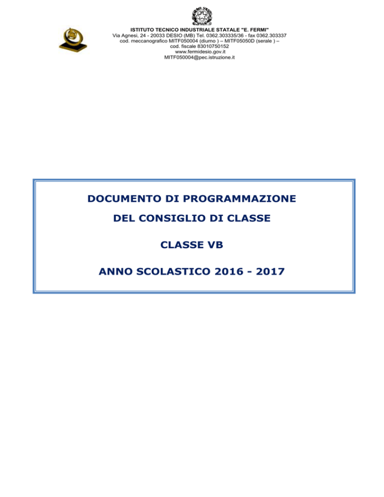 ISTITUTO TECNICO INDUSTRIALE STATALE "E. FERMI" Via Agnesi, 24 - 20033 DESIO (MB) Tel. 0362.303335/36 - fax 0362.303337 cod. meccanografico MITF050004 (diurno ) – MITF05050D (serale ) – cod. fiscale 83010750152 www.fermidesio.gov.it [email protected] DOCUMENTO DI PROGRAMMAZIONE DEL CONSIGLIO DI CLASSE CLASSE VB ANNO SCOLASTICO 2016 - 2017 ISTITUTO TECNICO INDUSTRIALE STATALE "E. FERMI" Via Agnesi, 24 - 20033 DESIO (MB) Tel. 0362.303335/36 - fax 0362.303337 cod. meccanografico MITF050004 (diurno ) – MITF05050D (serale ) – cod. fiscale 83010750152 www.fermidesio.gov.it [email protected] PARTE PRIMA Patto educativo tra Scuola-Alunni-Famiglie Per il successo scolastico degli alunni è necessaria una forte collaborazione tra la Scuola e gli Alunni e le loro Famiglie. Il Patto educativo descrive i diritti-doveri di ciascuna parte. I docenti devono: 1. illustrare con la massima chiarezza alla classe il programma che intendono seguire, esplicitandone gli obiettivi didattici, i contenuti, il tipo di prove previste, i criteri di valutazione; 2. distinguere con chiarezza tra le verifiche formative e quelle sommative (quelle classificate con i voti), mettendole sempre in relazione con gli obiettivi; 3. comunicare i voti attraverso il registro elettronico a cui la famiglia di ogni alunno ha accesso: per la prova orale, appena conclusa la prova stessa, per la prova scritta, al momento della consegna non oltre i quindici giorni lavorativi dalla prova stessa e comunque prima della prova successiva; Gli alunni devono: 4. seguire il lavoro scolastico curricolare ed integrativo con continuità, senza ritardi, assenze, negligenze; 5. essere puntuali nei compiti a casa, che vanno eseguiti nei modi e nei tempi indicati dai docenti: l’impegno è un elemento importante di valutazione; 6. partecipare attivamente al lavoro, formulando anche proposte costruttive per il buon funzionamento del lavoro in classe; I genitori devono: 7. collaborare con la Scuola, perché gli sforzi comuni abbiano un esito positivo: è necessario coltivare nei ragazzi la fiducia nella Scuola, discutendo anzitutto con i docenti gli eventuali problemi e difficoltà e curando che i ragazzi frequentino e si impegnino nel modo richiesto. ISTITUTO TECNICO INDUSTRIALE STATALE "E. FERMI" Via Agnesi, 24 - 20033 DESIO (MB) Tel. 0362.303335/36 - fax 0362.303337 cod. meccanografico MITF050004 (diurno ) – MITF05050D (serale ) – cod. fiscale 83010750152 www.fermidesio.gov.it [email protected] Obiettivi educativi del Consiglio di classe Come indicato nel PTOF del nostro Istituto, ogni Consiglio di classe individua i propri obiettivi formativi e didattici, nell’ambito delle otto competenze chiave individuate a livello europeo al cui raggiungimento collaborano in egual misura tutte le discipline. Nel rispetto di tali indicazioni europee e nazionali e per il loro conseguimento, il Consiglio di Classe della Fare clic qui per immettere testo. indica i seguenti obiettivi formativi e didattici trasversali: Obiettivi formativi trasversali 8. Rispettare le norme previste dal regolamento d’Istituto. 9. Comportarsi in modo rispettoso e responsabile nei confronti di tutti, imparando ad accettare e ad ascoltare i compagni, gli insegnanti ed il personale non docente ed a collaborare con loro. 10. Rispettare gli ambienti, gli arredi e gli strumenti didattici. Utilizzare gli strumenti di esercitazione in modo corretto, responsabile e rispondente alle indicazioni ricevute, tenendo presente che le disattenzioni possono causare anche danni gravi. 11. Affrontare con responsabilità l’impegno scolastico, anche nel rispetto delle consegne, delle scadenze e della frequenza. 12. Saper dialogare con correttezza, aprendosi ad un confronto aperto e costruttivo ed evitando di usare un linguaggio volgare o atteggiamenti arroganti. Obiettivi didattici trasversali 1. Acquisire un metodo di studio autonomo e flessibile, che consenta di condurre ricerche e approfondimenti personali, di continuare in modo efficace gli studi e di potersi aggiornare lungo l’intero arco della propria vita. 2. Sviluppare le capacità espositive: saper comunicare con chiarezza e con un linguaggio che utilizzi in modo adeguato la terminologia tipica della disciplina. 3. Sviluppare le capacità logiche: saper riconoscere le caratteristiche comuni di diverse situazioni e saper applicare in casi concreti la regola astratta. 4. Saper utilizzare le tecnologie dell’informazione e della comunicazione per studiare, fare ricerca, comunicare. ISTITUTO TECNICO INDUSTRIALE STATALE "E. FERMI" Via Agnesi, 24 - 20033 DESIO (MB) Tel. 0362.303335/36 - fax 0362.303337 cod. meccanografico MITF050004 (diurno ) – MITF05050D (serale ) – cod. fiscale 83010750152 www.fermidesio.gov.it [email protected] Metodologie Per ciò che concerne la metodologia di lavoro, si fa riferimento a quanto espresso nella programmazione delle singole discipline. Criteri di valutazione comuni Per quanto riguarda la valutazione delle singole prove scritte e orali si fa riferimento alla griglia di istituto qui allegata e a quanto contenuto nelle griglie deliberate da ciascun dipartimento. La valutazione collegiale terrà conto dei risultati oggettivi delle prove, ma sarà anche formativa e continua e non solo sommativa e finale. Si valuteranno, quindi, anche le competenze non cognitive rilevate durante le varie attività proposte. Attività di recupero Gli Insegnanti potranno attuare un recupero in itinere aperto a tutta la classe o ad un gruppo, con l’intervento dei docenti dl potenziamento, orientare gli studenti alla frequenza degli sportelli help, così come previsto nel Piano Triennale dell’ Offerta Formativa e, al termine del 1° e 2° periodo didattico, attivare dei corsi di recupero obbligatori. Attività di potenziamento Il nostro Istituto offre ai suoi studenti la possibilità di certificare le proprie competenze informatiche con il conseguimento del diploma ECDL, riconosciuto a livello internazionale. Agli allie