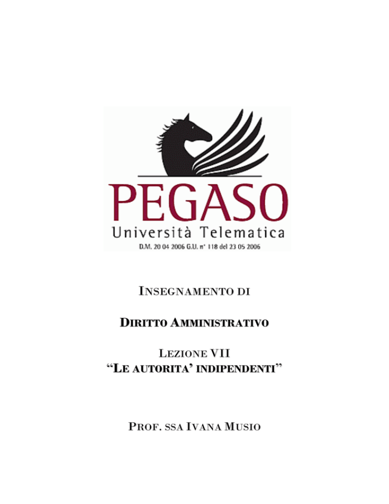 INSEGNAMENTO DI DIRITTO AMMINISTRATIVO LEZIONE VII “LE AUTORITA’ INDIPENDENTI” PROF. SSA IVANA MUSIO Diritto Amministrativo Lezione VII Indice 1 Premessa --------------------------------------------------------------------------------------------------- 3 2 Le origini --------------------------------------------------------------------------------------------------- 6 3 Caratteri delle Autorità indipendenti ---------------------------------------------------------------- 9 4 I poteri delle Autorità. In particolare la potestà regolamentare ------------------------------ 12 5 Le Autorità amministrative indipendenti. --------------------------------------------------------- 15 6 Le autorità indipendenti: natura giuridica e tutela giustiziale e giurisdizionale ---------- 21 Bibliografia ---------------------------------------------------------------------------------------------------- 24 Attenzione! Questo materiale didattico è per uso personale dello studente ed è coperto da copyright. Ne è severamente vietata la riproduzione o il riutilizzo anche parziale, ai sensi e per gli effetti della legge sul diritto d’autore (L. 22.04.1941/n. 633) 2 di 25 Diritto Amministrativo Lezione VII 1 Premessa Il presente elaborato mira ad individuare le caratteristiche generali del fenomeno delle Autorità indipendenti, sotto il profilo della loro genesi storica, della loro natura giuridica e delle peculiarità oggettive e soggettive del fenomeno rispetto alla nozione classica di pubblica amministrazione. E’ importante, per meglio comprendere il ruolo delle Autorità indipendenti, descrivere, seppure per brevi linee, l’evoluzione della pubblica amministrazione da modello piramidale ad un modello policentrico. E’ stato Montesquieu ad elaborare la nota teoria della separazioni dei poteri, che ha segnato l’inizio dello Stato moderno e che è stata ideata al fine di evitare un’eccessiva concentrazione di poteri nelle mani di pochi individui o gruppi sociali. Come è noto, secondo tale teoria le tre funzioni fondamentali vengono individuate nella legislazione (creazione delle norme), nell’amministrazione (esecuzione delle norme) e nella giurisdizione (vigilanza sulla corretta applicazione delle norme), attribuite rispettivamente al potere legislativo (Parlamento), al potere esecutivo (Governo e Pubblica Amministrazione) ed al potere giudiziario (Magistratura). In questo disegno, il potere esecutivo è legittimato dalla fiducia del Parlamento, il quale si pone in una posizione centrale, pur nella parità dei poteri. In Italia, l’affermazione della realtà politica dell’ideale montesquieano, si inizia ad attuare soltanto a partire dal 1848, in particolare con lo Statuto concesso da Carlo Alberto nel Regno di Sardegna, ma, in effetti, sono le riforme cavouriane a portare a compimento la conformazione dello Stato sabaudo al modello di montesquieano e l’oggetto fondamentale della riforma riguarda il potere esecutivo, ovvero la pubblica amministrazione. L’obiettivo di Cavour è una ristrutturazione delle strutture amministrative in modo da renderle coerenti al modello ideato da Montesque. Il risultato è una struttura piramidale, che al suo vertice vede il Ministro, legittimato dalla fiducia delle Camere, il quale è l’unico che può emanare atti (tutti i provvedimenti dell’amministrazione portano la sua firma), in quanto su di lui incombe la responsabilità politica. Corollario del principio della separazione dei poteri è, dunque, la struttura piramidale della pubblica amministrazione, che deve essere, per così dire, nella persona del Ministro responsabile; in questo modello così congegnato, non vi è posto per entità amministrative al di fuori della struttura ministeriale. Attenzione! Questo materiale didattico è per uso personale dello studente ed è coperto da copyright. Ne è severamente vietata la riproduzione o il riutilizzo anche parziale, ai sensi e per gli effetti della legge sul diritto d’autore (L. 22.04.1941/n. 633) 3 di 25 Diritto Amministrativo Lezione VII I presupposti di questo ordinamento, tuttavia, vengono meno con la fine dello Stato liberare (caratterizzato da uno suffragio censitario ridotto) e con la nascita dello Stato sociale di diritto che, soprattutto a partire dal 1912, con il suffragio universale, ha trasformato lo Stato in uno Stato a carattere popolare, ed ha determinato la frammentazione del potere politico in una pluralità di organi ed enti che si affiancano a quelli dello Stato, dando, così, vita ad un nuovo modello di amministrazione, non più di tipo gerarchico, bensì policentrico e multiorganizzato, ove aumentano i servizi pubblici e l’intervento dello Stato nell’economia. Tuttavia, anche la galassia degli enti pubblici che forma quella che è stata chiamata “l’amministrazione parallela” faceva pur sempre capo alla struttura ministeriale, in quanto ogni ente viene controllato da un Ministero competente o dal Governo che ne nomina i vertici. Con l’avvento della Costituzione, nel 1948, il decentramento, tuttavia, ha conosciuto una accelerazione ispirata al modello del pluralismo autonomistico, attraverso il riconoscimento degli enti autonomi, sganciati da un rapporto di strumentalità rispetto al referente statale. Negli anni più recenti, si verifica, parallelamente, un nuovo fenomeno; ed infatti, sotto la spinta di un’influenza riformatrice, a partire dagli anni settanta, anche in Italia, così come in altri ordinamenti maggiormente sviluppati, si è affermato il fenomeno della diffusione di Autorità costituite per lo svolgimento di funzioni pubblicistiche sostanzialmente atipiche e dotate di un particolare grado di indipendenza, sulla base di motivazioni diverse e disomogenee che, certamente, non hanno consentito l’individuazione di un ordine definitorio preciso. La penetrazione nel tessuto ordinamentale delle suddette autorità, è dovuta all’emersione di interessi e valori sostanziali rispetto ai quali gli appa