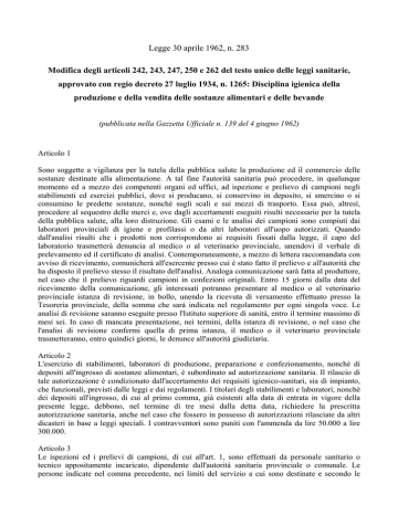 Legge 30 aprile 1962, n. 283 Modifica degli articoli 242, 243, 247, 250 e 262 del testo unico delle leggi sanitarie, approvato con regio decreto 27 luglio 1934, n. 1265: Disciplina igienica della produzione e della vendita delle sostanze alimentari e delle bevande (pubblicata nella Gazzetta Ufficiale n. 139 del 4 giugno 1962) Articolo 1 Sono soggette a vigilanza per la tutela della pubblica salute la produzione ed il commercio delle sostanze destinate alla alimentazione. A tal fine l'autorità sanitaria può procedere, in qualunque momento ed a mezzo dei competenti organi ed uffici, ad ispezione e prelievo di campioni negli stabilimenti ed esercizi pubblici, dove si producano, si conservino in deposito, si smercino o si consumino le predette sostanze, nonchè sugli scali e sui mezzi di trasporto. Essa può, altresì, procedere al sequestro delle merci e, ove dagli accertamenti eseguiti risulti necessario per la tutela della pubblica salute, alla loro distruzione. Gli esami e le analisi dei campioni sono compiuti dai laboratori provinciali di igiene e profilassi o da altri laboratori all'uopo autorizzati. Quando dall'analisi risulti che i prodotti non corrispondono ai requisiti fissati dalla legge, il capo del laboratorio trasmetterà denuncia al medico o al veterinario provinciale, unendovi il verbale di prelevamento ed il certificato di analisi. Contemporaneamente, a mezzo di lettera raccomandata con avviso di ricevimento, comunicherà all'esercente presso cui è stato fatto il prelievo e all'autorità che ha disposto il prelievo stesso il risultato dell'analisi. Analoga comunicazione sarà fatta al produttore, nel caso che il prelievo riguardi campioni in confezioni originali. Entro 15 giorni dalla data del ricevimento della comunicazione, gli interessati potranno presentare al medico o al veterinario provinciale istanza di revisione, in bollo, unendo la ricevuta di versamento effettuato presso la Tesoreria provinciale, della somma che sarà indicata nel regolamento per ogni singola voce. Le analisi di revisione saranno eseguite presso l'Istituto superiore di sanità, entro il termine massimo di mesi sei. In caso di mancata presentazione, nei termini, della istanza di revisione, o nel caso che l'analisi di revisione confermi quella di prima istanza, il medico o il veterinario provinciale trasmetteranno, entro quindici giorni, le denunce all'autorità giudiziaria. Articolo 2 L'esercizio di stabilimenti, laboratori di produzione, preparazione e confezionamento, nonchè di depositi all'ingrosso di sostanze alimentari, è subordinato ad autorizzazione sanitaria. Il rilascio di tale autorizzazione è condizionato dall'accertamento dei requisiti igienico-sanitari, sia di impianto, che funzionali, previsti dalle leggi e dai regolamenti. I titolari degli stabilimenti e laboratori, nonchè dei depositi all'ingrosso, di cui al primo comma, già esistenti alla data di entrata in vigore della presente legge, debbono, nel termine di tre mesi dalla detta data, richiedere la prescritta autorizzazione sanitaria, anche nel caso che fossero in possesso di autorizzazioni rilasciate da altri dicasteri in base a leggi speciali. I contravventori sono puniti con l'ammenda da lire 50.000 a lire 300.000. Articolo 3 Le ispezioni ed i prelievi di campioni, di cui all'art. 1, sono effettuati da personale sanitario o tecnico appositamente incaricato, dipendente dall'autorità sanitaria provinciale o comunale. Le persone indicate nel comma precedente, nei limiti del servizio a cui sono destinate e secondo le attribuzioni ad esse conferite, sono ufficiali o agenti di polizia giudiziaria e possono, in ogni caso, richiedere, ove occorra, l'assistenza della forza pubblica. Articolo 4 Chiunque produce, prepara, detiene, vende o pone in vendita sostanze destinate all'alimentazione, è tenuto a fornire gratuitamente alle persone di cui all'art. 3, i campioni delle sostanze stesse, da prelevarsi nei limiti e secondo le modalità stabilite nel regolamento. I contravventori sono puniti con l'ammenda da lire 10.000 a 100.000, salvo l'esecuzione coattiva del prelievo. Articolo 5 E' vietato impiegare nella preparazione di alimenti o bevande, vendere, detenere per vendere o somministrare come mercede ai propri dipendenti, o comunque distribuire per il consumo, sostanze alimentari: a) private anche in parte dei propri elementi nutritivi o mescolate a sostanze di qualità inferiori o comunque trattate in modo da variarne la composizione naturale, salvo quanto disposto da leggi e regolamenti speciali; b) in cattivo stato di conservazione; c) con cariche microbiche superiori ai limiti che saranno stabiliti dal regolamento di esecuzione o da ordinanze ministeriali; d) insudiciate, invase da parassiti, in stato di alterazione o comunque nocive, ovvero sottoposte a lavorazioni o trattamenti diretti a mascherare un preesistente stato di alterazione; e) adulterate, contraffatte o non rispondenti per natura, sostanza o qualità alla denominazione con cui sono designate o sono richieste; f) colorate artificialmente quando la colorazione artificiale non sia autorizzata o, nel caso che sia autorizzata, senza l'osservanza delle norme prescritte e senza l'indicazione a caratteri chiari e ben leggibili, della colorazione stessa. Questa indicazione, se non espressamente prescritta da norme speciali, potrà essere omessa quando la colorazione è effettuata mediante caramello, infuso di truciolo di quercia, enocianina od altri colori naturali consentiti; g) con aggiunta di additivi chimici di qualsiasi natura non autorizzati con decreto del Ministro per la sanità o, nel caso che siano stati autorizzati, senza l'osservanza delle norme prescritte per il loro impiego. I decreti di autorizzazione sono soggetti a revisioni annuali; h) che contengano residui di prodotti, usati in agricoltura per la protezione delle piante e a difesa delle sostanze alimentari immagazzinate, tossici per l'uomo. Il Ministro per la sanità, con propria ordinanza, stabilisc