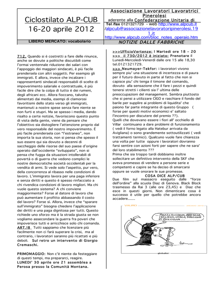 Ciclostilato ALP-CUB 16-20 aprile 2012 LIBERO MERCATO: vocabolario 712. Quando si è costretti a fare delle rinunce, anche se dovute a politiche discutibili come l’ormai ventennale riduzione dei salari con l’appoggio dei maggiori sindacati, è più facile prendersela con altri soggetti. Per esempio gli immigrati. E allora, invece che incalzare i rappresentanti sindacali responsabili di scelte di impoverimento salariale e contrattuale, è più facile dire che la colpa di tutto è dei rumeni, degli africani ecc. Allora fioccano, talvolta alimentati dai media, esempi di clamorosi favoritismi dello stato verso gli immigrati, mantenuti a nostre spese senza fare niente se non furti e stupri. Ma se spesso i media, dando risalto a certe notizie, favoriscono questo punto di vista della gente, viene da pensare che l’obiettivo sia distogliere l’attenzione proprio dal vero responsabile del nostro impoverimento. È più facile prendersela con “l’estraneo”, non importa la sua storia, non si pensa che spesso il suo essere qui sia dovuto a decenni di saccheggio delle risorse del suo paese d’origine operato dall’occidente “sviluppato”, non si pensa che fugga da situazioni intollerabili di povertà o di guerra che vedono complici le nostre democratiche società occidentali per la vendita di armi. Si vede solo l’aspetto, pur vero, della concorrenza al ribasso nelle condizioni di lavoro. L’immigrato lavora per una paga inferiore e senza diritti e questo è spesso rinfacciato a chi rivendica condizioni di lavoro migliori. Ma chi vuole questo sistema? A chi conviene maggiormente? Forse al datore di lavoro che può aumentare il profitto abbassando il costo del lavoro? Forse sì. Allora, invece che “sparare sull’immigrato” bisogna chiedere l’applicazione dei diritti e una paga dignitosa per tutti. Questo richiede uno sforzo ma è la strada giusta se non vogliamo assecondare la guerra fra poveri che impoverisce tutti e arricchisce solo chi comanda. ART.!8 Tutti sappiamo che licenziare più facilmente non ci farà superare la crisi, ma al contrario, i lavoratori saranno più ricattati e più deboli. Sul retro un intervento di Giorgio Cremaschi. PRIMOMAGGIO: Non c'è niente da festeggiare di questi tempi, ma prepararci, reagire. LUNEDI' 30 aprile ore 21 assemblea a Perosa presso la Comunità Montana. Associazione Lavoratori Lavoratrici Pinerolesi aderente alla Confederazione Unitaria di Tel /fax 0121321729 Base - web http://www.alpcub.it Via Bignone, 89 Pinerolo (TO) /[email protected] 1.it http://www.alpcub.com/bloc_notes_operaio.htm NOTIZIE DALLE FABBRICHE >>>UfficioVertenze: l Martedi ore 18 – 20 >>> il 730/2012 è iniziato: Prenotare il Lunedì-Mercoledì-Venerdì dalle ore 15 alle 18,30 tel.0121321729. >>> Neumayer-Tekfor: i lavoratori vivono sempre piu' una situazione di incertezza e di paura per il futuro dovuto in parte al fatto che non si capisce piu' chi tenga il timone del comando, dovuto alla sensazione che il fare i pezzi e quindi tenersi stretti i cilienti sia l' ultima delle preoccupazioni del management. Sembra piuttosto che si pensi a utilizzare CIGO e raschiare il fondo del barile per supplire ai problemi di liquidita' che paiono far parte integrante di questo Gruppo ( forse per questi motivi economici e' saltato l'incontro per discutere del premio ??). Quelli che dovevano essere i fiori all' occhiello di Villar continuano a dare problemi di funzionamento ( vedi il forno legato alla Hatebur arrivata da Avigliana) o sono grandemente sottoutilizzati ( vedi trattamenti termici). Qualcuno vuole fare chiarezza una volta per tutte oppure i lavoratori dovranno farsi sentire con azioni forti per sapere che ne sara' del loro stabilimento ??? Prima che sia troppo tardi dobbiamo inoltre sollecitare un definitivo intervento della SKF che aveva promesso di vendere a persone serie e competenti e capire se ha deciso di smarcarsi oppure se vuole onorare le sue promesse. COSA DICE ALP/CUB Due film sul massacro eseguito dalle “forze dell'ordine” alla scuola Diaz di Genova. Black Block trasmesso da Rai 3 (alle ore 23,45) e Diaz che esce in questi giorni. Non dimenticare cosa è successo è utile per quello che potrebbe ancora accadere....... ART.18: Un pasticciaccio brutto di regime Ancora una volta quello che fa più disgusto è il regime politico informativo che canta vittoria senza spiegare nulla. Da un lato il Presidente del Consiglio che dichiara entusiasta che con questo provvedimento è più facile licenziare e che le aziende non hanno più alibi. Dall’altro il Partito democratico che canta vittoria perché ha tutelato i lavoratori. Cisl e Uil, che avevano già approvato il precedente provvedimento, ora dicono che va bene questo. La Cgil aspetta i testi, come se le dichiarazioni dei ministri non valessero nulla. In questo insopportabile teatrino si esalta il successo italiano, mentre lo spread risale e le condizioni sociali delle famiglie precipitano. Tutto questo è solo la dimostrazione che non solo l’Italia non sta uscendo dalla crisi, m a per colpa della sua classe dirigente vi sta precipitando con più velocità di prim a. Vediamo testardamente il merito. Con l’attuale articolo 18 se un lavoratore viene licenziato ingiustamente, e questa ingiustizia è riconosciuta da un giudice, il lavoratore vittima ritorna a lavoro con la reintegra. Cosa succederà se passa questa nuova legge? Che si creerà una vasta zona grigia di lavoratori la cui ingiustizia nel licenziamento è sufficiente per ottenere un piccolo indennizzo, ma non tale da garantire la reintegra. E’ la stessa zona grigia che si è creata per gli esodati, troppo vecchi per lavorare e troppo giovani per andare in pensione. Anche con la controriforma delle pensioni ci fu lo stesso coro, nessuno si accorse del disastro che si preparava e adesso non sanno ancora i numeri di chi è stato vittima del massacro. La sostanza del provvedimento è che l’articolo 18 viene scardinato, rendendo la reintegra nel