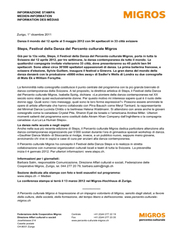 INFORMAZIONE STAMPA MEDIEN-INFORMATION INFORMATION DES MÉDIAS Zurigo, 1° dicembre 2011 Danza il mondo dal 12 aprile al 5 maggio 2012 con 94 spettacoli in 33 città svizzere Steps, Festival della Danza del Percento culturale Migros Già per la 13a volta, Steps, il Festival della Danza del Percento culturale Migros, porta in tutta la Svizzera dal 12 aprile 2012, per tre settimane, la danza contemporanea da tutto il mondo. Le quattordici compagnie invitate visiteranno 33 città, dove presenteranno su 45 palchi ben 94 spettacoli. Sono attesi circa 30’000 spettatori appassionati di danza. La prima ballerina francese, e svizzera d’elezione, Sylvie Guillem, inaugura il festival a Ginevra. La gran dama del mondo della danza danzerà con la produzione «6000 miles away» di Sadler’s Wells di Londra su due coreografie di Mats Ek e William Forsythe. La femminilità nella coreografia costituisce il punto centrale del programma con la più grande biennale di danza contemporanea della Svizzera. A tal proposito, la direttrice artistica di Steps, il Festival della Danza del Percento culturale Migros, Isabella Spirig, dichiara: «Le pioniere della danza contemporanea nel XX secolo sono state quasi esclusivamente donne. Per questo motivo mi interessa sapere qual è il ruolo delle donne oggi. Quali sono i loro messaggi, quali sono le loro forme espressive?» Possono essere ammirate le opere di artiste affermate che hanno collaborato con Pina Bausch come Meryl Tankard, la rappresentante del Minimal Dance Lucinda Childs o la berlinese Helena Waldmann. Si attendono con ansia anche le giovani coreografe come la canadese Crystal Pite, Sharon Eyal da Israele o l’americana Andrea Miller. Ulteriori momenti salienti del programma sono costituiti dalla Akram Khan Company dall’Inghilterra o la compagnia canadese «La La La Human Steps». La danza nelle scuole e negli ospizi Anche nella sua più recente edizione di Steps, il Percento culturale Migros dedica particolare attenzione alla danza contemporanea organizzando per 5’000 scolari durante l’ora di ginnastica speciali workshop di danza. «Gauthier Dance Mobil» di Stoccarda si rivolge, invece, a un pubblico nuovo, seppure meno giovane, avvicinando chi vive in ospizi e case di cura per anziani alla danza contemporanea. Il Percento culturale Migros ha concepito il Festival della Danza Steps e lo realizza in stretta collaborazione con numerosi organizzatori culturali locali e teatri di tutta la Svizzera. La prevendita inizia il 4 gennaio 2012. Per ulteriori informazioni: www.steps.ch. Informazioni per i giornalisti: Barbara Salm, responsabile Comunicazione, Direzione Affari culturali e sociali, Federazione delle Cooperative Migros, Zurigo, tel. 044 277 20 79, [email protected] Sezione dedicata alla stampa con foto e testi esaustivi sul programma: www.steps.ch -> Medien La conferenza stampa si terrà il 13 marzo 2012 nel Migros-Hochhaus di Zurigo. *************** Il Percento culturale Migros è l’espressione di un impegno volontario di Migros, sancito dagli statuti, a favore della cultura, della società, della formazione, del tempo libero e dell'economia. www.percento-culturalemigros.ch Federazione delle Cooperative Migros Direzione Affari culturali e sociali Josefstrasse 214 Casella postale CH-8031 Zurigo Centrale +41 (0)44 277 22 19 Fax +41 (0)44 277 23 35 www.percento-culturale-migros.ch INFORMAZIONE STAMPA MEDIEN-INFORMATION INFORMATION DES MÉDIAS Le quattordici compagnie di Steps, il Festival della Danza del Percento culturale Migros Sylvie Guillem / Sadler’s Wells Londra, Inghilterra 6000 miles away, coreografia: Mats Ek, William Forsythe, Jiří Kylián Akram Khan Company, Inghilterra Vertical Road, coreografia: Akram Khan La La La Human Steps, Montreal, Canada New Work, coreografia: Édouard Lock Gauthier Dance am Theaterhaus Stuttgart, Germania Poppea/Poppea, coreografia: Christian Spuck Meryl Tankard, Sydney, Australia The Oracle, coreografia: Meryl Tankard Sharon Eyal for Carte Blanche – the Norwegian National Company of Contemporary Dance Corps de Walk, coreografia: Sharon Eyal Bern:Ballett, Svizzera Lions, Tigers, and Women…, coreografia: Cathy Marston, Andrea Miller Conny Janssen Danst, Rotterdam, Paesi Bassi Rumors, coreografia: Conny Janssen Ballet National de Marseille, Francia Tempo Vicino, Le Trouble de Narcisse, Organizing Demons, coreografia: Lucinda Childs, Frédéric Flamand, Emanuel Gat Helena Waldmann, Germania GlückStück, coreografia: Helena Waldmann Sabine Kupferberg & Michael Schumacher, L’Aia, Paesi Bassi Queen Lear, coreografia: Michael Schumacher & Sabine Kupferberg Kidd Pivot Frankfurt a.M., Canada/Germania Dark Matters, coreografia: Crystal Pite OONA project / Marisa Godoy, Svizzera All Is You, coreografia: Marisa Godoy Introdans Ensemble for Youth, Arnhem, Paesi Bassi Funny Faces, coreografia: div. I 45 palchi Steps: Altdorf, Teatro di Uri Baden, Kurtheater Basilea, Teatro di Basilea Basilea, Kaserne Berna, Teatro comunale di Berna Berna, Vidmarhallen Berna, Dampfzentrale Birsfelden, Theater Roxy Briga, Armeria Kultur Coira, Teatro di Coira Lörrach (D), Burghof Lucerna, Luzerner Theater Olten, Schützi Sciaffusa, Teatro comunale Schaan (FL) TAK, Theater am Kirchplatz Steckborn, Teatro Phönix San Gallo, Lokremise Thun, KKThun Winterthur, Teatro di Winterthur Winterthur, Theater am Gleis Zugo, Chollerhalle Zugo, Casino Theater Zug Federazione delle Cooperative Migros Direzione Affari culturali e sociali Josefstrasse 214 Casella postale CH-8031 Zurigo Zurigo, Gessnerallee Zurigo, Schauspielhaus Zurigo, Theater 11 Zurigo, Theater der Künste Annemasse (F), Château Rouge Bienne, Teatro Palace Bulle, CO2 Delémont, Salle St. Georges Divonne (F), l’Esplanade du Lac Friborgo, Equilibre Friborgo, Nuithonie Ginvera, BFM Ginevra, Salle des Eaux-Vives Meyrin, Forum Meyrin Monthey, Théâtre du Crochetan Moutier, Salle Chantemerle Neuchâtel, Théâtre du Passage Neuchâtel, Espace Danse Pully, Théâtre de l’Oc