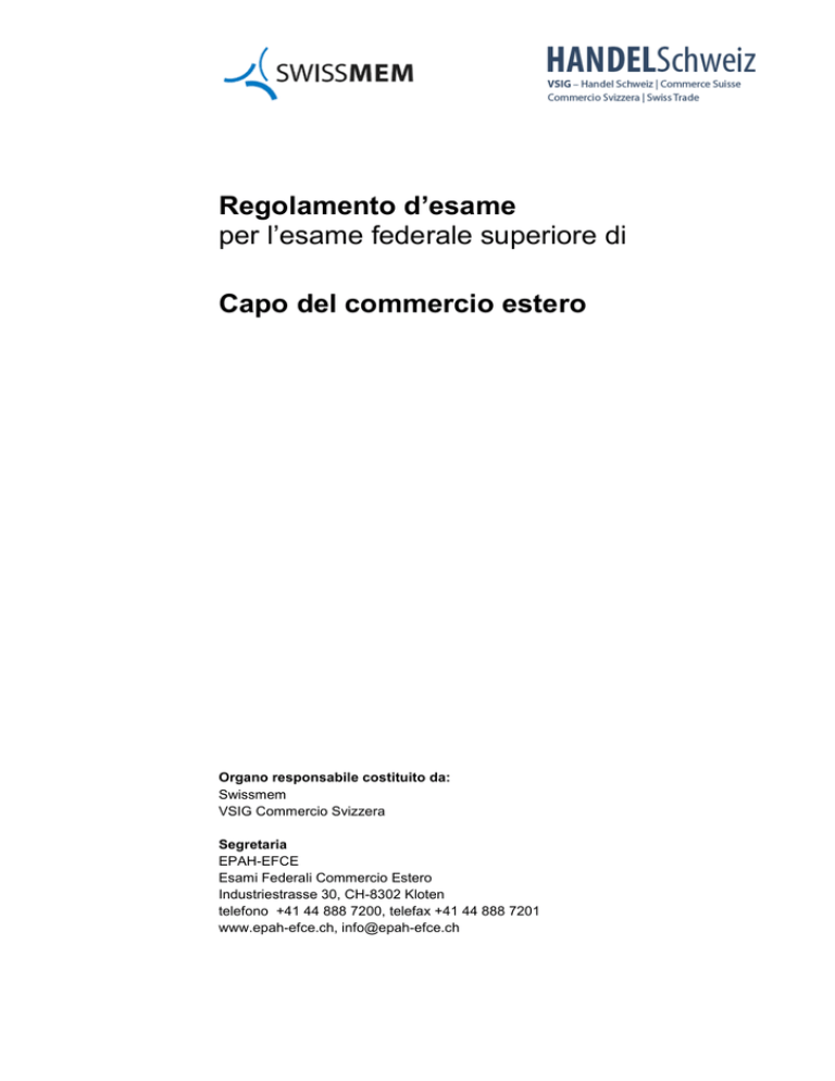 Regolamento d’esame per l’esame federale superiore di Capo del commercio estero Organo responsabile costituito da: Swissmem VSIG Commercio Svizzera Segretaria EPAH-EFCE Esami Federali Commercio Estero Industriestrasse 30, CH-8302 Kloten telefono +41 44 888 7200, telefax +41 44 888 7201 www.epah-efce.ch, [email protected] Esame professionale superiore capo del commercio estero Sommario 1 Disposizioni generali .................................................................................................... 3 1.1 1.2 Scopo dell’esame ................................................................................................. 3 Organo responsabile ............................................................................................ 4 2 Organizzazione ............................................................................................................. 4 2.1 2.2 2.3 Composizione della commissione d'esame ......................................................... 4 Compiti della commissione d'esame .................................................................... 4 Notifica al pubblico / vigilanza .............................................................................. 4 3 Pubblicazione, iscrizione, ammissione, spese .......................................................... 5 3.1 3.2 3.3 3.4 Pubblicazione ....................................................................................................... 5 Iscrizione .............................................................................................................. 5 Ammissione .......................................................................................................... 5 Spese ................................................................................................................... 6 4 Svolgimento dell’esame ............................................................................................... 6 4.1 4.2 4.3 4.4 4.5 Convocazione ....................................................................................................... 6 Ritiro ..................................................................................................................... 6 Mancata ammissione ed esclusione .................................................................... 7 Sorveglianza degli esami, periti ........................................................................... 7 Riunione conclusiva per l’attribuzione delle note ................................................. 7 5 Esame ............................................................................................................................ 8 5.1 5.2 Parti dell’esame .................................................................................................... 8 Esigenze d'esame ................................................................................................ 8 6 Valutazione e note ........................................................................................................ 8 6.1 6.2 6.3 6.4 6.5 Disposizioni generali ............................................................................................ 8 Valutazione ........................................................................................................... 8 Valore delle note .................................................................................................. 9 Condizioni per il superamento dell’esame e per il rilascio del diploma ................ 9 Ripetizione ............................................................................................................ 9 7 Diploma, titolo e procedura ....................................................................................... 10 7.1 7.2 7.3 Titolo e pubblicazione......................................................................................... 10 Ritiro del diploma................................................................................................ 10 Rimedi giuridici ................................................................................................... 10 8 Copertura delle spese d'esame ................................................................................. 10 9 Disposizioni finali ....................................................................................................... 11 9.1 9.2 9.3 9.4 Abrogazione del diritto previgente ...................................................................... 11 Umwandlung von Titeln nach bisherigen Rechts ............................................... 11 Disposizioni transitorie ....................................................................................... 11 Entrata in vigore ................................................................................................. 11 10 Emissione e approvazione ........................................................................................ 12 2 Esame professionale superiore capo del commercio estero Visto l’articolo 28 capoverso 2 della legge federale del 13 dicembre 2002 sulla formazione professionale, l’organo responsabile di cui al punto 1.2 emana il seguente regolamento d’esame: 1 Disposizioni generali 1.1 Scopo dell’esame L'esame professionale superiore ha lo scopo di valutare le competenze del capo del commercio estero. In tal modo si garantisce che questa specifica e complessa professione venga esercitata in modo unitario e a un elevato livello di qualità. Campo di lavoro e contesto I capi del commercio estero diplomati dispongono delle competenze necessarie per assumere compiti impegnativi e complessi di pianificazione, gestione, controllo, comunicazione e informazione nonché incarichi specializzati nel mondo del lavoro del commercio estero. Essi lavorano in aziende di commercio, servizi e produzione che operano a livello internazionale. Assumono sia una funzione dirigenziale a un livello quadro superiore sia la responsabilità generale delle prestazion