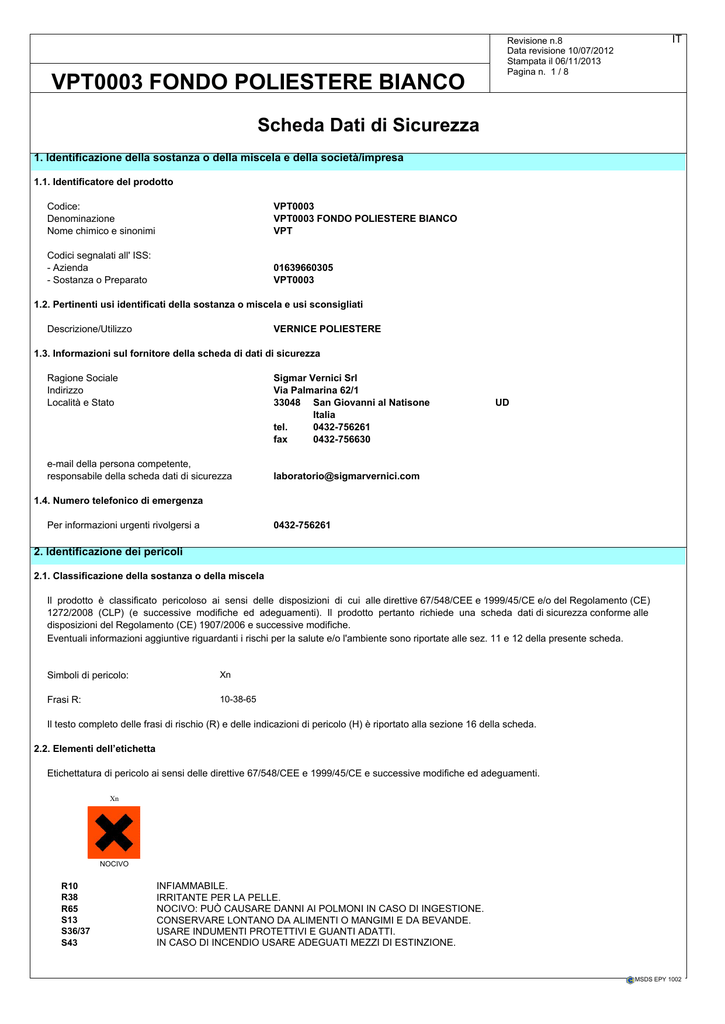 VPT0003 FONDO POLIESTERE BIANCO IT Revisione n.8 Data revisione 10/07/2012 Stampata il 06/11/2013 Pagina n. 1 / 8 Scheda Dati di Sicurezza 1. Identificazione della sostanza o della miscela e della società/impresa 1.1. Identificatore del prodotto Codice: Denominazione Nome chimico e sinonimi VPT0003 VPT0003 FONDO POLIESTERE BIANCO VPT Codici segnalati all' ISS: - Azienda - Sostanza o Preparato 01639660305 VPT0003 1.2. Pertinenti usi identificati della sostanza o miscela e usi sconsigliati Descrizione/Utilizzo VERNICE POLIESTERE 1.3. Informazioni sul fornitore della scheda di dati di sicurezza Ragione Sociale Indirizzo Località e Stato Sigmar Vernici Srl Via Palmarina 62/1 33048 San Giovanni al Natisone Italia tel. 0432-756261 fax 0432-756630 e-mail della persona competente, responsabile della scheda dati di sicurezza UD [email protected] 1.4. Numero telefonico di emergenza Per informazioni urgenti rivolgersi a 0432-756261 2. Identificazione dei pericoli 2.1. Classificazione della sostanza o della miscela Il prodotto è classificato pericoloso ai sensi delle disposizioni di cui alle direttive 67/548/CEE e 1999/45/CE e/o del Regolamento (CE) 1272/2008 (CLP) (e successive modifiche ed adeguamenti). Il prodotto pertanto richiede una scheda dati di sicurezza conforme alle disposizioni del Regolamento (CE) 1907/2006 e successive modifiche. Eventuali informazioni aggiuntive riguardanti i rischi per la salute e/o l'ambiente sono riportate alle sez. 11 e 12 della presente scheda. Simboli di pericolo: Xn Frasi R: 10-38-65 Il testo completo delle frasi di rischio (R) e delle indicazioni di pericolo (H) è riportato alla sezione 16 della scheda. 2.2. Elementi dell’etichetta Etichettatura di pericolo ai sensi delle direttive 67/548/CEE e 1999/45/CE e successive modifiche ed adeguamenti. Xn NOCIVO R10 R38 R65 S13 S36/37 S43 INFIAMMABILE. IRRITANTE PER LA PELLE. NOCIVO: PUÒ CAUSARE DANNI AI POLMONI IN CASO DI INGESTIONE. CONSERVARE LONTANO DA ALIMENTI O MANGIMI E DA BEVANDE. USARE INDUMENTI PROTETTIVI E GUANTI ADATTI. IN CASO DI INCENDIO USARE ADEGUATI MEZZI DI ESTINZIONE. MSDS EPY 1002 VPT0003 FONDO POLIESTERE BIANCO IT Revisione n.8 Data revisione 10/07/2012 Stampata il 06/11/2013 Pagina n. 2 / 8 IN CASO DI INGESTIONE NON PROVOCARE IL VOMITO: CONSULTARE IMMEDIATAMENTE IL MEDICO E MOSTRARGLI IL CONTENITORE O L'ETICHETTA. S62 Contiene: STIRENE RAGIA MINERALE 2.3. Altri pericoli Informazioni non disponibili 3. Composizione/informazioni sugli ingredienti 3.1. Sostanze Informazione non pertinente 3.2. Miscele Contiene: Identificazione STIRENE CAS CE INDEX Nr. Reg. Conc. % 100-42-5 18 - 20 202-851-5 601-026-00-0 01-2119457861-32 TOLUENE CAS 108-88-3 3,40 - 4 CE 203-625-9 INDEX 601-021-00-3 RAGIA MINERALE CAS 8052-41-3 0,40 - 0,45 CE 232-489-3 INDEX 649-345-00-4 Classificazione 67/548/CEE Classificazione 1272/2008 (CLP) Xn R20, Xn R65, Xi R36/37/38, R10, Nota D Flam. Liq. 3 H226, Asp. Tox. 1 H304, Skin Irrit. 2 H315, Eye Irrit. 2 H319, Acute Tox. 4 H332, STOT SE 3 H335, Nota D Xn R48/20, Xn R63, Xn R65, Xi R38, R67, F R11, Repr.Cat. 3 Flam. Liq. 2 H225, Asp. Tox. 1 H304, Skin Irrit. 2 H315, STOT SE 3 H336, Repr. 2 H361d, STOT RE 2 H373 Xn R65, Nota H P Asp. Tox. 1 H304, Nota H P Xn= NOCIVO,Xi= IRRITANTE,F= FACILMENTE INFIAMMABILE Il testo completo delle frasi di rischio (R) e delle indicazioni di pericolo (H) è riportato alla sezione 16 della scheda. 4. Misure di primo soccorso 4.1. Descrizione delle misure di primo soccorso OCCHI: lavare immediatamente ed abbondantemente con acqua per almeno 15 minuti. Consultare immediatamente un medico. PELLE: lavarsi immediatamente ed abbondantemente con acqua. Togliersi di dosso gli abiti contaminati. Se l'irritazione persiste, consultare il medico. Lavare gli indumenti contaminati prima di riutilizzarli. INALAZIONE: portare il soggetto all'aria aperta. Se la respirazione è difficoltosa, consultare immediatamente il medico. INGESTIONE: consultare immediatamente il medico. Indurre il vomito solo su indicazione del medico. Non somministrare nulla per via orale se il soggetto è incosciente e se non autorizzati dal medico. 4.2. Principali sintomi ed effetti, sia acuti che ritardati Per sintomi ed effetti dovuti alle sostanze contenute vedere al cap. 11. 4.3. Indicazione dell’eventuale necessità di consultare immediatamente un medico e trattamenti speciali Seguire le indicazioni del medico. 5. Misure antincendio 5.1. Mezzi di estinzione MEZZI DI ESTINZIONE IDONEI I mezzi di estinzione sono anidride carbonica, schiuma, polvere chimica. Per le perdite e sversamenti del prodotto che non si sono incendiati, l'acqua nebulizzata può essere utilizzata per disperdere i vapori infiammabili e proteggere le persone impegnate a fermare la perdita. MEZZI DI ESTINZIONE NON IDONEI MSDS EPY 1002 VPT0003 FONDO POLIESTERE BIANCO IT Revisione n.8 Data revisione 10/07/2012 Stampata il 06/11/2013 Pagina n. 3 / 8 Non usare getti d'acqua. L'acqua non è efficace per estinguere l'incendio tuttavia può essere utilizzata per raffreddare i contenitori chiusi esposti alla fiamma prevenendo scoppi ed esplosioni. 5.2. Pericoli speciali derivanti dalla sostanza o dalla miscela PERICOLI DOVUTI ALL'ESPOSIZIONE IN CASO DI INCENDIO Si può creare sovrapressione nei contenitori esposti al fuoco con pericolo di esplosione. Evitare di respirare i prodotti di combustione (ossidi di carbonio, prodotti di pirolisi tossici, ecc.). 5.3. Raccomandazioni per gli addetti all’estinzione degli incendi INFORMAZIONI GENERALI Raffreddare con getti d'acqua i contenitori per evitare la decomposizione del prodotto e lo sviluppo di sostanze potenzialmente pericolose per la salute. Indossare sempre l'equipaggiamento completo di protezione antincendio. Raccogliere le acque di spegnimento che non devono essere scaricate nelle fognature. Smaltire l'acqua contaminata ed il residuo dell'incendio secondo le norme vigenti. EQUIPAGGIAMENTO Elmetto protettivo con visiera, indumenti ignifughi (giacca e pantaloni ignifughi co