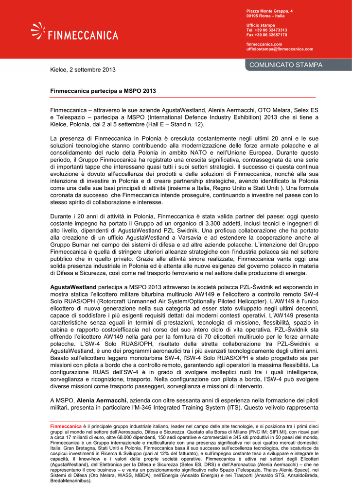 Piazza Monte Grappa, 4 00195 Roma – Italia Ufficio stampa Tel. +39 06 32473313 Fax +39 06 32657170 finmeccanica.com [email protected] Kielce, 2 settembre 2013 COMUNICATO STAMPA Finmeccanica partecipa a MSPO 2013 Finmeccanica – attraverso le sue aziende AgustaWestland, Alenia Aermacchi, OTO Melara, Selex ES e Telespazio – partecipa a MSPO (International Defence Industry Exhibition) 2013 che si tiene a Kielce, Polonia, dal 2 al 5 settembre (Hall E – Stand n. 12). La presenza di Finmeccanica in Polonia è cresciuta costantemente negli ultimi 20 anni e le sue soluzioni tecnologiche stanno contribuendo alla modernizzazione delle forze armate polacche e al consolidamento del ruolo della Polonia in ambito NATO e nell’Unione Europea. Durante questo periodo, il Gruppo Finmeccanica ha registrato una crescita significativa, contrassegnata da una serie di importanti tappe che interessano quasi tutti i suoi settori strategici. Il successo di questa continua evoluzione è dovuto all’eccellenza dei prodotti e delle soluzioni di Finmeccanica, nonché alla sua intenzione di investire in Polonia e di creare partnership strategiche, avendo identificato la Polonia come una delle sue basi principali di attività (insieme a Italia, Regno Unito e Stati Uniti ). Una formula coronata da successo che Finmeccanica intende proseguire, continuando a investire nel paese con lo stesso spirito di collaborazione e interesse. Durante i 20 anni di attività in Polonia, Finmeccanica è stata valida partner del paese: oggi questo costante impegno ha portato il Gruppo ad un organico di 3.300 addetti, inclusi tecnici e ingegneri di alto livello, dipendenti di AgustaWestland PZL Swidnik. Una proficua collaborazione che ha portato alla creazione di un ufficio AgustaWestland a Varsavia e ad estendere la cooperazione anche al Gruppo Bumar nel campo dei sistemi di difesa e ad altre aziende polacche. L’intenzione del Gruppo Finmeccanica è quella di stringere ulteriori alleanze strategiche con l’industria polacca sia nel settore pubblico che in quello privato. Grazie alle attività sinora realizzate, Finmeccanica vanta oggi una solida presenza industriale in Polonia ed è attenta alle nuove esigenze del governo polacco in materia di Difesa e Sicurezza, così come nel trasporto ferroviario e nel settore della produzione di energia. AgustaWestland partecipa a MSPO 2013 attraverso la società polacca PZL-Świdnik ed esponendo in mostra statica l’elicottero militare biturbina multiruolo AW149 e l’elicottero a controllo remoto SW-4 Solo RUAS/OPH (Rotorcraft Unmanned Air System/Optionally Piloted Helicopter). L’AW149 è l’unico elicottero di nuova generazione nella sua categoria ad esser stato sviluppato negli ultimi decenni, capace di soddisfare i più esigenti requisiti dettati dai moderni contesti operativi. L’AW149 presenta caratteristiche senza eguali in termini di prestazioni, tecnologia di missione, flessibilità, spazio in cabina e rapporto costo/efficacia nel corso del suo intero ciclo di vita operativa. PZL-Świdnik sta offrendo l’elicottero AW149 nella gara per la fornitura di 70 elicotteri multiruolo per le forze armate polacche. L’SW-4 Solo RUAS/OPH, risultato della stretta collaborazione tra PZL-Świdnik e AgustaWestland, è uno dei programmi aeronautici tra i più avanzati tecnologicamente degli ultimi anni. Basato sull’elicottero leggero monoturbina SW-4, l’SW-4 Solo RUAS/OPH è stato progettato sia per missioni con pilota a bordo che a controllo remoto, garantendo agli operatori la massima flessibilità. La configurazione RUAS dell’SW-4 è in grado di svolgere molteplici ruoli tra i quali intelligence, sorveglianza e ricognizione, trasporto. Nella configurazione con pilota a bordo, l’SW-4 può svolgere diverse missioni come trasporto passeggeri, sorveglianza e missioni di intervento. A MSPO, Alenia Aermacchi, azienda con oltre sessanta anni di esperienza nella formazione dei piloti militari, presenta in particolare l'M-346 Integrated Training System (ITS). Questo velivolo rappresenta Finmeccanica è il principale gruppo industriale italiano, leader nel campo delle alte tecnologie, e si posiziona tra i primi dieci gruppi al mondo nel settore dell’Aerospazio, Difesa e Sicurezza. Quotato alla Borsa di Milano (FNC IM; SIFI.MI), con ricavi pari a circa 17 miliardi di euro, oltre 68.000 dipendenti, 150 sedi operative e commerciali e 345 siti produttivi in 50 paesi del mondo, Finmeccanica è un Gruppo internazionale e multiculturale con una presenza significativa nei suoi quattro mercati domestici: Italia, Gran Bretagna, Stati Uniti e Polonia. Finmeccanica basa il suo successo sull’eccellenza tecnologica, che scaturisce da cospicui investimenti in Ricerca & Sviluppo (pari al 12% del fatturato), e sull’impegno costante teso a sviluppare e integrare le capacità, il know-how e i valori delle proprie società operative. Finmeccanica è attiva nei settori degli Elicotteri (AgustaWestland), dell’Elettronica per la Difesa e Sicurezza (Selex ES, DRS) e dell’Aeronautica (Alenia Aermacchi) – che ne rappresentano il core business – e vanta un posizionamento significativo nello Spazio (Telespazio, Thales Alenia Space), nei Sistemi di Difesa (Oto Melara, WASS, MBDA), nell’Energia (Ansaldo Energia) e nei Trasporti (Ansaldo STS, AnsaldoBreda, BredaMenarinibus). COMUNICATO STAMPA la nuova generazione di Advanced / Lead-In Fighter Trainer offerta sul mercato ed è progettato per ottenere il massimo livello di costo-efficacia nella formazione di piloti da combattimento dell’attuale e della futura generazione, grazie ai suoi sistemi di comando (Fly by wire), alle elevate prestazioni, alla manovrabilità e agilità. L'M-346 ITS, dotato di Embedded Tactical Training System, rappresenta la migliore soluzione per soddisfare le esigenze di addestramento della forza aerea polacca. L'M-346 è al momento in produzione per le forze aeree di Italia, Singapore e Israele ed è stato selezionato dagli E