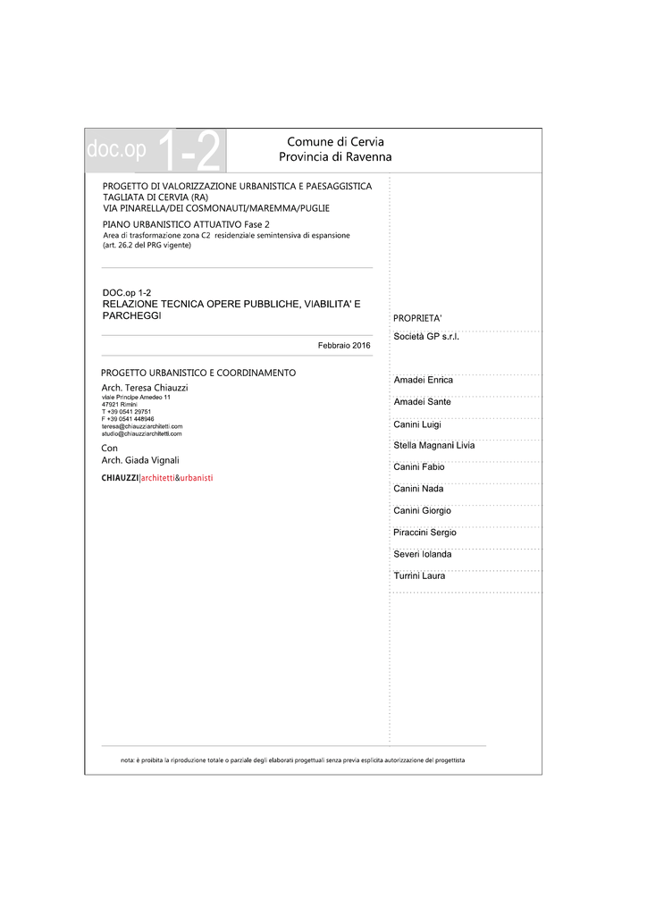 AREA UBICATA A TAGLIATA DI CERVIA (RA) FRA VIA PINARELLA, DEI COSMONAUTI, MAREMMA E PUGLIE RELAZIONE TECNICA OPERE PUBBLICHE, VIABILITA' E PARCHEGGI La Relazione tecnica viene redatta al fine di descrivere le opere pubbliche connesse al Piano Urbanistico Attuativo (PUA) del comparto posto nella località di Tagliata fra via Pinarella, Dei Cosmonauti, Maremma e Puglie. Per una descrizione più generale si rinvia alla Relazione illustrativa urbanistica e paesaggistica di cui all'elaborato DOC.urb1. 1) Lo schema d'assetto delle opere di urbanizzazione Morfologia di progetto L’area è pianeggiante come emerge dal rilievo dello stato di fatto con una lieve naturale pendenza verso mare. Il progetto urbanistico, mediante il disegno del nuovo asse viario principale di accesso, raccorda le quote altimetriche esistenti, che vanno da + 2,30 in via dei Cosmonauti a + 1,70/1,80 di via Pinarella, rispetto al caposaldo assunto. La nuova viabilità di urbanizzazione, e quindi anche dell’insediamento, si attesta alla quota + 2,30 fino a + 2,60 raccordandosi alle quote circostanti con lievissime pendenze e modellando i lotti, i quali saranno da raccordare in sede esecutiva. Le sezioni indicano che ci saranno dei riporti come segue: da via dei Cosmonauti fino a metà della nuova strada di accesso circa da 60/70 cmm; al centro dove è collocata la strada parallela a via Pinarella circa 90/100 cm. Per i lotti sul lato sinistro circa 80 cm e sul lato sinistro circa100 cm. L'invaso di laminazione avrà un riporto di circa 20/30 cm. Nella Tav.op10 è possibile vedere gli scavi ed i riporti da eseguire negli spazi pubblici. Accessibilità all'area L'accesso principale all'area avviene da via Dei Cosmonauti mediante la creazione di un asse viario interno al comparto a basso impatto, secondo la filosofia della zona "30" che scandisce gli spazi e assume le caratteristiche di viale alberato con ampie aiuole verdi da un lato. Lungo il viale vengono inseriti il marciapiede pedonale da un lato e la pista ciclabile dall'altro, che metteranno in connessione l'area di progetto con la viabilità esterna. In accordo con l'amministrazione comunale, la nuova viabilità interna al comparto verrà collegata a questa strada nella sola direzione di uscita, al fine di privilegiare l'accesso a sud. 1 A lato dello stradello esistente che è largo circa 6,00 ml, sarà possibile tracciare un percorso per le biciclette per dare continuità alla pista ciclabile che da via Dei Cosmonauti raggiungerà via Pinarella. Spazi aperti pubblici Relativamente al progetto degli spazi aperti, viene data priorità alla continuità degli spazi pubblici fruibili (verde e percorsi). Gli standard sono costituiti da un'ampia area verde da attrezzare secondo le caratteristiche indicate in premessa, nonchè da due parcheggi compatti a servizio dell'insediamento, uno a nord e uno a sud che da una risposta anche alle case che insistono lungo via Dei Cosmonauti. Il progetto sottende all'dea di volere creare un insediamento sostenibile ed un ambiente curato per migliorare la qualità del contesto locale. La scelta dei materiali e delle essenze verdi da piantare sono vengono proposte in accordo ai contenuti del regolamento del verde comunale, con una certa attenzione alla permeabilità e al mantenimento nel tempo con bassa manutenzione. Barriere architettoniche Gli spazi progettati sono conformi ai contenuti della legge vigente in materia di abbattimento delle barriere architettoniche, come indicato nella Tav.op1. Servitù Gli accessi da via Pinarella e da via Cosmonauti (strada a nord-est e porzione di area a sudovest) presentano delle servitù di passaggio in favore dei proprietari delle case adiacenti. Le porzioni di aree che saranno risistemate, trasformate in urbanizzazioni ad usi pubblici e cedute al Comune, garantiranno gli accessi carrabili alle case. 2a) Le urbanizzazioni Viabilità e parcheggi La nuova viabilità lungo cui si snoda l'insediamento, collega via dei Cosmonauti con via Pinarella; in quest'ultimo tratto (oggi a doppio senso) si mantiene solo la direzione in uscita dall'insediamento verso via Pinarella, con la pista ciclabile nel suo tratto terminale. Relativamente al tema delle zone 30, si precisa che il progetto riguarda un nuovo insediamento pertanto non presenta i caratteri propri di tali zone, ma ne assume la filosofia, intesa qui come attenzione alla progettazione di una strada di urbanizzazione "a basso impatto" tenuto conto delle caratteristiche funzionali e paesaggistiche del contesto. Gli spazi di fruizione dei pedoni, delle biciclette e delle auto, sono progettati su percorsi autonomi dedicati (sede propria). Il percorso ciclabile assume tre caratteristiche sulla base dei tratti che attraversa: lungo la strada è a lato su sede propria rialzata; nell'area verde la attraversa alla quota circa del terreno fino a ricongiungersi con l'ultimo tratto dove un piccolo snodo la raccorda 2 al marciapiede e poi al tratto finale dove corre a raso mediante segnaletica a terra, per uscire su via Pinarella. La larghezza della viabilità principale è di m 6,5 quale strada locale, proprio in virtù delle caratteristiche dell'insediamento. L’asse viario principale presenta un disassamento per scoraggiare la velocità, oltre che a dare una forma non monotona al disegno d'impianto. La posizione dei parcheggi pubblici evita la vicinanza ad intersezioni stradali. Sono state individuate due aree per la sosta consistenti e compatte nonchè di facile accesso alle auto, uno in posizione più centrale e uno più a sud. Quest'ultimo è funzionale non solo all'insediamento ma offre un servizio anche alle residenze di terzi che si trovano lungo via Dei Cosmonauti. I parcheggi sono dotati di adeguati spazi di manovra. I materiali scelti conferiscono un carattere omogeneo e urbano all’area: la viabilità ed i marciapiedi pedonali sono in conglomerato bituminoso; la pista ciclabile lungo strada in conglomerato bituminoso colorato; i parcheggi e la pista