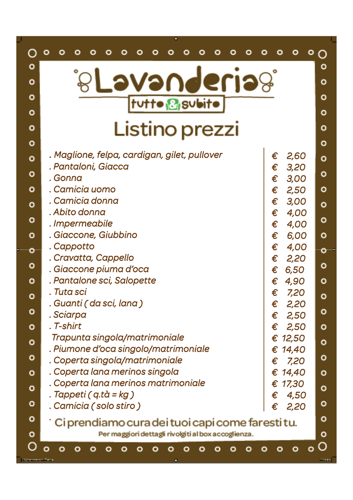 . Maglione, felpa, cardigan, gilet, pullover . Pantaloni, Giacca . Gonna . Camicia uomo . Camicia donna . Abito donna . Impermeabile . Giaccone, Giubbino . Cappotto . Cravatta, Cappello . Giaccone piuma d’oca . Pantalone sci, Salopette . Tuta sci . Guanti ( da sci, lana ) . Sciarpa . TT-shirt Trapunta singola/matrimoniale . Piumone d’oca singolo/matrimoniale . Coperta singola/matrimoniale . Coperta lana merinos singola . Coperta lana merinos matrimoniale . Tappeti ( q.tà = kg ) . Camicia ( solo stiro ) . € € € € € € € € € € € € € € € € € € € € € € € 2,60 3,20 3,00 2,50 3,00 4,00 4,00 6,00 4,00 2,20 6,50 4,90 7,20 2,20 2,50 2,50 12,50 14,40 7,20 14,40 17,30 4,50 2,20