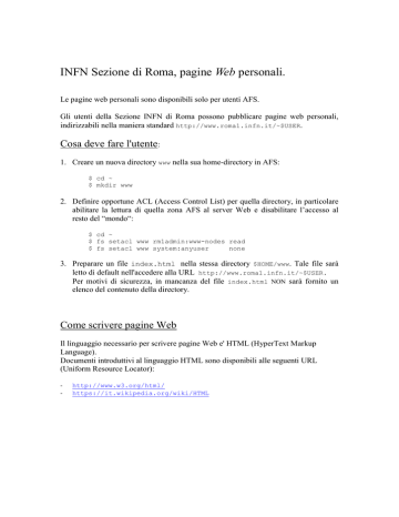 INFN Sezione di Roma, pagine Web personali. Le pagine web personali sono disponibili solo per utenti AFS. Gli utenti della Sezione INFN di Roma possono pubblicare pagine web personali, indirizzabili nella maniera standard http://www.roma1.infn.it/~$USER. Cosa deve fare l'utente: 1. Creare un nuova directory www nella sua home-directory in AFS: $ cd ~ $ mkdir www 2. Definire opportune ACL (Access Control List) per quella directory, in particolare abilitare la lettura di quella zona AFS al server Web e disabilitare l’accesso al resto del “mondo“: $ cd ~ $ fs setacl www rm1admin:www-nodes read $ fs setacl www system:anyuser none 3. Preparare un file index.html nella stessa directory $HOME/www. Tale file sarà letto di default nell'accedere alla URL http://www.roma1.infn.it/~$USER. Per motivi di sicurezza, in mancanza del file index.html NON sarà fornito un elenco del contenuto della directory. Come scrivere pagine Web Il linguaggio necessario per scrivere pagine Web e' HTML (HyperText Markup Language). Documenti introduttivi al linguaggio HTML sono disponibili alle seguenti URL (Uniform Resource Locator): - http://www.w3.org/html/ https://it.wikipedia.org/wiki/HTML Indexing Come già detto l'indexing di una directory via web è disabilitato per default e deve essere esplicitamente consentito dall'utente. Per fare ciò è sufficiente creare un file, nella directory in questione, che si chiami .htaccess e che contenga il seguente record: Options Indexes Una volta creato il file, nel sottoalbero a partire da quella directory è consentito il listing via web. Accesso regolato da password La attuale implementazione consente la pubblicazione di informazioni il cui accesso sia limitato ad uno o più utenti. È possibile controllare l’acesso attraverso apposite coppie di username e password oppure abilitare utenti della cella nazionale AFS (REALM Kerberos5 “INFN.IT”). Accesso attraverso username e password locali È possibile definire una apposita username e password per controllare l’accesso ad un sottoalbero della propria area web. Nella directory che ospita informazioni riservate dovrà essere presente un file .htaccess che conterrà l’indirizzo del repository (file .htFILE) contenente la coppia username:password per l’accesso a quel ramo dell’albero www. File .htaccess Di seguito è riportato un template del file .htaccess. ------------------------- inizio file .htaccess -------------------------------------------------AuthUserFile /DIRECTORY/.htFILE AuthGroupFile /dev/null AuthName "SHORT_DESCRIPTION" AuthType Basic <Limit GET PUT POST> order allow,deny allow from all require valid-user </Limit> ------------------------- fine file .htaccess ---------------------------------------------------- Le stringhe indicate in bold vanno sostituite con il valore corretto: = parte variabile del nome che si è voluto dare al file contenente le coppie username:password. Per motivi di sicurezza è importante che il nome di questo file inizi con .ht ; FILE = path completo della directory in cui è stato creato il file .htFILE. La directory scelta dovrà soddisfare i seguenti requisiti: - dovrà risiedere in zona AFS; - non dovrà essere visibile via web (quindi non potrà essere, ad esempio, una sottodirectory di /afs/infn.it/roma1/project/www/htdocs, né di /afs/infn.it/roma1/$USER/www; - dovranno essere definite opportune ACL che consentato la lettura dello spazio disco al server web e neghino l’accesso al resto del mondo. Es: $ cd ~ DIRECTORY $ mkdir myhtpw $ fs setacl myhtpw rm1admin:www-nodes read $ fs setacl myhtpw system:anyuser none SHORT DESCRIPTION = breve descrizione del contenuto di quella directory. es: AuthUserFile /afs/infn.it/roma1/user/pippo/myhtpw/.htplutopw AuthName "Internal Information" File .htFILE Di seguito è riportato un esempio del file .htFILE. ------------------------- inizio file .htFILE ----------------------------------------------admin:XSR7RbCDFAdcI ospite:PdpinzuHWnyFg ------------------------- fine file .htFILE ------------------------------------------------Come fa supporre l’esempio sovrastante, le username dovranno essere scritte in chiaro, mentre le password dovranno essere crittate. Per ottenere la stringa crittata corrisponde alla password scelta è disponibile una form sul sito del SICR: https://www.roma1.infn.it/sicr/ SERVIZI - MyWebCrypt Accesso ad utenti della cella nazionale AFS (REALM K5 INFN.IT) E’ altresì possibile consentire l’accesso ad un sottoalbero della propria area web ad uno o più utenti REALM Kerberos5 nazionale “INFN.IT”, che si autentichino con le proprie credenziali. Nella directory che ospita informazioni riservate dovrà essere presente un file .htaccess che conterrà l’elenco dei principal (<username>@INFN.IT) degli utenti autorizzati. File .htaccess Di seguito è riportato un template del file .htaccess. ------------------------- inizio file .htaccess -------------------------------------------------SSLRequireSSL AuthType Kerberos AuthName "<SHORT_DESCRIPTION>" KrbAuthRealms INFN.IT KrbServiceName host KrbMethodK5Passwd On KrbMethodNegotiate Off Krb5KeyTab /etc/httpd/conf/keytab require user <USERNAME_1>@INFN.IT <USERNAME_2>@INFN.IT ------------------------- fine file .htaccess ---------------------------------------------------Le stringhe indicate in bold vanno sostituite con il valore corretto: SHORT DESCRIPTION = breve descrizione del contenuto di quella directory. es: AuthName "Internal Information" USERNAME_x = username dell’utente autorizzato