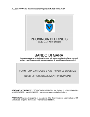 $//(*$72³$´DOOD'HWHUPLQD]LRQH'LULJHQ]LDOH1GHO PROVINCIA DI BRINDISI 9LD'H/HR%5,1',6, BANDO DI GARA SURFHGXUDDSHUWDFULWHULRGHOSUH]]RSLEDVVRPHGLDQWHRIIHUWDDSUH]]L XQLWDUL±YHULILFDDQRPDOLDHSUHVHQWD]LRQHGLJLXVWLILFD]LRQLSUHYHQWLYH FORNITURA CARTUCCE E NASTRI PER LE ESIGENZE DEGLI UFFICI E STABILIMENTI PROVINCIALI 67$=,21($33$/7$17(: PROVINCIA DI BRINDISI – Via De Leo, 3 - 72100 Brindisi – tel. 0831/565289 – fax 0831/565399 – sito Internet www.provincia.brindisi.it. 352&('85$ procedura aperta, in esecuzione della Determinazione a contrattare Q adottata dal Dirigente del Servizio Finanziario del 3HU LO JLRUQR 0$**,2 FD DOOH RUH presso la sede di questo Ente, è indetta gara a mezzo di procedura aperta per la fornitura di cartucce e nastri per le esigenze degli uffici e stabilimenti provinciali, ai sensi dell’art. 55, da aggiudicarsi con le modalità previste dall’art. 82, comma 2 lett. b) del Decreto Legislativo 12 aprile 2006, n. 163, con offerte segrete e con il criterio del prezzo più basso, espresso mediante offerta a prezzi unitari. L’importo a base d’asta fissato per la fornitura in questione è pari ad ¼ ,9$ HVFOXVD HXUR VHVVDQWDTXDWWURPLODWUHFHQWRTXDUDQWDVHWWH Non saranno ammesse offerte di importo superiore a quello indicato. Alla predetta data si procederà all’esame della completezza ed idoneità della documentazione presentata ai fini dell’ammissione alla gara dei concorrenti, per la successiva valutazione delle offerte presentate. La commissione preposta all’espletamento della procedura di gara procederà pubblicamente, all’apertura dei plichi presentati dalle ditte partecipanti nei termini e con le modalità indicate. Sono autorizzati a presenziare alle operazioni di gara i legali rappresentanti dell’impresa o loro incaricati muniti di delega. 1. 2**(772'(//$)251,785$ L’appalto ha per oggetto la fornitura di cartucce, nastri e toner per stampanti ad uso degli uffici provinciali, secondo quanto indicato nel Capitolato Speciale d’Appalto approvato con 'HWHUPLQD]LRQH 'LULJHQ]LDOH Q GHO Detto C.S.A. è disponibile sul sito web della Provincia di Brindisi all’indirizzo www.provincia.brindisi.it. Lo stesso dovrà essere restituito debitamente timbrato e firmato in ogni foglio dal legale rappresentante della ditta partecipante unitamente alla documentazione richiesta ed avrà valore di contratto a tutti gli effetti di legge. La ditta partecipante dovrà inoltre scaricare dal sito ZHE LO PRGHOOR GL UHGD]LRQH GHOO¶RIIHUWD HFRQRPLFD VXOOD TXDOH IRUPXODUH O¶RIIHUWD. Non sarà inviata alcuna documentazione via fax. 2. '85$7$'(//¶$33$/72 L’appalto della fornitura in questione, avrà la durata massima di anni 1 (uno), con opzione di rinnovo per una sola volta per lo stesso periodo (anni uno) nei modi e nei termini previsti dalla normativa in vigore ed avrà decorrenza dalla data di comunicazione dell’avvenuta aggiudicazione della fornitura medesima. &5,7(5,2',$**,8',&$=,21( La gara si terrà mediante procedura aperta ai sensi dell’art. 55, da aggiudicarsi con le modalità previste dall’art. 82, comma 2 lett. b) del Decreto Legislativo 12 aprile 2006, n. 163, con offerte segrete e con il criterio del prezzo più basso sull’elenco dei prezzi posto a base di gara, espresso mediante offerta a prezzi unitari. Non sono ammesse offerte in aumento. Si precisa che: - OH JLXVWLILFD]LRQL SUHYHQWLYH GHEERQR ULJXDUGDUH OH YRFL GL SUH]]R FKH FRQFRUURQRDIRUPDUHO¶LPSRUWRFRPSOHVVLYRSRVWRDEDVHGLJDUD WDOL JLXVWLILFD]LRQL GHEERQR HVVHUH FRQWHQXWH QHOOD VWHVVD EXVWD FKLXVD FKHFRQWLHQHO¶RIIHUWDHFRQRPLFD Per ciò che attiene la verifica delle anomalie delle offerte sarà valutata la congruità di quelle che presentano un ribasso pari o superiore alla media aritmetica dei ribassi percentuali di tutte le offerte ammesse, con esclusione del dieci per cento arrotondato all’unità superiore, rispettivamente delle offerte di maggior ribasso e quelle di minor ribasso, incrementata dello scarto medio aritmetico dei ribassi percentuali che superano la predetta media (se vi sono almeno 5 offerte ammesse), ai sensi dell’art. 86 comma 1 del D. Lgs. N. 163/06. Le offerte che presentano una percentuale di ribasso pari o superiore alla soglia di anomalia, individuata ai sensi del precedente articolo 86 saranno automaticamente escluse dalla gara ai sensi dell’art. 124 comma 8 del medesimo D. Lgs. Si precisa che si procederà all’aggiudicazione anche nel caso di una sola offerta valida, se ritenuta congrua dalla stazione appaltante. &$8=,21( Ai sensi dell’art. 75 comma 8) del D. Lgs. 163/2006 il deposito cauzionale provvisorio è stabilito in ¼ SDUL DO GHOO¶LPSRUWR GHOOD IRUQLWXUD SRVWD D base di gara, destinato a risarcire l’eventuale danno derivante all’Amministrazione aggiudicante dalla mancata sottoscrizione del contratto e può essere costituito mediante: D )LGHMXVVLRQHEDQFDULDUHVDGDLGRQHDD]LHQGDGLFUHGLWR E 3ROL]]DIHLGHMXVVRULDDVVLFXUDWLYDULODVFLDWDGDLPSUHVDGLDVVLFXUD]LRQH GHELWDPHQWHDXWRUL]]DWDDOO¶HVHUFL]LRGHOUDPRGHOOHFDX]LRQLHGDYHQWHL UHTXLVLWLSUHYLVWLGDOODOHJJHQ F 4XLHWDQ]D GHO WLWRODUH PHGLDQWH YHUVDPHQWR SUHVVR LO 7HVRULHUH 3URYLQFLDOH $L QRQ DJJLXGLFDWDUL OD FDX]LRQH VDUj UHVWLWXLWD DG DYYHQXWD DJJLXGLFD]LRQHGHILQLWLYD Detta polizza, dovrà essere corredata, a pena di esclusione, dall’impegno a rilasciare la fideiussione definitiva di cui all’art. 113 del D. Lgs. 163/2006, qualora l’offerente risultasse aggiudicatario. La quietanza del versamento del deposito cauzionale provvisorio oppure fideiussione bancaria ovvero polizza assicurativa rilasciata da un intermediario finanziario iscritto nell’elenco speciale di cui all’art 107 del D. Lgs. 385/93, in originale, dovrà essere presentata in originale nella busta contenente la documentazione tecnico-amministrativa e dovrà contenere espressamente la rinuncia al beneficio della preventiva escussione del debitore principale e la sua operatività entro quindici giorni a semplice richiesta scritta del