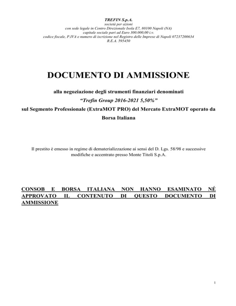 Emittente o Trefin S.p.A. o Indica Trefin S.p.A., con sede legale in Centro Direzionale Isola E7,