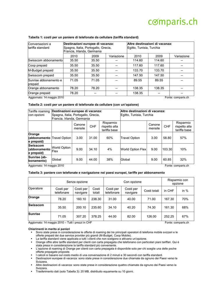 Tabella 1: costi per un paniere di telefonate da cellulare (tariffa standard) Destinazioni europee di vacanza: Spagna, Italia, Portogallo, Grecia, Francia, Irlanda, Germania Conversazioni a tariffa standard Altre destinazioni di vacanza: Egitto, Tunisia, Turchia Swisscom abbonamento 2010 35.50 2009 35.50 Variazione -- 2010 114.60 2009 114.60 Variazione -- Coop prepaid 35.50 35.50 -- 117.60 117.60 -- M-Budget prepaid 35.50 35.50 -- 133.70 133.70 -- Swisscom prepaid 35.50 35.50 -- 147.50 147.50 -- Sunrise abbonamento e prepaid Orange abbonamento 71.05 71.05 -- 89.55 89.55 -- 78.20 78.20 -- 138.35 138.35 -- Orange prepaid 78.20 -- -- 138.35 -- -- Aggiornato: 14 maggio 2010 Fonte: comparis.ch Tabella 2: costi per un paniere di telefonate da cellulare (con un’opzione) Tariffe roaming Destinazioni europee di vacanza: con opzioni Spagna, Italia, Portogallo, Grecia, Francia, Irlanda, Germania Orange (abbonamento e prepaid) Swisscom (abbonamento e prepaid) Sunrise (abbonamento) Altre destinazioni di vacanza: Egitto, Tunisia, Turchia Canone mensile CHF Risparmio rispetto alla tariffa base Canone mensile CHF Risparmio rispetto alla tariffa base Travel Option 3.00 31.00 60% Travel Option 3.00 58.80 57% World Option Flex 9.00 34.10 4% World Option Flex 9.00 103.30 10% Global 9.00 44.00 38% Global 9.00 60.85 32% Aggiornato: 14 maggio 2010 Fonte: comparis.ch Tabella 3: paniere con telefonate e navigazione nei paesi europei, tariffe per abbonamento Senza opzione Operatore Orange Swisscom Sunrise Risparmio con opzione Con opzione Costi per telefonare Costi per navigare Costi totali Costi per telefonare Costi per navigare Costi totali in CHF in % 78.20 160.10 238.30 31.00 40.00 71.00 167.30 70% 35.50 200.10 235.60 34.10 40.20 74.30 161.30 68% 71.05 307.20 378.25 44.00 82.00 126.00 252.25 67% Aggiornato: 14 maggio 2010 – Tutti i prezzi in CHF Fonte: comparis.ch Chiarimenti in merito ai panieri Sono state prese in considerazione le offerte di roaming dei tre principali operatori di telefonia mobile svizzeri e le offerte prepaid dei due service provider più grandi (M-Budget, Coop Mobile). La tariffa standard viene applicata a tutti i clienti che non scelgono e attivano un’opzione. Orange offre altre tariffe standard per clienti con carta prepagata che telefonano con particolari piani tariffari. Qui è stata presa in considerazione la tariffa standard più conveniente. L’opzione di roaming di Orange per clienti con carta prepagata è disponibile solo per chi sceglie una delle poche offerte prepagate proposte. I calcoli si basano sul costo medio di una conversazione di 2 minuti e 30 secondi con tariffa standard. Destinazioni europee di vacanza: sono state prese in considerazione due chiamate da ognuno dei Paesi verso la Svizzera. Altre destinazioni di vacanza: sono state prese in considerazione quattro chiamate da ognuno dei Paesi verso la Svizzera. Trasferimento dati (solo Tabella 3): 20 MB, distribuito equamente su 10 giorni.