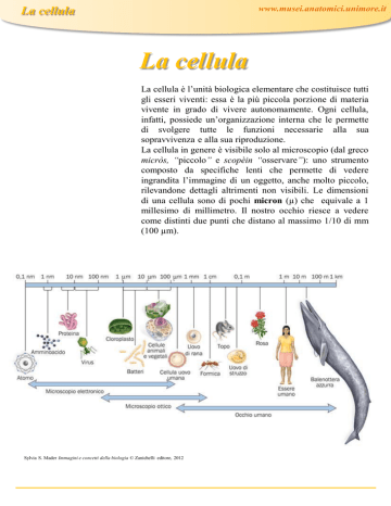 www.musei.anatomici.unimore.it La cellula La cellula La cellula è l’unità biologica elementare che costituisce tutti gli esseri viventi: essa è la più piccola porzione di materia vivente in grado di vivere autonomamente. Ogni cellula, infatti, possiede un’organizzazione interna che le permette di svolgere tutte le funzioni necessarie alla sua sopravvivenza e alla sua riproduzione. La cellula in genere è visibile solo al microscopio (dal greco micròs, “piccolo” e scopèin “osservare”): uno strumento composto da specifiche lenti che permette di vedere ingrandita l’immagine di un oggetto, anche molto piccolo, rilevandone dettagli altrimenti non visibili. Le dimensioni di una cellula sono di pochi micron (µ) che equivale a 1 millesimo di millimetro. Il nostro occhio riesce a vedere come distinti due punti che distano al massimo 1/10 di mm (100 µm). Sylvia S. Mader Immagini e concetti della biologia © Zanichelli editore, 2012 www.musei.anatomici.unimore.it La cellula Organismi unicellulari quali i microrganismi sono formati da una sola cellula, mentre gli animali e le piante, costituiti da molte cellule, sono pluricellulari. I microrganismi più piccoli, come i batteri, sono composti di un’unica cellula molto semplice e sono chiamati procarioti (dal greco pro-, “prima”, e kàryon, “nucleo” che significa “prima del nucleo”). La loro cellula, infatti, non presenta un nucleo vero e proprio ed al suo posto si trova un solo cromosoma. Alcuni organismi unicellulari e gli organismi pluricellulari vengono definiti eucarioti (dal greco eu-, “bene”, e kàryon, “nucleo” che significa “con nucleo ben fatto”). Pur condividendo la stessa struttura di base, le cellule però non sono tutte uguali: presentano una grande varietà di forme e dimensioni a seconda della posizione che occupano nell’organismo e della funzione che devono svolgere. La materia che costituisce la cellula, detta materia vivente, è formata per il 65/70 % da acqua, da una piccola percentuale di composti inorganici (come i sali minerali) e per il 30% da composti organici (come i carboidrati, i lipidi, le proteine e gli acidi nucleici) indispensabili per le attività della cellula. CELLULA EUCARIOTE CELLULA PROCARIOTE Vassori, La scoperta e la ricerca © Atlas 2012 (modificata) ANIMALE VEGETALE www.musei.anatomici.unimore.it La cellula Ogni cellula è composta da tre parti principali: la membrana cellulare, il citoplasma ed il nucleo. La membrana cellulare è un sottile (8nm) rivestimento che separa l’interno della cellula dall’ambiente circostante e che regola gli scambi molecolari con l’esterno. Essa è semipermeabile, ossia, lascia entrare ed uscire solo alcune sostanze e non altre. La membrana cellulare è formata principalmente da un doppio strato di molecole dette fosfolipidi. Essi sono un gruppo di lipidi con una duplice natura: sono idrofili (cioè hanno affinità per l’acqua) in corrispondenza della «testa», formata da un gruppo di atomi che contiene fosforo, e sono idrofobi (cioè non hanno affinità per l’acqua e tende ad allontanarsi da essa) in corrispondenza delle due «code» formate da acidi grassi. Inserite nel doppio strato di fosfolipidi si trovano molte proteine che possono svolgere varie funzioni tra cui il trasporto di molecole attraverso i confini della cellula, l’adesione tra cellule adiacenti o il riconoscimento tra cellule. MEMBRANA CELLULARE E FOSOLIPIDE INGRANDITO Kai Simons, Marino Zerial Treccani 2007 (modificata) www.musei.anatomici.unimore.it La cellula Il citoplasma è una massa semifluida gelatinosa racchiusa all’interno della membrana comprendente anche gli organuli cellulari specializzati a svolgere determinate funzioni. Il nucleo è l’organulo che si trova di solito nella posizione centrale della cellula. E’ paragonabile, in un certo senso, al “centro direttivo” della cellula. Il nucleo contiene una particolare molecola, il DNA (acido desossiribonucleico). Dal DNA partono tutte le informazioni utili per dirigere e coordinare le funzioni vitali della cellula. Il DNA è composto da due filamenti avvolti a spirale che formano i cromosomi, su cui sono “scritte” tutte le informazioni responsabili della trasmissione dei caratteri ereditari. In ogni essere vivente di ciascuna singola specie c’è un numero costante di cromosomi. L’essere umano possiede in ogni cellula somatica 46 cromosomi, il gatto 38 ed il pomodoro 24. All’interno di un nucleo di una cellula non in fase di divisione è presente il nucleolo deputato alla formazione delle componenti costitutive dei ribosomi. NUCLEO E DNA DNA cromosoma nucleo reticolo endoplasmatico ribosoma Viaggio nella cellula © Zanichelli 2006 (modificata) www.musei.anatomici.unimore.it La cellula Il reticolo endoplasmatico (ER) è un sistema di canalicoli e sacchi collegato alla membrana nucleare che accumula e trasferisce proteine. Esistono due tipi di reticolo endoplasmatico, che seppur collegati reciprocamente mostrano differenze di struttura e di funzione. Il reticolo liscio che non ha sulla superficie membranosa i ribosomi, svolge diversi processi metabolici, fra i quali la sintesi dei lipidi e la detossificazione di scorie metaboliche. Il reticolo rugoso al quale aderiscono ribosomi sulla superficie membranosa, produce proteine di secrezione e fosfolipidi destinanti alle membrane. In prossimità al ER rugoso è presente l’apparato di Golgi: un insieme di sacculi, o cisterne, (dittiosomi) delimitati da membrane e disposti l’uno sull’altro. Esso è una sorte di centrale dove i prodotti cellulari vengono modificati, temporaneamente immagazzinati ed infine inviati verso le loro destinazioni definitive. Vescicole di trasporto che gemmano dal ER, contenenti prodotti cellulari, vanno ad integrare la propria membrana con quella che delimita la cisterna dell’apparato di Golgi, riversandovi il proprio contenuto. I prodotti vengono progressivamente modificati nelle cisterne golgiane ed 