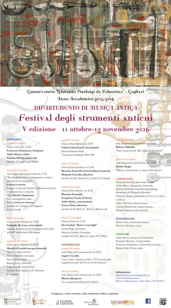 Conservatorio "Giovanni Pierluigi da Palestrina" - Cagliari Anno Accademico 2015-2016 DIPARTIMENTO DI MUSICA ANTICA Festival degli strumenti antichi V edizione 11 ottobre-12 novembre 2016 CONCERTI martedi 11 ottobre Palazzo Siotto ore 21.00 Francesco Giammarco, fortepiano Attilio Motzo, violino Fabrizio Meloni, violoncello Musiche di Franz Joseph Haydn giovedì 27 ottobre Chiesa di San Michele ore 21.00 Fabrizio Marchionni, clavicembalo Johann Sebastian Bach "Variazioni Goldberg" BWV 988 mercoledì 19 ottobre Aula Magna del Conservatorio ore 17.00 "Parole, suoni, canti e contrappunti: esercizio e ricreazione nel madrigale" Lezione-concerto Gruppo Vocale del Triennio di Direzione di Coro e Composizione Corale del Prof. Michele Napolitano. Note storiografiche della Prof.ssa Concetta Assenza musiche di A. Striggio, P. Fonghetti G.G. Gastoldi lunedì 24 ottobre Chiesa di San Michele ore 21.00 Fernando De Luca, clavicembalo musiche di Johann Jacob Froberger (1616-1667) nel 400° anniversario della nascita mercoledì 26 ottobre Chiesa di San Michele ore 21.00 Musici di Castello baroque ensemble "Paris, le centre du bon" Daorsa Dervishi, traversiere Sara Meloni, violino Rebeca Ferri, violoncello Luigi Accardo, clavicembalo musiche di M. Marais, G.P. Telemann F. Couperin sabato 29 ottobre Chiesa di San Sepolcro ore 21.00 Bizzarria Ensemble/Coro Studium Canticum Pierpaolo Scattolin, direzione musiche di G.B. Martini, G.A. Perti, G.F. Händel sabato 5 novembre Chiesa di San Michele ore 21.00 Bizzarria Ensemble Complesso Vocale di Nuoro Attilio Motzo, concertazione Franca Floris, direzione musiche di J.S. Bach, J.L. Bach, C. Monteverdi sabato 12 novembre Palazzo Siotto ore 21.00 Duo Vanhal: "Bach e i suoi figli" Enrica Sirigu, traversiere Manuela Giardina, fortepiano musiche di C.P.E. Bach, J.C. Bach, W.F. Bach CONFERENZE venerdì 14 ottobre Aula Magna del Conservatorio ore 18.30 Angelo Castaldo “Arte e fede a Napoli tra ‘600 e ‘700: la storia della Cappella musicale del Tesoro di San Gennaro” lunedì 24 ottobre Aula Magna del Conservatorio ore 18.30 Myriam Quaquero "Le variazioni Goldberg di J.S. Bach" venerdì 28 ottobre Aula Magna del Conservatorio ore 18.30 Roberto Milleddu "Early music revival. Alle origini del fenomeno" giovedì 3 novembre Aula Magna del Conservatorio ore 18.30 Davide Magni "Musica e meditazione. La danza dello Spirito" LABORATORI Pierpaolo Scattolin, laboratorio vocale Attilio Motzo, laboratorio orchestrale Roberto Milleddu, Luigi Pancrazio Delogu laboratorio di Paleografia Musicale Francesco Bianco, laboratorio di Pratica del Basso Continuo Enrico Di Felice, flauto barocco Fabrizio Marchionni, organo barocco Massimo Spiga, tromba naturale MASTERCLASS Rebeca Ferri, violoncello barocco Massimo Marchese, Liuto SEMINARI Attilio Motzo, il trattato di Geminiani Fernando De Luca, il clavicembalo Francesco Giammarco, il pianoforte viennese Rebeca Ferri, il flauto dolce Informazioni: [email protected] www.ensemblebizzarria.it Referente Dipartimento: Attilio Motzo 329/4358193 L'ingresso a tutti i concerti e alle conferenze è libero e gratuito