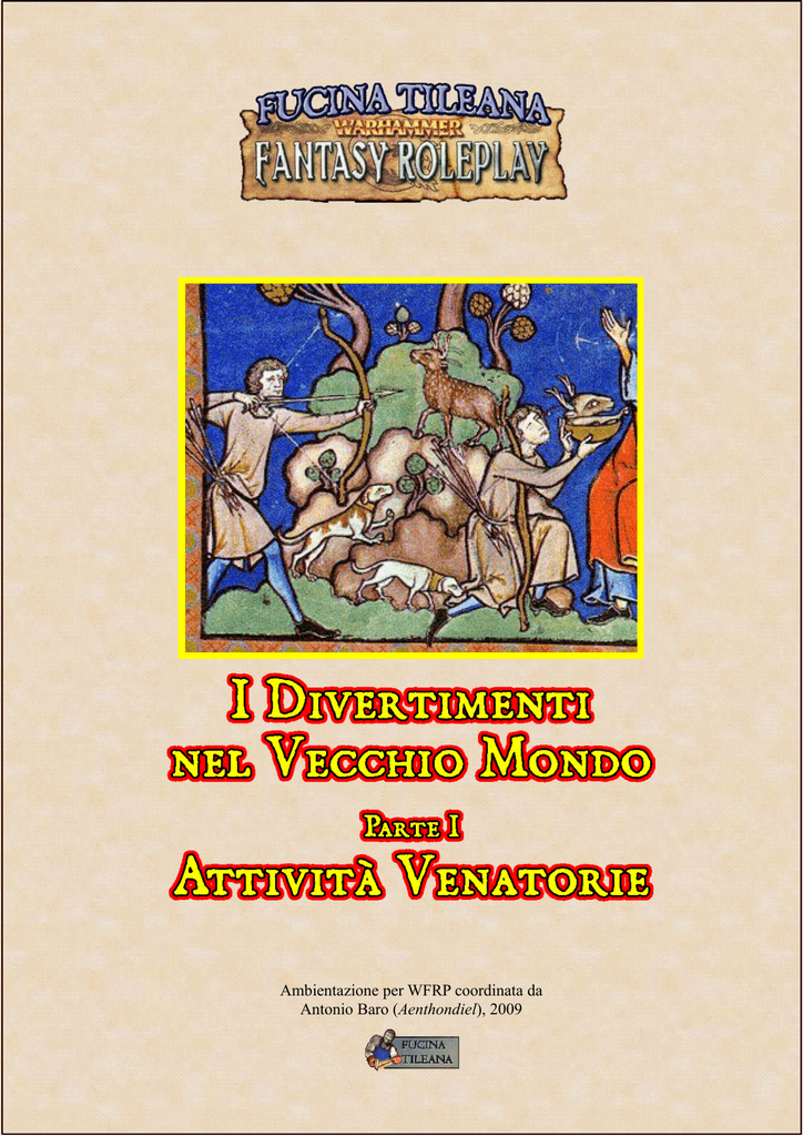 Ambientazione per WFRP coordinata da Antonio Baro (Aenthondiel), 2009 BACKG ROU N D I Divertimenti nel Vecchio Mondo – parte prima ATTIVITÀ VENATORIE Questo modulo fa parte di una serie dedicata ai divertimenti nel mondo di Warhammer; è suddiviso in sei parti e ognuna di queste tratta uno dei diversi aspetti. Serie Completa: I Divertimenti nel Vecchio Mondo, parte prima – Attività Venatorie I Divertimenti nel Vecchio Mondo, parte seconda – Giostre e Tornei I Divertimenti nel Vecchio Mondo, parte terza – Spettacoli I Divertimenti nel Vecchio Mondo, parte quarta – Giochi Marziali I Divertimenti nel Vecchio Mondo, parte quinta – Attività Sportive I Divertimenti nel Vecchio Mondo, parte sesta – Divertimenti Popolari La serie è coordinata da Aenthondiel Parte prima: Attività Venatorie Autori: Antonio “Aenthondiel” Baro, Emiliano Foco Bestiario: Melchitti “Melgi” Gino Falconeria: Emiliano Foco Revisione: Emiliano Foco Disegni e Impaginazione: Antonio “Aenthondiel” Baro Attività Venatorie 2 BACKG ROU N D Il Vecchio Mondo è un luogo pericoloso e cupo, dove la possibilità di morire per malattia, fame o violenza è ben presente a tutti i suoi abitanti. Ma non per questo la gente rinuncia a vivere; al contrario, chi può rende la propria vita il più pos sibile gradevole, cercando un modo che lo di stragga dalla fatica accumulata nella dura gior nata di lavoro, o gli faccia dimenticare le brutte e sconvolgenti esperienze, a contatto con mostri e pericoli. Per i Nobili, infine, le distrazioni fornite dai divertimenti sono qualcosa di più:uno statussymbol e il modo migliore per passare il tempo. Se le leggi possono colpire i molteplici aspetti del la vita quotidiana del Vecchio Mondo, sicuramen te toccheranno in modo marginale il mondo del divertimento, cercando di regolamentarlo e di fa vorirlo, di certo evitando norme che lo impedisco no. In tutte le nazioni e in tutti i reami è anzi spesso favorito dalla stessa classe nobiliare, che spende ingenti somme per organizzare feste e divertimen ti, sia per gli stessi nobili che per la popolazione comune. Infatti tutti i regnanti sanno bene che una delle leggi fondamentali per avere meno problemi possibili con i propri sudditi è quello di fare si che siano contenti. Dato che la tassazione elevata è visto come l’unico metodo per poter raccogliere i fondi necessari per mantenere in efficienza il pro prio feudo e per mantenere un “adeguato” tenore di vita, il sovvenzionare ed organizzare spettacoli che allietino i sudditi è una delle forme di mag gior successo per ottenere il consenso popolare. Del resto ogni occasione serve allo scopo; matri moni tra i nobili, festività religiose, feste civili... Oltre ai governanti dei vari territori, anche le Chiese spesso organizzano “divertimenti”. Questi sono spesso rappresentazioni a sfondo morale o religioso, dove vengono impartiti i rudimenti delle verità che enunciano le varie Chiese, e dove si cerca spesso di fare nuovi adepti. A volte le Chiese cercano di far intervenire la leg ge civile in modo di ostacolare o proibire spetta coli che essi reputano offensivi per la morale o la loro fede, o diseducativi per la gioventù, ma dato che in genere i detentori del Potere sono piuttosto ritrosi ad intervenire, i religiosi più fanatici a vol te organizzano vere e proprie crociate tra i propri seguaci, con manifestazioni o addirittura assalti. In genere i soggetti degli strali delle chiese reagi scono chiedendo aiuto ai potenti, o sollecitando gli appassionati, oppure ingaggiando marmaglia a loro supporto. Altri ancora semplicemente ren dono nascosta la loro attività, trasferendola nel sottobosco della malavita o in club privati, dove poi continuano a fare i loro affari. I divertimenti del Vecchio Mondo sono pressoché infiniti; anche se solo una parte piuttosto ristretta ha un seguito popolare, le varianti ed i tipi di atti vità ludiche sono talmente diversificate da regione a regione, che non esiste la possibilità di una cer nita completa. Questo lavoro che viene presentato ha lo scopo di raccogliere delle indizioni di massima delle prin cipali forme di divertimento, ma l’Arbitro del Gio co dovrebbe escogitare varianti per ogni luogo in cui i vari PG si recano. Attività Venatorie 3 BACKG ROU N D zato un casino di caccia, una costruzione destinata a raccogliere uomini ed animali in vista della bat tuta di caccia, ed a riaccoglierli al temine, quando i Signori riportano le loro prede, scelgono trofei, si rifocillano con vini e spuntini, mangiano a volte la cacciagione preparata in loco dai servi. Il disdegnoso distacco frapposto fra la nobiltà ed il mondo borghese prende anche le vesti della con servazione dei boschi vicini alle costruzioni nobi liari, posseduti perlopiù da feudatari e destinati a riserva venatoria, gelosamente custodita. La Caccia, attività dei Nobili Tra i vari tipi di Caccia la più frequente è la caccia al cervo con l’arco. In questo caso è praticata so prattutto nella sua versione in “battuta” (in breto ne, “par force”), dove il grosso ma mansueto ani male può essere facile bersaglio per i dardi degli arcieri e nello stesso tempo permette l’allestimento di grandi battute con cani, battitori e cacciatori ap piedati, che danno occasione al signore di sfoggia re tutta la propria potenza economica ed organiz zativa. La caccia è l’attività nobiliare per eccellenza, la forma più sofisticata di divertimento dei Cavalieri e segno distintivo di appartenenza a una classe su periore. Essa si ricollega alla primitiva occupazio ne umana, quando assieme all’agricoltura era fon damentale per la sopravvivenza. Connaturata con questi ancestrali ricordi, essa è praticata liberamente, resistendo anche allo svilup po ed all’affermazione dell’agricoltura, con la quale conviveva. Nel tempo si delineò una duplice tipologia di cac cia: quella di stampo signorile, rivolta ad animali di grossa taglia, come cervi e cinghiali, fino ad anim