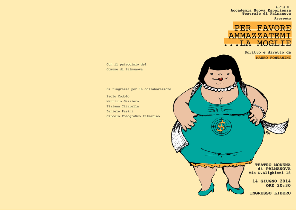 A.C.S.D. Accademia Nuova Esperienza Teatrale di Palmanova Presenta PER FAVORE AMMAZZATEMI ...LA MOGLIE Scritto e diretto da MAURO FONTANINI Con il patrocinio del Comune di Palmanova Si ringrazia per la collaborazione Paolo Codolo Maurizio Gazziero Tiziana Citarella Daniele Pasini Circolo Fotografico Palmarino TEATRO MODENA di PALMANOVA Via D.Alighieri 18 14 GIUGNO 2014 ORE 20:30 INGRESSO LIBERO INTERPRETI Matilde Pia Comoretto governante Giorgio Grimaldi Paolo Da Dalt Mafalda Clara Maggiore zia di Giorgio Jessica Martini Simona Schepis giovane vedova Ortensia Simona Schepis giovane imbranata Camilla Mantovani Stefania Del Frate ricca ereditiera Raul Adolfo Mucciarone cameriere Gloria Bresson Anna Maria Piazzon avvocato Paolo Bruni Romeo Mischis rapitore Marta Bruni Simona Schepis rapitrice Il Maresciallo Raffaele Rampino Garofalo Tecnico Luci Giuliano Petterin Tecnico Suono Gino Marchi TRAMA NOTE DI REGIA La commedia narra mediante una esilarante comicità la storia di Giorgio Grimaldi, ricco signore, che un giorno si ritrova povero per uno stile di vita piuttosto sconsiderato. Costretto dai debiti, chiede un prestito alla ricchissima e odiata zia Mafalda, ottenendolo con un interesse da vero strozzinaggio. Prima di capitolare e sull’orlo del suicidio, su consiglio della fidata governante Matilde, decide di mettersi alla ricerca di una facoltosa ereditiera per sposarla e poi... ammazzarla. Camilla Mantovani, goffa, obesa, golosa ma straordinariamente ricca e sola al mondo è l’elemento giusto. L’amica e avvocato Gloria Bresson tenta in tutti i modi di dissuaderla, ma Camilla accetta di sposarlo. Ritornati dal viaggio di nozze, Giorgio decide di mettere in atto i suoi propositi omicidi, ma una coppia di sprovveduti rapitori Paolo e Marta, sembra addirittura facilitargli il compito sequestrando la sposa. Mafalda e Gloria si contattano e alleandosi controllano ogni movimento di Giorgio, pronte a denunciarlo al maresciallo Garofalo. La vicenda a questo punto assume connotazioni grottesche, ma il protagonista nel finale dovrà fare i conti con una complicazione imprevista. La commedia è ispirata ad un celebre film americano e le battute del testo, a volte assurde e surreali, vorrebbero ricordare quelle, inimitabili, del più grande comico contemporaneo: Woody Allen. La difficoltà del lavoro, specie nel secondo atto, è stata quella di presentare contemporaneamente sul palco due diversi ambienti scenici, con i personaggi intenti ad intrecciare dialoghi tra loro. Questo, a differenza del cinema, può diventare un problema di difficile risoluzione in teatro, poiché c’è il rischio di spezzare troppo il ritmo dello spettacolo. Spero di esserci riuscito, poiché tutta la commedia si basa proprio sul dinamismo e sui continui colpi di scena. Lo spettacolo a prima vista può sembrare un lavoro dichiaratamente maschilista, ma nel finale si assisterà inevitabilmente… al trionfo del “sesso debole”. Mi auguro che i quasi due anni trascorsi nei ritagli di tempo libero a scrivere e riscrivere questo copione, alla fine siano serviti a creare uno spettacolo piacevole che non vuole avere alcuna pretesa se non quella di far divertire per due ore lo spettatore. Mauro Fontanini
