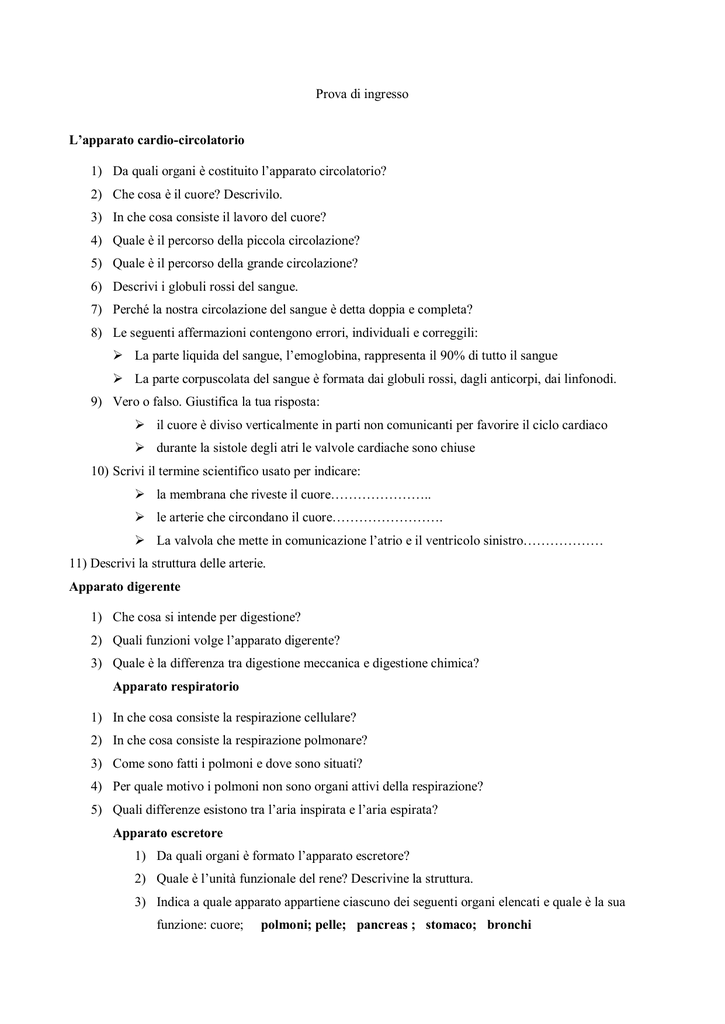 Prova di ingresso L’apparato cardio-circolatorio 1) Da quali organi è costituito l’apparato circolatorio? 2) Che cosa è il cuore? Descrivilo. 3) In che cosa consiste il lavoro del cuore? 4) Quale è il percorso della piccola circolazione? 5) Quale è il percorso della grande circolazione? 6) Descrivi i globuli rossi del sangue. 7) Perché la nostra circolazione del sangue è detta doppia e completa? 8) Le seguenti affermazioni contengono errori, individuali e correggili: La parte liquida del sangue, l’emoglobina, rappresenta il 90% di tutto il sangue La parte corpuscolata del sangue è formata dai globuli rossi, dagli anticorpi, dai linfonodi. 9) Vero o falso. Giustifica la tua risposta: il cuore è diviso verticalmente in parti non comunicanti per favorire il ciclo cardiaco durante la sistole degli atri le valvole cardiache sono chiuse 10) Scrivi il termine scientifico usato per indicare: la membrana che riveste il cuore………………….. le arterie che circondano il cuore……………………. La valvola che mette in comunicazione l’atrio e il ventricolo sinistro……………… 11) Descrivi la struttura delle arterie. Apparato digerente 1) Che cosa si intende per digestione? 2) Quali funzioni volge l’apparato digerente? 3) Quale è la differenza tra digestione meccanica e digestione chimica? Apparato respiratorio 1) In che cosa consiste la respirazione cellulare? 2) In che cosa consiste la respirazione polmonare? 3) Come sono fatti i polmoni e dove sono situati? 4) Per quale motivo i polmoni non sono organi attivi della respirazione? 5) Quali differenze esistono tra l’aria inspirata e l’aria espirata? Apparato escretore 1) Da quali organi è formato l’apparato escretore? 2) Quale è l’unità funzionale del rene? Descrivine la struttura. 3) Indica a quale apparato appartiene ciascuno dei seguenti organi elencati e quale è la sua funzione: cuore; polmoni; pelle; pancreas ; stomaco; bronchi Prova strutturata di scienze classe 3° - 1° quadrimestre 1) che cosa si intende per strati elettronici di un atomo? 2) che cos’è la valenza di un elemento? Perché alcuni elementi hanno più valenze, ad esempio il fosforo, lo zolfo, l’azoto. 3) Che cosa si intende per: peso atomico, peso molecolare, numero di quark. 4) Che cos’è una reazione chimica? 5) Illustra la reazione chimica tra il ferro e lo zolfo eseguita in laboratorio. 6) Descrivi la tavola periodica degli elementi. 7) Che cosa si intende dire che le proprietà chimiche degli elementi sono periodiche? 8) Che significato hanno i numeri negli atomi 3517Cl e 12 6C 9) I primi tre elementi del quinto gruppo sono l’azoto, il fosforo e l’arsenico. Quale di questi tre ha proprietà metalliche più spiccate. 10) Completa le seguenti reazioni chimiche: Metallo + …………………. Ossido ……………+ ossigeno anidride ossido + acqua ………………….. anidride + acqua ………………………. Base +………………. Acido 11) Completa le seguenti reazioni chimiche: CaO +H2O S + O2 CaO + H2SO4 Indica il nome dei reagenti e dei prodotti di reazione e bilancia le reazioni. 12) che cosa sono gli indicatori? Indica alcuni indicatori che conosci e indica il loro comportamento in presenza delle sostanze chimiche. Prova strutturata 2 quadrimestre 1) Che cosa è la genetica? 2) Definisci il termine mitosi e descrivi il processo. 3) Che cosa vuol dire omozigote? Ed eterozigote? 4) Che cosa è il genotipo? E il fenotipo? 5) Spiega che cosa è un gene recessivo. 6) Come si spiega la prima legge di Mendel? 7) Giovanni ha gli occhio azzurri, mentre i suoi genitori li hanno scuri. Sapendo che il carattere “occhi scuri” è dominante, come sono i geni che controllano il colore degli occhi di Giovanni? E quelli di ciascuno dei suoi genitori? Fai uno schema o un grafo ad albero. 8) Descrivi la struttura chimica del DNA. In quale parte della cellula è contenuto? Perchè i due filamenti del DNA contengono le stesse informazioni? 9) Come si svolge la duplicazione del DNA? Che cosa vuol dire DNA? 10) Quanti cromosomi ha l’uomo? I gameti dell’uomo quanti cromosomi hanno? 11) Descrivi l’apparato in cui vengono prodotti i gameti. 12) Qual è il nome dell’ormone sessuale maschile che determina lo sviluppo e il mantenimento dei caratteri sessuali maschili? 13) Quali sono i due ormoni femminili che determinano lo sviluppo e il mantenimento dei caratteri sessuali femminili? 14) )Associa a ogni fase della mitosi l’evento corrispondente: a) metafase b) telofase c) anafase d) profase 1)I due cromatidi di ciascun cromosoma si separano, trascinati dalle fibre del fuso mitotico 2) I cromosomi sono al centro della cellula e vengono agganciati nel centromero dal fuso mitotico 3) La membrana nucleare scompare e il DNA si condensa formando i cromosomi 4)Intorno ai cromosomi, oramai separati ai poli opposti della cellula, si riforma la membrana nucleare 15)Vero o falso. Giustifica la risposta: a) durante la seconda divisione meiotica avviene il crossing-over b) la seconda divisione meiotica è detta riduzionale c) con la meiosi si passa da cellule aploidi (n) a cellule diploidi (2n), chiamate gameti d) Al termine della seconda divisione meiotica vengono prodotte quattro cellule aploidi. 16) Dai una breve definizione dei termini elencati: autotrofo, DNA, citoplasma, mitocondrio, zigote, fecondazione.