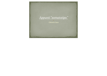 Appunti “somatotipo” Chisotti luca Le Scuole di “costituzionalistica “ hanno sempre tentato di ricondurre la variabilità umana ad alcuni tipi morfologici con caratteristiche strutturali comuni Appunti “somatotipo” Il concetto di somatotipo è stato coniato da Sheldon nel 1940 (varieties of human phisyques) per valutare in modo globale e quantitativo la struttura morfologica individuale. Embriologia Ogni embrione animale a un dato livello di sviluppo presenta tre strati distinti: l'endoderma, il mesoderma e l'ectoderma, ciascuno con specifiche modalità di sviluppo da cui avranno origine tutti i tessuti del corpo umano Georges Dumézil nel 1920 In ambito storico e sociologico, questa suddivisione dei tipi umani trova riscontro nell'ipotesi trifunzionale formulata da Georges Dumézil nel 1920 studioso di miti e costumi di molteplici culture. nelle caste vediche brahmini (sacerdoti), kshatriya (guerrieri) vaishya e shudra (contadini e servi) Karen Horney psichiatra tedesca 1940 individua tre tipi di uomini sulla base di come questi reagiscono ai c o n fl i t t i d e l l a v i t a : q u e l l o compiacente che va incontro agli altri, quello aggressivo che va contro gli altri e, infine, il distaccato che si separa dagli altri. Sheldon attraverso l’analisi e la misurazione nel 1942 ha esposto la sua teoria sui tre tipi costituzionali secondo la predominanza dei rispettivi tratti: endomorfo mesomorfo, ectomorfo. l'endomorfo si caratterizza per un grande sviluppo dell'apparato digerente, soprattutto lo stomaco (endoderma) e facilmente ha una tendenza alla pinguedine, con un corpo morbido e muscoli sottosviluppati; il temperamento è detto viscerotonico. L’Endomorfo è fisicamente abbastanza 'tondo', ed è descritto come ‘amante del divertimento'. il mesomorfo presenta un grande sviluppo dei muscoli e del sistema circolatorio (mesoderma). È correlato al temperamento somatotonico Il mesomorfo è equidistante tra il rotondo endomorfo e il sottile ectomorfo . Fisicamente, possiede il corpo esteticamente più proporzionato l'ectomorfo maggiore sviluppo del sistema nervoso e del cervello (ectoderma) e tendente ad essere magro e longilineo le membra sono lunghe e gracili.. Il loro sviluppo strutturale è maggiore in senso verticale e scarso in senso orizzontale. Presenta facilmente scoliosi o cifosi. La sua morfologia è correlata al temperamento cerebrotonico scheldon 17 misurazioni antropomorfiche valutazione obiettiva visuale peso e all’altezza appartenenza ai 3 diversi somatomorfie da 1 a 7 I morfotipi sarebbero 243 4000 soggetti solo 76 Healt e Carter La variabilità somatotipica umana,, può essere espressa da 13 combinazioni delle componenti, che corrispondono a 13 categorie somatotipiche principali. Nell’ambito sociologico è evidente che le costituzioni fisiche differenti condizionano gli stereotipi culturali. Uno studio ha evidenziato che gli endomorfi sono percepiti come lenti e pigri sociologia i mesomorfi, in opposizione, sono percepiti come gran lavoratori e alla portata di tutti bene accetti sociologia ectomorfi sono visti spesso come intelligenti ma da evitarsi conclusioni Sta a noi interpretare al meglio il soggetto che ci sta i fronte cercando di evitare i preconcetti cercando di evidenziare ogni piccola caratteristica morfologica interpretandone le eventuali interazioni fisiologiche e le ripercussioni si somatiche che psichiche alla base della vita del soggetto. conclusioni Ogni strumento scientifico o empirico che si avvale di fornire mezzi per conoscere l’altro è da utilizzare con criterio e razionalità per non cadere nel “pre-‐giudizio” ma in quanto strumento, utile ad incrementare una comunicazione efficace ”in tempi come questi, la fuga è l'unico mezzo per mantenersi vivi e continuare a sognare..." …E per chi resta: buon lavoro!