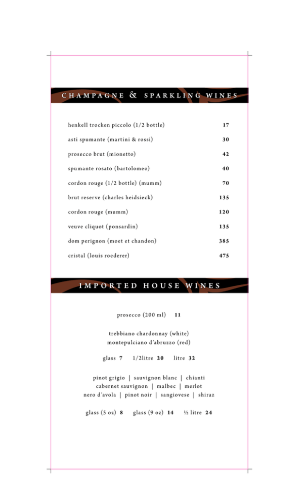 ch a mpagne & spar kling wines hen kel l t rocken piccolo (1/2 bot t le) 17 a st i spu ma nte (ma r t i n i & rossi) 30 prosecco br ut (m ionet to) 42 spu ma nte rosato (ba r tolomeo) 4 0 70 cordon rouge (1/2 bot t le) (mu m m) br ut reser ve (cha rles heid sieck) 135 cordon rouge (mu m m) 12 0 veuve cl iquot (pon sa rd i n) 135 dom per ig non (moet et cha ndon)385 475 c r i st a l (lou i s roederer) imported house wines prosecco (2 0 0 m l) 11 t rebbia no cha rdon nay (w h ite) montepu lc ia no d ’abr u zzo (red) g la ss 7 1/2l it re 2 0 l it re 32 pi not g r ig io | sauv ig non bla nc | ch ia nt i c aber net sauv ig non | ma lbec | merlot nero d ’avola | pi not noi r | sa ng iovese | sh i ra z g la ss (5 oz) 8 g la ss (9 oz) 14 ½ l it re 2 4 white wines 1 w. cha rdon nay “ d rea m s” (jer ma n n–it a ly) 2 w. cha rdon nay (yel low t a i l–au st ra l ia) 27 3 w. cha rdon nay (seven su n s–it a ly) 30 4 w. cha rdon nay (wente –u sa) 38 5 w. c h a rdon n ay reser ve vqa (m i ssion h i l l–bc) 40 6 w. cha rdon nay sonoma (la c rema–u sa) 65 7 w. cha rdon nay venez ia g iu l ia (jer ma n n-it a ly) 72 8 w. gew u r zt ra m i ner vqa (bla sted chu rch–bc) 35 9 w. g reco d i t u fo (feud i sa n g regor io –it a ly) 62 10 w. i nycon f ia no (set tesol i–it a ly) 30 11 w. luga na (z enato –it a ly) 75 12 w. pi not g r i s vqa (geh r i nger–bc) 32 13 w. pi not g r ig io le r i me (ba n f i–it a ly) 34 14 w. pi not g r ig io v a l d ’ad ige 24 (sa nt a ma rg her it a–it a ly) 375 m l 15 w. pi not g r ig io v a l d ’ad ige (sa nt a ma rg her it a–it a ly) 4 0 16 w. pi not g r ig io venez ia g iu l ia (jer ma n n–it a ly) 76 17 w. pou i l ly-f u i sse (cha r t ron & t rebuchet–f ra nce) 70 18 w. r iesl i ng vqa (pel ler est ates–bc) 2 8 19 w. sauv ig non bla nc (er ra z u r i z– ch i le) 30 20 w. sauv ig non bla nc (oy ster bay–new z ea la nd) 40 21 w. sem i l lon-sauv ig non bla nc “cla nc y ’s” (peter leh ma n n–au st ra l ia) 34 22 w. soave cla ssico “ lev a r ie” (ma si–it a ly) 32 23 w. t rebbia no (ma sc ia rel l i–it a ly) 32 24 w. verd icch io (fa z i bat t ag l ia-it a ly) 31 25 w. v i nt age t u n i na bia nco (jer ma n n-it a ly) 16 0 16 0 reds from around the world 1. a ma lay a v i no t i nto de a lt u ra (botega a ma lay a–a rgent i na) 2. c a b e r ne t-me r lot vqa (bla sted chu rch–bc) 3. c a b e r ne t s au v i g non yel low label (wol f bla ss–au st ra l ia) 375 m l 4. c a b e r ne t s au v i g non (j. loh r–u sa) 375 m l 5. c a b e r ne t s au v i g non reser ve (yel low t a i l–au st ra l ia) 6. c a b e r ne t s au v i g non (kend a l l jack son–u sa) 7. c a b e r ne t s au v i g non (sera f i no –au st ra l ia) 50 8. c a b e r ne t s au v i g non (rod ney st rong–u sa) 50 9. c a b e r ne t s au v i g non (bu r row i ng ow l–bc) 76 10. c a b e r ne t s au v i g non (f u se –u sa) 11. c a b e r ne t s au v i g non (duck hor n–u sa) 14 0 12. c a b e r ne t s au v i g non ma r i ly n 19 9 9 (napa v a l ley–u sa) 10 0 13. c a b e r ne t s au v i g non “ i n sig n ia” (joseph phelps–u sa) (19 9 4) 80 0 14. c a b e r ne t/c a r me ne re orga n ic (cono su r– ch i le) 32 15. chateau neu f du pape (la foi le –f ra nce) 85 16. corbec cor v i na/m a l be c (ma si–a rgent i na) 80 17. m a l b e c “a la mos” (c atena–a rgent i na) 35 18. ma recha l foch (v i st a d ’oro –bc) 45 19. ma r i ly n merlot (napa v a l ley–u sa) 85 20. me r lot “yel low label ” (wol f bla ss–au st ra l ia) 38 21. me r lot “t wo v i nes” (colu mbia c rest – u sa) 36 22. me r lot vqa (bu r row i ng ow l–bc) 65 23. pi not noi r (seven ter races–new z ea la nd) 45 24. pi not noi r f ive v i ney a rd s vqa (m i ssion h i l l–bc) 38 40 54 22 28 40 50 80 110 25. pi not noi r (shea w i ne cel la rs– oregon u sa) 26. sh i ra z “ black chook ” (woop woop –au st ra l ia) 27. sh i ra z (sera f i no –au st ra l ia) 28. sh i ra z-c ab-pet it verdot (w i r ra w i r ra–au st ra l ia) 29. tor re muga r ioja 19 98 (spa i n) 180 30. z i fa ndel (rod ney st rong–u sa) 50 38 50 3 8 I ta l i a n r e d w i n e s 31. a m a rone “cost a sera” (ma si) (375 m l) 32. a m a rone (bol la) 33. a m a rone “cost a sera” (ma si) 34. a m a rone (br u nel l i) 35. a m a rone del la v a lpol icel la (tom ma si) (375 m l) 36. a m a rone del la v a lpol icel la (tom ma si) 37. a m a rone (sper i) 38. ba r ba re s c o (bat a siolo) 39. ba r ba re s c o (produt tor i) 40. ba rolo (font a na f redd a) 41. ba rolo (bat a siolo) 42. ba rolo “n i r v a sco” (bersa no) 43. ba rolo “ la ser ra” (ma rc a r i n i) 44. ba rolo “ d ag ron i s” (gaja) 45. ba rolo v i r na pred a sa r ma ssa (2 0 0 6) 46. br u ne l lo d i mont a lc i no (c a na l icch io d i sopra) 375 m l 55 10 0 105 110 60 12 0 16 0 62 86 80 80 10 0 110 14 0 150 68 47. br u ne l lo d i mont a lc i no (scopone) 48. br u ne l lo d i mont a lc i no c a stelg iocondo (f rescoba ld i) 95 110 I ta l i a n r e d w i n e s 49. br u ne l lo d i mont a lc i no (c a stel lo ba n f i) 130 50. br u ne l lo d i mont a lc i no (i l pog g ione) 130 51. br u ne l lo d i mont a lc i no “pia n del le v ig ne” (a nt i nor i) 52. 150 br u ne l lo d i mont a lc i no “ luce” 2 0 05 & 2 0 0 8 (f rescoba ld i) 230 250 53. br u ne l lo d i mont a lc i no c a stelg iocondo (f rescoba ld i 1. 5 l it re) 54. c a mpo a i sa ssi rosso d i mont a lc i no (f rescoba ld i) 46 55. c a r ig na no/s y ra h (sha rd a na) 70 56. ceu so (mer it age) 57. c h i a nt i r u f i n a r i ser v a “n ippozz a no” (f rescoba ld i) 375 m l 28 58. c h i a nt i r u f i n a r i ser v a “n ippozz a no” (f rescoba ld i) 50 59. c h i a nt i r u f i n a r i ser v a “n ippozz a no” (f rescoba ld i) 1. 5 l it re 95 60. c h i a nt i c l a s s ic o (brol io) 56 61. c h i a nt i c l a s s ic o r i ser v a duc a le (r u f f i no) 62. c h i a nt i c l a s s ic o r i ser v a du