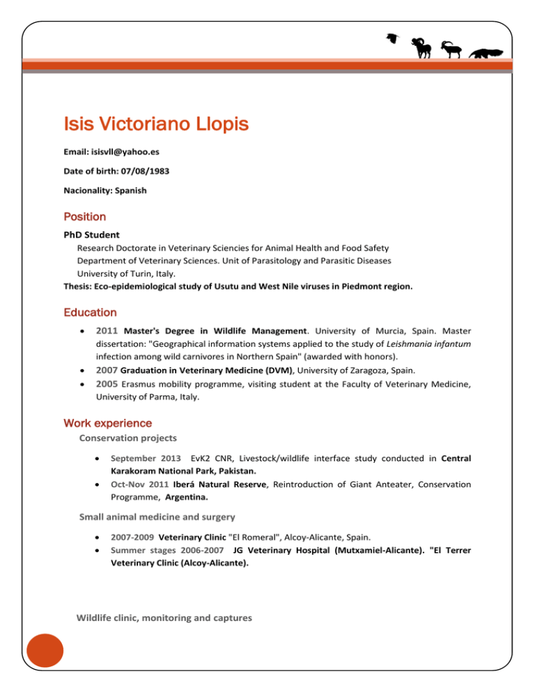 Isis Victoriano Llopis Email: [email protected] Date of birth: 07/08/1983 Nacionality: Spanish Position PhD Student Research Doctorate in Veterinary Sciencies for Animal Health and Food Safety Department of Veterinary Sciences. Unit of Parasitology and Parasitic Diseases University of Turin, Italy. Thesis: Eco-epidemiological study of Usutu and West Nile viruses in Piedmont region. Education 2011 Master's Degree in Wildlife Management. University of Murcia, Spain. Master dissertation: "Geographical information systems applied to the study of Leishmania infantum infection among wild carnivores in Northern Spain" (awarded with honors). 2007 Graduation in Veterinary Medicine (DVM), University of Zaragoza, Spain. 2005 Erasmus mobility programme, visiting student at the Faculty of Veterinary Medicine, University of Parma, Italy. Work experience Conservation projects September 2013 EvK2 CNR, Livestock/wildlife interface study conducted in Central Karakoram National Park, Pakistan. Oct-Nov 2011 Iberá Natural Reserve, Reintroduction of Giant Anteater, Conservation Programme, Argentina. Small animal medicine and surgery 2007-2009 Veterinary Clinic "El Romeral", Alcoy-Alicante, Spain. Summer stages 2006-2007 JG Veterinary Hospital (Mutxamiel-Alicante). "El Terrer Veterinary Clinic (Alcoy-Alicante). Wildlife clinic, monitoring and captures May-June 2011 EEZA Estación experimental de zonas áridas, Almería, CSIC. African gazelle Rescue Park. Tasks: necropsies, captures, sampling collection, teleanesthesia. April 2011 Santa Faz Wildlife Recovery Center Tasks: surgeries, diagnostic, captures and necropsies. April, June, September 2013 Abruzzo National Park (Italy) Sampling and analysis of fecal parasites in Chamois populations. Summer 2011,2012 and 2013 Marmolada Mountains,Italian Alps Captures and sampling of Ibex (Capra Ibex). May-September 2014 Laboratoire Départamental Véterinaire et d'Hygiène Alimentaire des Hautes Alpes (Gap-France) Study of innate inmunity and resistance to keratoconjunctivitis infection in a Chamois population of Pyrenees Park. 2012-2014 Wild birds captures During my PhD framework activities I captured more than one thousand individuals belonging to 90 avian species in the frame of ringing activities and wildlife recovery centers in Piedmont region (Italy). Courses March 2011 Geographical Information Systems (GIS) applied to biological sciences. Autonomous University of Barcelona, Spain. 2008- 2010 Study techniques in Wildlife. CEMACAM Alcoy, Spain. 17 hours. Ecology, ethology and conservation of Iberian carnivores. CEMACAM Murcia. 10 hours Management of threatened species. CEMACAM Alcoy. 14 hours. Avian biodiversity in Mediterranean forest. CEMACAM Alcoy. 14 hours. Medicine and Surgery in small mammals. Veterinary College of Valencia. 16 hours. Technical diagnostics, therapeutics, surgery and anesthesia in small and exotic animals. JG Veterinary Hospital, Mutxamiel Alicante. 30 hours. Research Publications Isis Victoriano Llopis 2 Further circulation of West Nile and Usutu viruses in wild birds in Italy. Victoriano-Llopis I., Rossi L., Di Gennaro A., Mosca A., Teodori L., Tomassone L., Grego E., Monaco F., Lorusso A., Savini G. Infect Genet Evol. 2015 Mar 27;32:292-297. doi: 10.1016/j.meegid.2015.03.024 Evidence for widespread Leishmania infantum infection among wild carnivores in L. infantum periendemic northern Spain. Del Río L., Chitimia L., Cubas A., Victoriano I., De la Rúa P., Gerrikagoitia X., Barral M., Muñoz-García CI., Goyena E., García-Martínez D., Fisa R., Riera C., Murcia L., Segovia M., Berriatua E. Prev Vet Med. 2014 Mar 1;113(4):430-5. Posters Sieroprevalenza dei virus Usutu e West Nile nell’avifauna della regione piemonte nel 20122013. Victoriano Llopis I., Rossi L., Mosca A., Di Gennaro A., Teodori L., Monaco F., Lorusso A., Savini G. V Workshop Nazionale di Virologia Veterinaria. Istituto Superiore di Sanità. Teramo, 26-27 Giugno 2014. Pre-analytical bias may severely compromise the reliability of parasitological data from faecal samples in chamois and other mountain dwelling ungulates. Victoriano Llopis I., Díaz Alcázar E., Molinar-Min A., De Meneghi D., Rossi L. II International Rupicapra Symposium. Biology, Health, Monitoring and Management. Bellver de Cerdenya (Catalonia,Spain). 24-25 0ctober 2013 Abstracts Serological investigation of Usutu and West nile viruses in wild and domestic birds in Northwestern Italy, 2012-2014. Victoriano Llopis I, Rossi L, Tomassone L., Grego E., Mosca A., Silvano F., Di Gennaro A., Teodori L., Lorusso A., Savini G. 2nd Conference on Neglected Vectors and Vector-Borne Diseases Izmir, Turkey, March 31st 2015. Leishmania infantum infection in wild carnivores in northern Spain, a traditionally nonendemic area for canine Leishmaniosis. Chitimia L., Victoriano I., del Río L., Gerrikagoitia X., Barral M., Lizana V., Rigueira L., Fidalgo, L., Sánchez-Isarria MA., Sanchis-Monsonís G., García-Bacete I., Murcia L., Segovia M., Berriatua E. 2011 Annual meeting of the European College of Veterinary Parasitology. Zagreb, 16-17 June. Epidemiological study of bovine cysticercosis in a traditionally endemic area in Piedmont. Martano G., Rossi L., Voghera M., Serra G., Molinar Min A., Victoriano Llopis I., Rambozzi L. Società Italiana di Parassitologia. XXVII Congresso Nazionale. Alghero 26-29 Giugno 2012. Indagini copro-microscopiche sul camoscio d’Abruzzo (Rupicapra pyrenaica ornata): risultati preliminari. Diaz Alcazar E., Molinar Min A., Victoriano Llopis I., Rambozzi L., Martínez-Carrasco C., Gentile L., Rossi L. GEEFSM. Cauterets 20-23/settembre 2012. Evidences of Mosquito-transmitted Flavivirus circulation in Piedmont, North-Western Italy. Mosca A., Victoriano Llopis I., Bertolotti L., Pautasso A., Roberto P., Rossi L., Giacobini M., Casalone C., Radaelli MC.. DOI: 10.13140/2.1.3645.6968 Conference: E-SOVE 2014 - the 19th Conference, At Thessaloniki - Greece. Parasitological Survey of the Apennine Chamois Pop