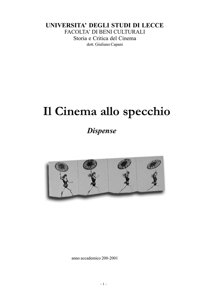 UNIVERSITA’ DEGLI STUDI DI LECCE FACOLTA’ DI BENI CULTURALI Storia e Critica del Cinema dott. Giuliano Capani Il Cinema allo specchio Dispense anno accademico 200-2001 -1- Indice Introduzione 3 Meta in Italy 4 Psicologia dello spettatore: aspetti dinamici 11 Grammatica cinematografica e percezione dello spettatore 21 Carteggio Reich - Ejzenstejn 27 La percezione nel Cinema 31 Il Cinema secondo “Effetto notte” di F. Truffaut 34 Alcune riflessioni sul montaggio cinematografico 36 La nozione di montaggio in R. Arnheim e S.M. Ejzenstein 49 Appendice 58 Manifesto dell’Asincrono 59 Schede: “Sotto gli ulivi” di A. Kiarostami 61 “Effetto Notte” di F. Truffaut 65 -2- Introduzione Il cinema nel cinema. Questo il tema del Corso monografico dell’ accademico 2000-2001: il che cinema riflette su se stesso, parla di se stesso e sembra svelare i retroscena, i backstage, cosa succede dietro la macchina da presa, quali sono le forze in campo che determinano le scelte stilistiche di registi e operatori, ma anche come il cinema determina i loro comportamenti, in che maniera si inserisce e modifica la vita di chi lo fa. I film che hanno come soggetto il cinema a volte parlano del fenomeno cinema in generale (come Nitrato d’argento di M. Ferreri, Effetto notte di F. Trouffaut, Good Morning Babilonia di P. e V. Taviani) ce ne svelano i segreti, la storia, le abitudini, le reazioni del pubblico; altre volte focalizzano l’attenzione principalmente su uno specifico elemento: il fascino del cinema come fabbrica dei sogni, delle aspirazioni ad una vita felice ed ideale e il conseguente impatto traumatico che l’interazione con la macchina cinema provoca nella vita reale (come Bellissima di L. Visconti, L’uomo delle stelle di G. Tornatore, o Sotto gli ulivi di A. Kiarostami). Celluloide di C. Lizzani poi racconta il farsi del film: Roma città aperta di R. Rossellini documentandone con pignoleria il percorso produttivo e le vicende storico artistiche del primo film neorealista. Nuovo cinema paradiso di G. Tornatore è un vero e proprio omaggio al cinema in un momento di profonda crisi che le sale stavano attraversando. La rosa purpurea del Cairo di W. Allen ci fa piombare in uno spazio onirico senza ritorno, nel quale spettatori e attori entrano ed escono dallo schermo rincorrendo le proprie ombre. Ma è con Fellini 8½ che il cinema riflette se stesso come in un gioco di scatole cinesi. È il primo film autoreferenziale nel senso che non parla del cinema o di un altro film, ma proprio del film che si sta facendo nel momento stesso in cui le riprese vengono effettuate. Nei film che parlano del cinema assistiamo ad una sorta di espansione virtuale dell’inquadratura. Tutto ciò che nel film non viene inquadrato, perché parte dell’apparato produttivo, si manifesta allo spettatore operando una sorta di sfondamento del quadro che ci permette, da una parte di inoltrarci nei territori dell’universo cinema, dall’altra di invertire la rotta tra il guardare ed essere guardati. Il corso di quest’anno ci offre l’opportunità di avvicinarci al cinema in maniera più diretta, non parleremo solo di registi e di film, ma sarà affrontato il fenomeno cinema come un universo nel quale concorrono varie forze, esterne (lo spettatore) ed interne, (l’apparato cinematografico) a determinarlo. Si parla, dunque, in queste dispense, del cinema e la sua grammatica, dei presupposti tecnici e biofisiologici del montaggio, dei fenomeni psichici percettivi che ne sono alla base. Di tutte quelle tematiche, dunque, che costituiscono la struttura portante di questa arte nuovissima a soli cent’anni della sua nascita. L’idea di offrire agli studenti un approccio al cinema in profondità, andando oltre una pedante storicità, nasce dalla considerazione che per la comprensione di questa particolare arte è più efficace smontarne la scatola produttiva per ‘incorporarla’ nella propria esperienza. Gli studenti, infatti, oltre che studiarne la storia, quest’anno hanno organizzato un cineforum e si apprestano a realizzare dei ‘corti’ con le loro telecamere amatoriali. Questa esigenza di provarsi con la ‘macchina cinema’ alla luce delle esperienze di studio svolte forse sta a significare che i percorsi di conoscenza non possano prescindere dall’azione. Crediamo, infatti, che l’uomo non debba soltanto sapere, ma anche saper fare. Giuliano Capani -3- META IN ITALY In questo articolo Marcello Walter Bruno traccia un percorso storico sui film che hanno per soggetto il cinema. Ci sembra estremamente interessante proporlo in apertura di queste dispense per avere subito un panorama abbastanza completo su questo tema. La via nazionale al cinema sul cinema Trent’anni di riflessioni cinematografiche: da 8 ½ a Nuovo Cinema Paradiso di Marcello Walter Bruno Il metacinema moderno è nato in Italia nel 1963, con un’opera firmata e numerata: Fellini 8 ½ Fellini 8 ½ è un film autoreferenziale fin dal titolo: si tratta, infatti, dell’opera che nella filmografia di Fellini arriva dopo sei lungometraggi, due episodi e il film d’esordio firmato a metà con Lattuada. Ma l’autoreferenzialità, come ha notato Cristian Metz nel suo saggio contenuto in Semiologia del cinema (Garzanti, Milano 1972), si spinge al punto di fare di 8 ½ il primo vero caso di “costruzione in abisso” di tutta la storia del cinema: “Non abbiamo soltanto un film sul cinema, ma un film su un film che a sua volta verte sul cinema; non soltanto un film su un cineasta, ma un film su un cineasta che riflette egli stesso sul proprio film. Una cosa è mostrare, in un film, un secondo film il cui soggetto non ha o ha pochi rapporti con quello del primo (Le silence est d’or di Renoir); un’altra cosa è invece parlare, in un film, di questo stesso film mentre si va facendo. Una cosa è presentare, in un film, il personaggio di un cineasta che si limita a evocare debolmente, o soltanto a tratti, l’autore del vero film (Prigione d