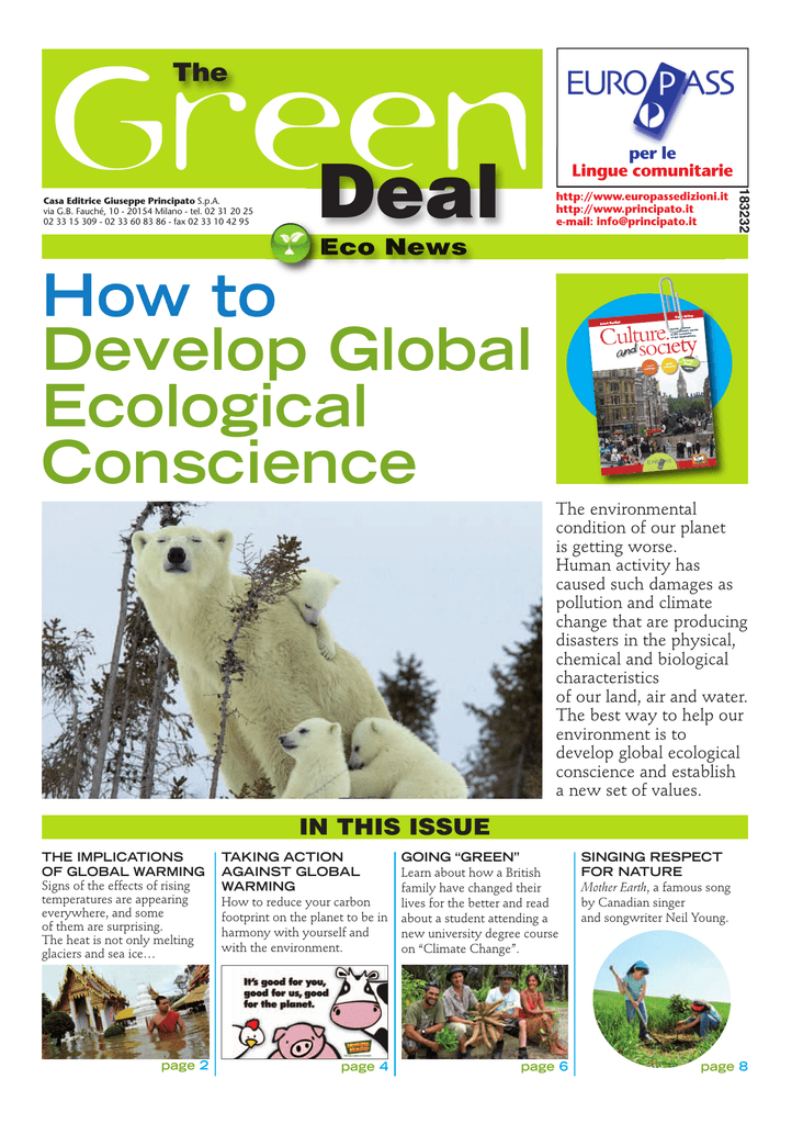 Green Deal The http://www.europassedizioni.it http://www.principato.it e-mail: [email protected] Eco News How to Develop Global Ecological Conscience 1 10:47 Pagina Layout 1 10/11/11 Culture_2012_cop_ 183232 Casa Editrice Giuseppe Principato S.p.A. via G.B. Fauché, 10 - 20154 Milano - tel. 02 31 20 25 02 33 15 309 - 02 33 60 83 86 - fax 02 33 10 42 95 per le Lingue comunitarie r M Katy Mille Caunlltd usoreecie i tyy inii ellin Bell Anna Be ral ural Social, cultu trend s m mic trends and econo ries tries in the count spherre osphe Ang osph of the Anglo The Cultural ss wareneess aawaren I sues Issues inn the news Gree Gre en n Deal Dea magazine Li M bro lib libro isto misto m The environmental condition of our planet is getting worse. Human activity has caused such damages as pollution and climate change that are producing disasters in the physical, chemical and biological characteristics of our land, air and water. The best way to help our environment is to develop global ecological conscience and establish a new set of values. IN THIS ISSUE THE IMPLICATIONS OF GLOBAL WARMING Signs of the effects of rising temperatures are appearing everywhere, and some of them are surprising. The heat is not only melting glaciers and sea ice… page 2 TAKING ACTION AGAINST GLOBAL WARMING How to reduce your carbon footprint on the planet to be in harmony with yourself and with the environment. page 4 GOING “GREEN” Learn about how a British family have changed their lives for the better and read about a student attending a new university degree course on “Climate Change”. page 6 SINGING RESPECT FOR NATURE Mother Earth, a famous song by Canadian singer and songwriter Neil Young. page 8 Green Deal The The implications of global warming The planet is warming, from North Pole to South Pole, and everywhere in between. ABRIDGED FROM Water and disasters, UN, World Meteorological Organization, Geneva) Climate change is a monumental challenge1 to human adaptability. Earth’s climate is a marvel of equilibrium involving a host2 of interactions and processes between the atmosphere, oceans, land surfaces, ice sheets3 and biosphere. This system is driven by energy from the sun which is naturally balanced, as the Earth eventually re-emits solar energy back to space. The problem now is that during the last half-century, land clearance4 and emissions from industry, cars and other sources have overloaded5 the atmosphere with greenhouse6 gases and effectively turned up the heat. This disruption7 from the natural climatic balance is KYOTO AND COPENHAGEN CONFERENCES ON The first conference on climate change took place in Kyoto, Japan, in 1997. There, developed countries agreed to specific targets for cutting their emissions of greenhouse gases. Industrialized countries agreed to an overall reduction of emissions of greenhouse gases to 5.2% below 1990 levels for the period 2008-2012. But the USA – as the largest CO2 producer worldwide – and most developing countries refused to sign this agreement. In 2009 more than 40,000 representatives of governments and nongovernmental organizations descended upon Copenhagen, Denmark, for an historic climate conference in order to draw13 a comprehensive, fair, and ambitious treaty that replaced the emissions reduction mechanisms of the Kyoto Protocol. Unfortunately the delegates did not reach a binding14 agreement. fuelling some extreme weather events, such as floods, droughts8, storms, heat waves. There are, of course, a number of natural causes driving climate change, including variations in the amount of energy from the sun, volcanic eruptions, asteroid impacts and slow shifts9 in the circulation and temperature of the oceans. However, the human input is likely to have the more responsibility: levels of carbon dioxide and other greenhouse gases are constantly increasing. A global scenario is therefore emerging. A warmer world means a wetter one, so the northern part of the Northern Hemisphere will probably see even more storms, and some continental areas will have drier sumActivities 2 climate change 1. Read the text about global warming and say if the following statements are true (T) or false (F). 1. Climate depends on the interactions of the earth’s surface, atmosphere, and biosphere. 2. This natural balance has been broken during the last ten years. 3. Changes in climate are mostly due to greenhouse gases. T F T F T F mers and more risk of drought. Sea levels could rise, in part fed by melt10 water from glaciers and ice caps11. Along with this, extreme high-water levels may occur with increasing frequency. Higher sea levels could cause flooding of coastal lowlands, and erode sand dunes. All in all, it is a bleak12 picture. 1. challenge: sfida 2. a host: un gran numero 3. sheets: coltri 4. clearance: deforestazione 5. overloaded: sovraccaricato 6. greenhouse: serra 7. disruption: sconvolgimento 18. droughts: siccità 19. shifts: cambiamenti 10. melt: sciolta 11. ice caps: calotte di ghiaccio 12. bleak: desolante 13. to draw: stilare 14. binding: vincolante 4. The Earth’s temperature has decreased in the last half century. 5. Floods, droughts, storms, heat waves are effects of climate change. 6. The human factor is most responsible for global warming. 7. Asteroid impacts may produce greenhouse gases. 8. The melting of glaciers is going to cause floods. T F T F T F T F T F Develop Global Ecological Conscience Effects of global warming ANNUAL GREENHOUSE GAS EMISSIONS BY SECTOR Industrial processes 16,8% Power stations 21,3% ADAPTED FROM National Geographic Rising temperatures would raise sea levels reducing supplies of fresh water as flooding occurs along coastlines world wide and saltwater reaches inland. Many of the world’s endangered species would become extinct if rising temperatures changed their habitat. Transportation fuels 14,4% Waste disposal3 and treatment 3,4% Agricultural byproducts1 12,5% Fossil fuel retrieval,2 processing, and distribution 11,3% Land use