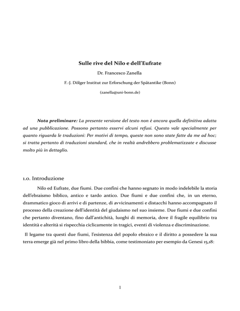 Sulle rive del Nilo e dell’Eufrate Dr. Francesco Zanella F.-J. Dölger Institut zur Erforschung der Spätantike (Bonn) ([email protected]) Nota preliminare: La presente versione del testo non è ancora quella definitiva adatta ad una pubblicazione. Possono pertanto esservi alcuni refusi. Questo vale specialmente per quanto riguarda le traduzioni: Per motivi di tempo, queste non sono state fatte da me ad hoc; si tratta pertanto di traduzioni standard, che in realtà andrebbero problematizzate e discusse molto più in dettaglio. 1.0. Introduzione Nilo ed Eufrate, due fiumi. Due confini che hanno segnato in modo indelebile la storia dell’ebraismo biblico, antico e tardo antico. Due fiumi e due confini che, in un eterno, drammatico gioco di arrivi e di partenze, di avvicinamenti e distacchi hanno accompagnato il processo della creazione dell'identità del giudaismo nel suo insieme. Due fiumi e due confini che pertanto diventano, fino dall'antichità, luoghi di memoria, dove il fragile equilibrio tra identità e alterità si rispecchia ciclicamente in tragici, eventi di violenza e discriminazione. Il legame tra questi due fiumi, l’esistenza del popolo ebraico e il diritto a possedere la sua terra emerge già nel primo libro della bibbia, come testimoniato per esempio da Genesi 15,18: 1 Gen 15,18 ביום ההוא כ רת י הו ה את א ב רם ב רית לאמרIn quel giorno il Signore fece un patto con -עך נ ת תי את ה א רץ הזאת מנ הר מ צ רי ם עד# לז רAbramo, dicendo: “Io do alla tua פ רת-ר הנ הר הג ד ל נ הdiscendenza questo paese, dal fiume d’Egitto al gran fiume, il fiume Eufrate”. Due fiumi, due confini, due punti cardinali. Da un lato, ad ovest, il Nilo. Il Nilo è il fiume dell’Egitto, con cui gli Israeliti fin dall'inizio della loro storia ebbero legami strettissimi. In Egitto, sulle rive del Nilo, arrivò secondo Gen 12,10 Abramo alla fine del suo peregrinare, per poi ritornare nel Negeb; in Egitto fu portato Giuseppe, dopo essere stato venduto (Gen 39ff); in Egitto andarono gli Israeliti su ordine del Signore, secondo Gen 46,1, per poi fuggirne, o meglio, esserne tratti fuori, in quel momento fondante della loro storia che si chiama, appunto, Esodo. Dall´altro lato, ad est, c'è l’Eufrate, insieme con il Tigri parte della Mesopotamia. L'Eufrate è il fiume della Babilonia, ovvero di quella Assiria prima e di quella Persia poi che rappresentano non solo la destinazione degli Esuli dopo la distruzione del primo Tempio (nel VI secolo avanti Cristo) ma anche, e soprattutto, la culla degli Amoraim di Babilonia. È proprio tra le rive dell’Eufrate e del Tigri e tra i loro canali che sorgono città come Sura, Pumbedita, Mahoza: proprio sulle rive dell'Eufrate fioriscono, a partire dall'epoca tardoantica, scuole e accademie rabbiniche che portano alla formazione della tradizione talmudica babilonese, la più autorevole. Tra questi due fiumi, il Nilo e l'Eufrate, si è consumata nel corso dei millenni la storia, molto spesso tragica, dell'antico Israele. Questa storia viene esemplarmente riassunta dal libro di Giosuè 24,2/5: Giosuè 24,2/5 ה־א (מר י הו 'ה עם *כ+ ל־ה ל־כ הוש ע א .- אמר י י0 ו Giosuè ם1 יכ ות א *ב# בו3 הר י ש+ ב ע (בר הנ4 להי י ש ר אל ( א7 “Così dice il Signore, Dio d'Israele: דו8 חור ו י ע ב9 א (בי נ# הם ו8 א ;בי א ב ר# עולם <ת רח = *מ א ח *רים׃# להים ; א7 ם מ ע (בר הנ =הר1 ת־א ב ר ה ם א3ת־א ב יכ # א קח אA ו 2 disse a tutto il popolo: 'Nei tempi antichi i vostri padri, tra cui Terach, padre di Abramo e padre di Nacor, abitavano oltre il fiume. Essi servivano altri dèi. ען ו א רב* את־ז ר =עו9 ל־א רץ כ נ ( אותו ב כ 8 אולך ; ו Io presi Abramo, vostro padre, da oltre il ו את־י צ *חק׃8ו *א תן־ל Fiume e gli feci percorrere tutta la terra di שו- תן ל ע0 שו ו א9 ת־ע קב ו א8 ע# ו א (תן לי צ =חק *את־י Canaan. Moltiplicai la sua discendenza e gli diedi Isacco. יו י ר ;דו8וב נ ע ;קב# אותו ו י = יר ל (ר שת1 ת־הר ש ע 3 א A Isacco diedi Giacobbe ed Esaù; assegnai מ צ *רי ם׃ a Esaù il possesso della zona montuosa di ר ן ו א (גף את־1 ה# ת־א שה ו *א3 לח את־מG ו א ש אתי הוצ ; חר8 בו ו א9 יתי ב ק ר ש8 א ;שר ע# מ צ =רי ם כ א ת *כם׃ Seir, mentre Giacobbe e i suoi figli scesero in Egitto. In seguito mandai Mosè e Aronne e colpii l'Egitto con le mie azioni in mezzo a esso, e poi vi feci uscire.'” Questa rielaborazione della storia dell'antico Israele, che diventerà il nucleo della più tarda “Haggada di Pesach”, non cita l'esilio dopo la prima distruzione del Tempio, quando gli Israeliti furono costretti a tornare proprio a quei fiumi dai quali i loro padri furono partiti. Il cerchio, in questo senso, viene chiuso inequivocabilmente dal Salmo 137. Salmo 137, 1/4 רנו+ בז כH כינו9 ם־ב ש בנו גI בל (שם י+ רות ׀ ב0 ה# ;על נ ת־צי* ון׃ א רותינו׃ * לינו כנ+ תH תוכה 9 ל־ע ר ;בים ב # *ע תול ל(ינו י־שיר ו I שובינו ד ב ר M ונוNשם *ש אל0 כי3 לנו מ ;שיר צי* ון׃H + חה ;שירו9 ש מ על א ד ;מת נ *כר׃H+ ה9הו ת־שיר־י איך נ ;שיר א+ Lungo i fiumi di Babilonia, là sedevamo e piangevamo ricordandoci di Sion. Ai salici di quella terra appendemmo le nostre cetre, perché là ci chiedevano parole di canto coloro che ci avevano deportato, allegre canzoni, i nostri oppressori: “Cantateci canti di Sion!“. Come cantare i canti del Signore in terra straniera? E la storia continua anche in età postbiblica e rabbinica, con altri arrivi e altre partenze. Lo scopo del mio intervento di oggi è cercare di tracciare l’immagine di questi due fiumi e la loro ricezione nei testi ebraici antichi, partendo dalla Bib