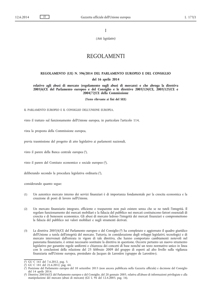 12.6.2014 IT Gazzetta ufficiale dell’Unione europea L 173/1 I (Atti legislativi) REGOLAMENTI REGOLAMENTO (UE) N. 596/2014 DEL PARLAMENTO EUROPEO E DEL CONSIGLIO del 16 aprile 2014 relativo agli abusi di mercato (regolamento sugli abusi di mercato) e che abroga la direttiva 2003/6/CE del Parlamento europeo e del Consiglio e le direttive 2003/124/CE, 2003/125/CE e 2004/72/CE della Commissione (Testo rilevante ai fini del SEE) IL PARLAMENTO EUROPEO E IL CONSIGLIO DELL’UNIONE EUROPEA, visto il trattato sul funzionamento dell’Unione europea, in particolare l’articolo 114, vista la proposta della Commissione europea, previa trasmissione del progetto di atto legislativo ai parlamenti nazionali, visto il parere della Banca centrale europea (1), visto il parere del Comitato economico e sociale europeo (2), deliberando secondo la procedura legislativa ordinaria (3), considerando quanto segue: (1) Un autentico mercato interno dei servizi finanziari è di importanza fondamentale per la crescita economica e la creazione di posti di lavoro nell’Unione. (2) Un mercato finanziario integrato, efficiente e trasparente non può esistere senza che se ne tuteli l’integrità. Il regolare funzionamento dei mercati mobiliari e la fiducia del pubblico nei mercati costituiscono fattori essenziali di crescita e di benessere economico. Gli abusi di mercato ledono l’integrità dei mercati finanziari e compromettono la fiducia del pubblico nei valori mobiliari e negli strumenti derivati. (3) La direttiva 2003/6/CE del Parlamento europeo e del Consiglio (4) ha completato e aggiornato il quadro giuridico dell’Unione a tutela dell’integrità del mercato. Tuttavia, in considerazione degli sviluppi legislativi, tecnologici e di mercato intervenuti dall’entrata in vigore di tale direttiva, che hanno comportato cambiamenti notevoli nel panorama finanziario, è ormai necessario sostituire la direttiva in questione. Occorre pertanto un nuovo strumento legislativo per garantire regole uniformi e chiarezza dei concetti di base nonché un testo normativo unico in linea con le conclusioni della relazione del 25 febbraio 2009 del gruppo di esperti ad alto livello sulla vigilanza finanziaria nell’Unione europea, presieduto da Jacques de Larosière («gruppo de Larosière»). (1) GU C 161 del 7.6.2012, pag. 3. (2) GU C 181 del 21.6.2012, pag. 64. (3) Posizione del Parlamento europeo del 10 settembre 2013 (non ancora pubblicata nella Gazzetta ufficiale) e decisione del Consiglio del 14 aprile 2014. (4) Direttiva 2003/6/CE del Parlamento europeo e del Consiglio, del 28 gennaio 2003, relativa all’abuso di informazioni privilegiate e alla manipolazione del mercato (abusi di mercato) (GU L 96 del 12.4.2003, pag. 16). L 173/2 IT Gazzetta ufficiale dell’Unione europea 12.6.2014 (4) È necessario stabilire un quadro più uniforme e più rigoroso per tutelare l’integrità del mercato ed evitare il rischio di potenziale arbitraggio normativo, garantire l’assunzione di responsabilità in caso di tentata manipolazione e offrire maggiore certezza del diritto e ridurre la complessità normativa per i partecipanti al mercato. Il presente regolamento intende contribuire in modo determinante al corretto funzionamento del mercato interno e dovrebbe pertanto basarsi sull’articolo 114 del trattato sul funzionamento dell’Unione europea (TFUE), come interpretate in modo costante nella giurisprudenza della Corte di giustizia dell’Unione europea. (5) Per eliminare i residui ostacoli agli scambi e le notevoli distorsioni della concorrenza derivanti dalle divergenze tra le normative nazionali ed evitare l’insorgere di ulteriori ostacoli agli scambi e notevoli distorsioni della concor renza, occorre quindi adottare un regolamento che stabilisca un’interpretazione più uniforme del quadro del l’Unione in materia di abusi di mercato, definendo in modo più chiaro le regole applicabili in tutti gli Stati membri. Adottare la forma del regolamento per le norme relative agli abusi di mercato garantirà che tali norme siano direttamente applicabili. Ciò assicura inoltre condizioni uniformi impedendo che vengano adottate norme nazionali divergenti in conseguenza del recepimento di una direttiva. Il presente regolamento imporrà un’appli cazione uniforme delle stesse regole in tutta l’Unione. Esso ridurrà inoltre la complessità normativa e le spese di adeguamento alla stessa per le società che operano su base transfrontaliera, contribuendo così a eliminare le distorsioni della concorrenza. (6) La comunicazione della Commissione del 25 giugno 2008 sullo «Small Business Act» per l’Europa invita l’Unione e gli Stati membri a definire regole secondo il principio «Pensare anzitutto in piccolo» (Think Small First), riducendo gli oneri amministrativi, adeguando la normativa alle esigenze degli emittenti sui mercati per le piccole e medie imprese (PMI) e agevolando l’accesso al finanziamento di tali emittenti. Numerose disposizioni della direttiva 2003/6/CE impongono agli emittenti oneri amministrativi che occorre ridurre, con particolare riguardo agli emittenti i cui strumenti finanziari sono ammessi alla negoziazione sui mercati di crescita per le PMI. (7) Abuso di mercato è il concetto che comprende le condotte illecite nei mercati finanziari e ai fini del presente regolamento dovrebbe essere inteso come abuso di informazioni privilegiate, comunicazione illecita di informa zioni privilegiate e manipolazione del mercato. Tali condotte impediscono una piena ed effettiva trasparenza del mercato, che è un requisito fondamentale affinché tutti gli attori economici siano in grado di operare su mercati finanziari integrati. (8) L’ambito di applicazione della direttiva 2003/6/CE si concentra sugli strumenti finanziari ammessi alla negozia zione su un mercato regolamentato o per i quali sia stata richiesta l’ammissione alla negoziazione su un mercato regolamentato. Tuttavia, negli ultimi anni gli strumenti finanzia