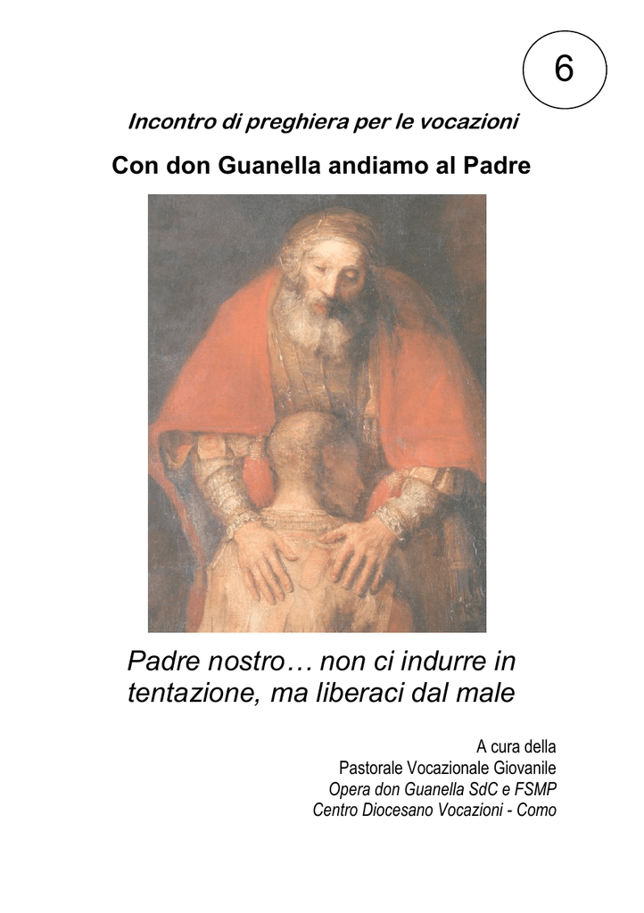 6 Incontro di preghiera per le vocazioni Con don Guanella andiamo al Padre Padre nostro… non ci indurre in tentazione, ma liberaci dal male A cura della Pastorale Vocazionale Giovanile Opera don Guanella SdC e FSMP Centro Diocesano Vocazioni - Como 2 Mentre viene introdotta processionalmente l’Icona, si canta CANTO In piedi Padre nostro ascoltaci: con il cuore ti preghiamo! Resta sempre accanto a noi: confidiamo in te! La tua mano stendi sopra tutti i figli tuoi: il tuo regno venga in mezzo a noi. (bis) Per il pane d’ogni dì, per chi vive e per chi muore per chi piange in mezzo a noi, noi preghiamo te! Per chi ha il cuore vuoto, per chi ormai non spera più: per chi amore non ha visto mai. (bis) Se nel nome di Gesù con amore perdoniamo, anche tu che sei l’Amore ci perdonerai. La tristezza dentro al cuore non ritornerà: nel suo nome gioia ognuno avrà. (bis) C.: Nel nome del Padre, del Figlio e dello Spirito santo T: Amen. C.: Il Signore, che guida i nostri cuori nell’amore e nella pazienza di Cristo, sia con tutti voi. T.: E con il tuo spirito. L.: “Non ci indurre in tentazione”: la traduzione più consona dice “Non lasciarci cadere nella tentazione”, cioè non abbandonarci alla paura delle nostre responsabilità, di deciderci. E’ la paura ad affrontare i problemi della vita, della comunità, della nostra società. E’ la tentazione della fuga dal reale, di chiudere gli occhi, di nascondersi, di far finta di non vedere e non sentire per non essere coinvolti. 3 Vogliamo chiedere la capacità di comprometterci, di saper scegliere in modo deciso per il Padre, nelle piccole scelte della quotidianità e nella grande scelta di vita che è la nostra vocazione, che chiede di essere rinnovata ogni giorno. Portiamo questo desiderio di impegno sincero davanti all’Eucaristia che viene esposta alla nostra adorazione. CANTO DI ESPOSIZIONE Cristo Gesù, Salvatore, tu sei Parola del Padre, qui ci raduni insieme, tu! qui ci raduni insieme. Spirito, forza d’amore, tu bruci l’odio tra i popoli, qui ci farai fratelli, tu! qui ci farai fratelli. Cuore di Cristo Signore, tu cambi il cuore dell’uomo, qui ci perdoni e salvi, tu! qui ci perdoni e salvi. Pane, spezzato alla cena, corpo del Cristo vivente, in te restiamo uniti, in te! in te restiamo uniti. Vino, versato ai discepoli, sangue di un Dio crocifisso, in te la nostra gioia, in te! in te la nostra gioia. SILENZIO E RIFLESSIONE PERSONALE sottofondo musicale ACCLAMAZIONE ALLA PAROLA Nella tua Parola, noi, camminiamo insieme a Te: ti preghiamo, resta con noi. (2 v.) Luce dei miei passi guida al mio cammino è la tua Parola 4 PROCLAMAZIONE DELLA PAROLA (Mt 4, 1-11) C.: Il Signore sia con voi T.: E con il tuo spirito C.: Dal vangelo secondo Matteo T.: Gloria a te, o Signore Allora Gesù fu condotto dallo Spirito nel deserto per esser tentato dal diavolo. E dopo aver digiunato quaranta giorni e quaranta notti, ebbe fame. Il tentatore allora gli si accostò e gli disse: «Se sei Figlio di Dio, dì che questi sassi diventino pane». Ma egli rispose: «Sta scritto: Non di solo pane vivrà l'uomo, ma di ogni parola che esce dalla bocca di Dio». Allora il diavolo lo condusse con sé nella città santa, lo depose sul pinnacolo del tempio e gli disse: «Se sei Figlio di Dio, gettati giù, poiché sta scritto: Ai suoi angeli darà ordini a tuo riguardo, ed essi ti sorreggeranno con le loro mani, perché non abbia a urtare contro un sasso il tuo piede». Gesù gli rispose: «Sta scritto anche: Non tentare il Signore Dio tuo». Di nuovo il diavolo lo condusse con sé sopra un monte altissimo e gli mostrò tutti i regni del mondo con la loro gloria e gli disse: «Tutte queste cose io ti darò, se, prostrandoti, mi adorerai». Ma Gesù gli rispose: «Vattene, satana! Sta scritto: Adora il Signore Dio tuo e a lui solo rendi culto». Allora il diavolo lo lasciò ed ecco angeli gli si accostarono e lo servivano. Parola del Signore T.: Lode a te, o Cristo 5 Seduti DAGLI SCRITTI DI SAN LUIGI GUANELLA (da Andiamo al Padre) Tu sei figlio di Dio e soldato di Gesù Cristo. Ricordalo con attenzione in questo momento che tu preghi: “Non ci indurre in tentazione”. I popoli cristiani diedero quelle prove di amore che non si dimenticheranno mai nella memoria dei posteri. Poi Gesù ti porge le sue armi. Il tuo capitano divino ha il suo regno nella città della Gerusalemme santa ed il suo trono sul Calvario della comune salvezza. Da questo regno e da questo trono distribuisce ai suoi l’arma dell’umiltà, l’arma della povertà, l’arma delle sofferenze. Queste armi sono temprate nel fuoco dell’amore di Dio e sono bagnate nel sangue di Gesù Cristo. Stai attento a non lavorare senza consiglio e a non combattere senza senso: osserva per questo alcune regole. La prima è che tu non esca al campo del lavoro, al campo del combattimento o che entri nell’orto della contemplazione amorosa prima che Dio non ti abbia chiamato. Altra cosa necessaria è questa: la terra che tu abiti è un campo di combattimento e finché tu avrai a lottare con le tentazioni della superbia, con le pretese dell’interesse, coi pericoli della carne, questi avversari sono come i cani che latrano ancora quando sono legati e ormai vinti. Ebbene tu continua nelle opere sante e poi lascia che ruggiscano i leoni rabbiosi. Con questi sentimenti in cuore ripeti pure con affetto grande: "Non ci indurre nella tentazione", perché Dio ti guarderà da qualsiasi caduta. Da pacem, Domine da pacem, o Christe in diebus nostris 6 DAGLI SCRITTI DI PADRE HENRI NOUWEN (da L’abbraccio benedicente) Comincio a capire ora come possa cambiare radicalmente la qualità del mio itinerario spirituale se non penso più che Dio si nasconda e frapponga ogni sorta di difficoltà perché non possa trovarlo, ma se penso invece a lui come chi mi sta cercando mentre sono io a nascondermi. Non sarebbe bello aumentare la gioia di Dio lasciandomi trovare e portare a casa da lui e celebrare con gli angeli il m