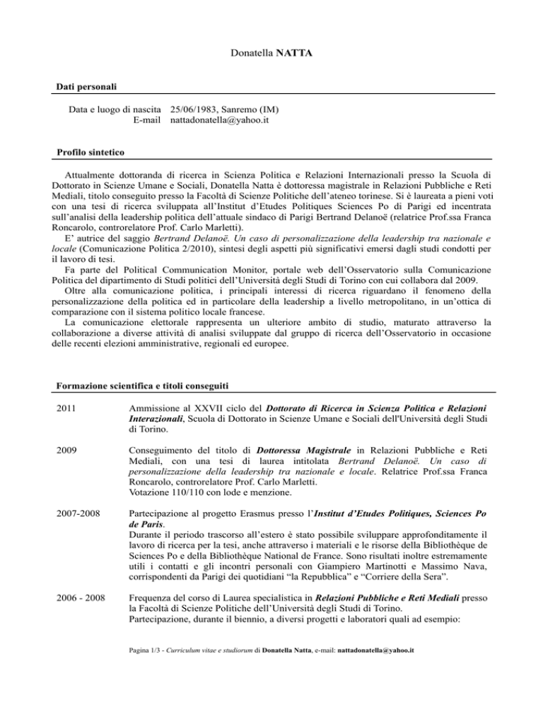 Donatella NATTA Dati personali Data e luogo di nascita 25/06/1983, Sanremo (IM) E-mail [email protected] Profilo sintetico Attualmente dottoranda di ricerca in Scienza Politica e Relazioni Internazionali presso la Scuola di Dottorato in Scienze Umane e Sociali, Donatella Natta è dottoressa magistrale in Relazioni Pubbliche e Reti Mediali, titolo conseguito presso la Facoltà di Scienze Politiche dell’ateneo torinese. Si è laureata a pieni voti con una tesi di ricerca sviluppata all’Institut d’Etudes Politiques Sciences Po di Parigi ed incentrata sull’analisi della leadership politica dell’attuale sindaco di Parigi Bertrand Delanoë (relatrice Prof.ssa Franca Roncarolo, controrelatore Prof. Carlo Marletti). E’ autrice del saggio Bertrand Delanoë. Un caso di personalizzazione della leadership tra nazionale e locale (Comunicazione Politica 2/2010), sintesi degli aspetti più significativi emersi dagli studi condotti per il lavoro di tesi. Fa parte del Political Communication Monitor, portale web dell’Osservatorio sulla Comunicazione Politica del dipartimento di Studi politici dell’Università degli Studi di Torino con cui collabora dal 2009. Oltre alla comunicazione politica, i principali interessi di ricerca riguardano il fenomeno della personalizzazione della politica ed in particolare della leadership a livello metropolitano, in un’ottica di comparazione con il sistema politico locale francese. La comunicazione elettorale rappresenta un ulteriore ambito di studio, maturato attraverso la collaborazione a diverse attività di analisi sviluppate dal gruppo di ricerca dell’Osservatorio in occasione delle recenti elezioni amministrative, regionali ed europee. Formazione scientifica e titoli conseguiti 2011 Ammissione al XXVII ciclo del Dottorato di Ricerca in Scienza Politica e Relazioni Interazionali, Scuola di Dottorato in Scienze Umane e Sociali dell'Università degli Studi di Torino. 2009 Conseguimento del titolo di Dottoressa Magistrale in Relazioni Pubbliche e Reti Mediali, con una tesi di laurea intitolata Bertrand Delanoë. Un caso di personalizzazione della leadership tra nazionale e locale. Relatrice Prof.ssa Franca Roncarolo, controrelatore Prof. Carlo Marletti. Votazione 110/110 con lode e menzione. 2007-2008 Partecipazione al progetto Erasmus presso l’Institut d’Etudes Politiques, Sciences Po de Paris. Durante il periodo trascorso all’estero è stato possibile sviluppare approfonditamente il lavoro di ricerca per la tesi, anche attraverso i materiali e le risorse della Bibliothèque de Sciences Po e della Bibliothèque National de France. Sono risultati inoltre estremamente utili i contatti e gli incontri personali con Giampiero Martinotti e Massimo Nava, corrispondenti da Parigi dei quotidiani “la Repubblica” e “Corriere della Sera”. 2006 - 2008 Frequenza del corso di Laurea specialistica in Relazioni Pubbliche e Reti Mediali presso la Facoltà di Scienze Politiche dell’Università degli Studi di Torino. Partecipazione, durante il biennio, a diversi progetti e laboratori quali ad esempio: Pagina 1/3 - Curriculum vitae e studiorum di Donatella Natta, e-mail: [email protected] - “Ricerca sulle fonti di informazione”, realizzata per il corso di “Metodi e Tecniche di analisi dei media”, tenuto dalla Prof.ssa Marinella Belluati. E' stato possibile entrate in contatto con numerosi responsabili di uffici stampa, tra cui Lavazza, Ospedale Molinette e Questura di Torino; - “Osservatorio sulla campagna elettorale, elezioni politiche 2006”, realizzato per il corso di “Comunicazione Politica 2”, tenuto dalla Prof.ssa Franca Roncarolo. La ricerca è stata sviluppata seguendo l’agenda dei candidati F. Rutelli e F. Bertinotti ed analizzando la tipologia di eventi da loro prodotti. 2005 Conseguimento del titolo di Dottoressa in Studi Internazionali, con una tesi di laurea intitolata La generazione che rompe. Il disimpegno politico dei giovani nell’Italia dei primi anni ’80, analizzato attraverso il quindicinale torinese Nuovasocietà. Relatore Prof. Sergio Soave. 2002-2005 Frequenza del corso di Laurea in Studi Internazionali presso la Facoltà di Scienze Politiche dell’Università degli Studi di Torino. 2002 Conseguimento del diploma di maturità linguistica (progetto Brocca), presso il Liceo Statale “C. Amoretti” di Imperia. Pubblicazioni 2010 Bertrand Delanoë, un caso di personalizzazione della leadership tra nazionale e locale. Comunicazione Politica, 11(2), pp. 183-202. Attività di ricerca 2011 In occasione delle elezioni amministrative torinesi, ha collaborato con il Comitato Piero Fassino Sindaco, partecipando agli incontri per la definizione del programma elettorale durante i quali ha affiancato l'Assessore Enzo Lavolta nel lavoro di verbalizzazione e produzione di report. Ha collaborato inoltre con il responsabile dell'ufficio stampa, Massimo Gibelli, seguendo lo sviluppo dell'iniziativa Gran Toret, realizzata dal Comitato Fassino e dall'agenzia torinese Hub09. Dal 2009 Collabora alle attività di ricerca dell'Osservatorio sulla Comunicazione Politica del dipartimento di Studi politici dell’Università degli Studi di Torino e ha partecipato al monitoraggio e all'analisi delle ultime campagne elettorali. Per quanto riguarda le elezioni amministrative 2011, è in corso di realizzazione uno studio sul coverage nazionale, che verrà raccolto in un volume dedicato all'ultima tornata elettorale a cura dell'Osservatorio. Per le elezioni regionali 2010 si è occupata invece di monitorare il coverage dei principali quotidiani nazionali, durante i due mesi precedenti l'appuntamento elettorale. Nel 2009, nell'ambito della ricerca sulle elezioni europee, ha partecipato alla conferenza "Comunicare l'Europa", promossa dal dipartimento di Studi politici, dal Corso di Laurea di Comunicazione Pubblica e Politica dell'Università degli Studi di Torino e da Apiceuropa, in collaborazione con la rete Europe Direct e l’Ufficio del Parl