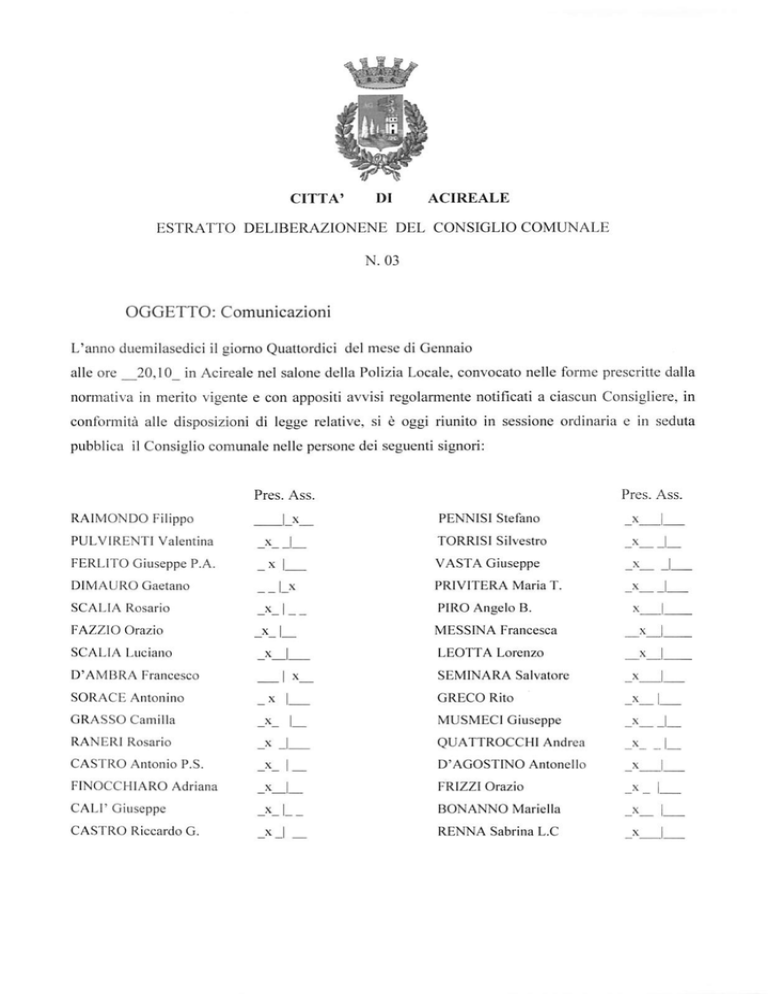 CITTA' DI ACIREALE ESTRATTO DELIBERAZIONENE DEL CONSIGLIO COMUNALE OGGETTO: Comunicazioni L'anno duemiiasedici il giorno Quattordici del mese di Gennaio alle ore 20,10_ in Acireale nel salone della Polizia Locale, convocato nelle forme prescritte dalla normativa in merito vigente e con appositi avvisi regolarmente notificati a ciascun Consigliere, in conformità alle disposizioni di legge relative, si è oggi riunito in sessione ordinaria e in seduta pubblica il Consiglio comunale nelle persone dei seguenti signori; Pres. Ass Pres. Ass RAIMONDO Filippo PENNISI Stefano PULVIRENTi Valentina TORRISI Silvestro FERLITO Giuseppe P.A. VASTA Giuseppe DIMAURO Gaetana PRIVITERA Maria T. SCALIA Rosario PIRO Angelo B. FAZZIO Orazio MESSINA Francesca SCALIA Luciano LEOTTA Lorenzo D'AMBRA Francesco SEMINARA Salvatore SORACE Antonino GRECO Rito GRASSO Camilla MUSMECI Giuseppe RANERI Rosario QUATTROCCHI Andrea CASTRO Antonio P.S. D'AGOSTINO Anione o FINOCCHIARO Adriana FRIZZI Orazb CALI' Giuseppe BONANNO Mariella CASTRO Riccardo G, RENNA Sabr na L.C