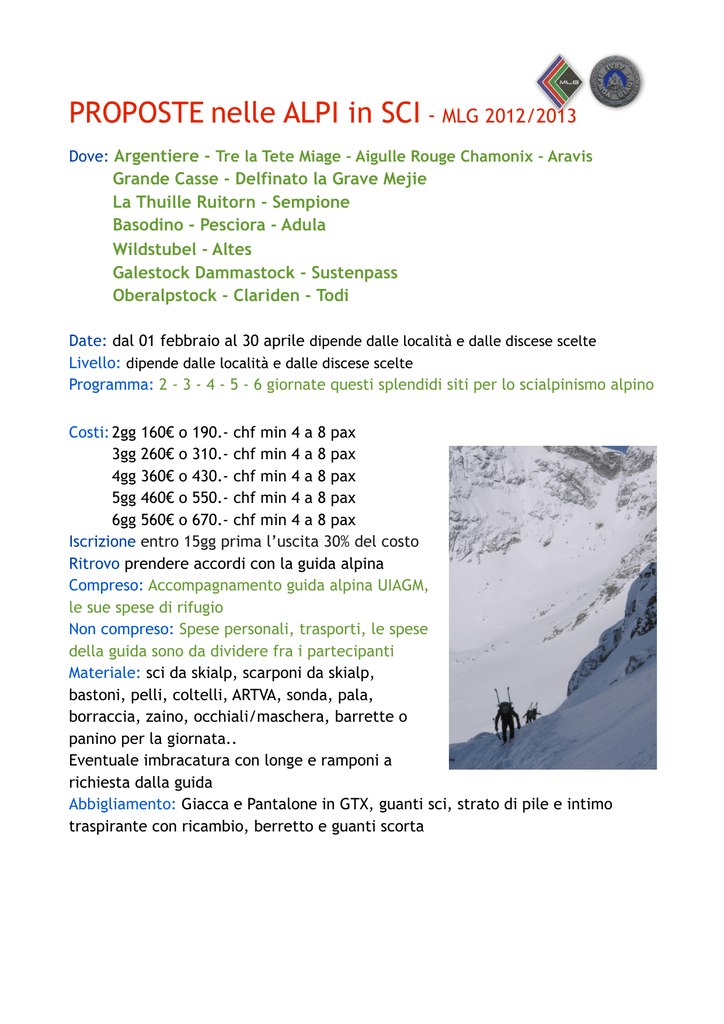 PROPOSTE nelle ALPI in SCI - MLG 2012/2013 Dove: Argentiere - Tre la Tete Miage - Aigulle Rouge Chamonix - Aravis Grande Casse - Delfinato la Grave Mejie La Thuille Ruitorn - Sempione Basodino - Pesciora - Adula Wildstubel - Altes Galestock Dammastock - Sustenpass Oberalpstock - Clariden - Todi Date: dal 01 febbraio al 30 aprile dipende dalle località e dalle discese scelte Livello: dipende dalle località e dalle discese scelte Programma: 2 - 3 - 4 - 5 - 6 giornate questi splendidi siti per lo scialpinismo alpino Costi: 2gg 160€ o 190.- chf min 4 a 8 pax 3gg 260€ o 310.- chf min 4 a 8 pax 4gg 360€ o 430.- chf min 4 a 8 pax 5gg 460€ o 550.- chf min 4 a 8 pax 6gg 560€ o 670.- chf min 4 a 8 pax Iscrizione entro 15gg prima l’uscita 30% del costo Ritrovo prendere accordi con la guida alpina Compreso: Accompagnamento guida alpina UIAGM, le sue spese di rifugio Non compreso: Spese personali, trasporti, le spese della guida sono da dividere fra i partecipanti Materiale: sci da skialp, scarponi da skialp, bastoni, pelli, coltelli, ARTVA, sonda, pala, borraccia, zaino, occhiali/maschera, barrette o panino per la giornata.. Eventuale imbracatura con longe e ramponi a richiesta dalla guida Abbigliamento: Giacca e Pantalone in GTX, guanti sci, strato di pile e intimo traspirante con ricambio, berretto e guanti scorta