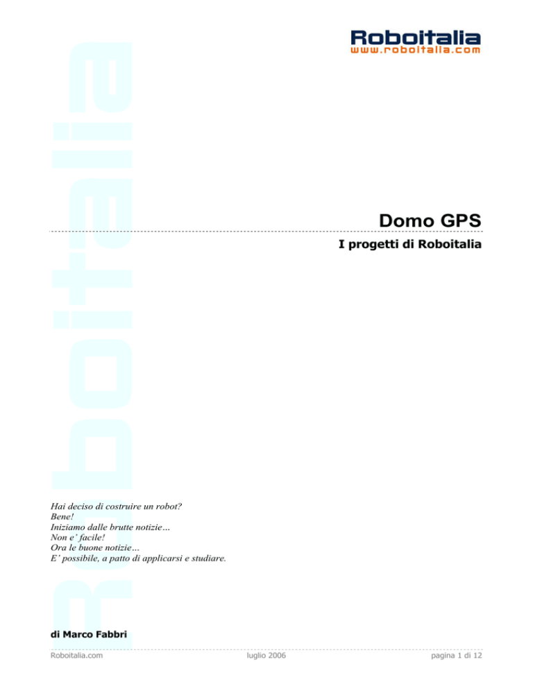 Domo GPS I progetti di Roboitalia Hai deciso di costruire un robot? Bene! Iniziamo dalle brutte notizie… Non e’ facile! Ora le buone notizie… E’ possibile, a patto di applicarsi e studiare. di Marco Fabbri Roboitalia.com luglio 2006 pagina 1 di 12 Licenza di questo documento Quest'opera è stata rilasciata sotto la licenza Creative Commons Attribution-NonCommercial-ShareAlike 2.0 Italy. Per leggere una copia della licenza visita il sito web http://creativecommons.org/licenses/publicdomain/ o spedisci una lettera a Creative Commons, 559 Nathan Abbott Way, Stanford, California 94305, USA. Attribuzione - Non Commerciale - Condividi allo stesso modo 2.0 Italia Tu sei libero: • di riprodurre, distribuire, comunicare al pubblico, esporre in pubblico, rappresentare, eseguire o recitare l'opera • di creare opere derivate Alle seguenti condizioni: Attribuzione. Devi riconoscere il contributo dell'autore originario. Non commerciale. Non puoi usare quest’opera per scopi commerciali. Condividi allo stesso modo. Se alteri, trasformi o sviluppi quest’opera, puoi distribuire l’opera risultante solo per mezzo di una licenza identica a questa. • • In occasione di ogni atto di riutilizzazione o distribuzione, devi chiarire agli altri i termini della licenza di quest’opera. Se ottieni il permesso dal titolare del diritto d'autore, è possibile rinunciare ad ognuna di queste condizioni. Le tue utilizzazioni libere e gli altri diritti non sono in nessun modo limitati da quanto sopra Questo è un riassunto in linguaggio accessibile a tutti del Codice Legale (la licenza integrale) all’indirizzo http://creativecommons.org/licenses/by-nc-sa/2.0/it/legalcode Roboitalia.com luglio 2006 pagina 2 di 12 Indice Premessa .............................................................................................................................................4 Il tempo di volo. ................................................................................................................................4 Cielo.................................................................................................................................................4 Triangolazione...................................................................................................................................5 Il progetto............................................................................................................................................5 Satellite ............................................................................................................................................5 Roboboard: .......................................................................................................................................6 Il codice ...............................................................................................................................................8 Fonti di errore note .............................................................................................................................11 Difficoltà e miglioramenti .....................................................................................................................12 Roboitalia.com luglio 2006 pagina 3 di 12 Premessa Quando si pensa ad un robot mobile, una delle prime considerazioni che viene spontaneo fare è relativa alla consapevolezza della posizione del robot; in altre parole sono rari i casi dove il robot può svolgere azioni senza sapere dov’è. Alla domanda “dove sono” i robot, o i loro creatori, devono quindi saper rispondere, esistono in merito alcuni documenti reperibili anche in rete attraverso i quali è possibile sviluppare alcuni ragionamenti. A meno di avere un campo di gara o di prova con dimensioni e caratteristiche ben precise, scopriamo in breve che un’applicazione ad uso generico deve tener presente molte incognite e anche imparare a muoversi mappando il territorio. Il fascino del GPS a mio avviso è dato proprio dalla possibilità di avere sempre un riferimento assoluto indipendente dall’ambiente (a patto di ricevere il segnale). Per un uso domestico evidentemente non è possibile usare la stessa tecnologia, ma si possono usare gli stessi concetti che sono: 1) Triangolazione: si tratta di calcolare un punto avendo come riferimento la distanza da almeno due punti noti, il calcolo consiste appunto nel trovare il triangolo che ha come vertici i due punti noti più quello incognito conoscendo la misura dei tre lati 2) Cielo: nel sistema GPS si intende con “cielo” la posizione precisa dei satelliti ai quali ci riferiamo per costruire la triangolazione, è vero che i satelliti sono geostazionari ma quelli visibili e quindi utilizzabili per triangolare cambiano in funzione della posizione del punto incognito 3) Tempo di volo: conoscendo la velocità di propagazione in un determinato mezzo di un’onda (sonora o elettromagnetica) posso ricavare dal tempo che essa impiega a percorrerla la distanza tra il punto di partenza e il punto di arrivo. Vediamo ora come mettere in pratica un sistema simile. Il tempo di volo. Ad uso hobbistico è piuttosto diffuso l’utilizzo degli ultrasuoni per misurare una distanza e questo in quanto è piuttosto semplice generarli e la velocità del suono nell’aria è tale da poter produrre dei tempi di volo facilmente misurabili anche per distanze piuttosto piccole. Supponendo la velocità del suono nell’aria di 330m/s abbiamo che, volendo discriminare una distanza minima di 1mm dobbiamo riuscire a misurare un tempo di 0,001/330=3uS (microsecondi) ora per quanto possa sembrare un tempo molto piccolo, non è così assurdo pensare di misurarlo, in particolare se usiamo MCU con clock a qualche decina di MHz. Nelle applicazioni comuni o commerciali questo sistema si usa per rilevare la distanza di un ostacolo misurando “l’eco” come nei sonar, in questo caso la distanza è doppia (andata e ritorno) ma soprattutto 