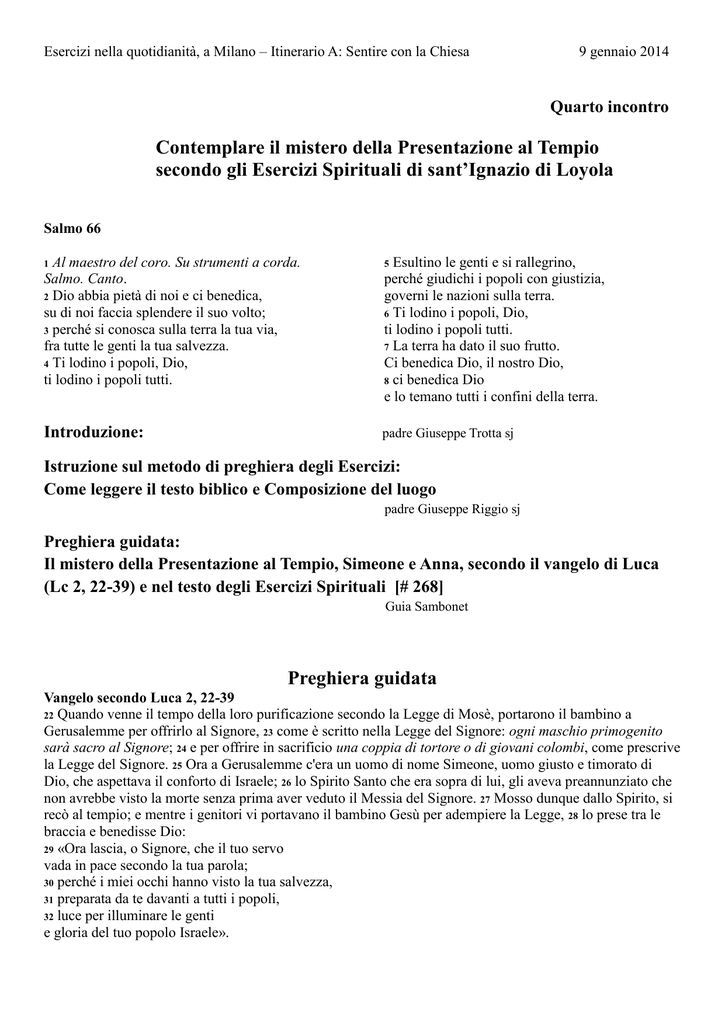 Esercizi nella quotidianità, a Milano – Itinerario A: Sentire con la Chiesa 9 gennaio 2014 Quarto incontro Contemplare il mistero della Presentazione al Tempio secondo gli Esercizi Spirituali di sant’Ignazio di Loyola Salmo 66 1 Al maestro del coro. Su strumenti a corda. Salmo. Canto. 2 Dio abbia pietà di noi e ci benedica, su di noi faccia splendere il suo volto; 3 perché si conosca sulla terra la tua via, fra tutte le genti la tua salvezza. 4 Ti lodino i popoli, Dio, ti lodino i popoli tutti. 5 Esultino le genti e si rallegrino, perché giudichi i popoli con giustizia, governi le nazioni sulla terra. 6 Ti lodino i popoli, Dio, ti lodino i popoli tutti. 7 La terra ha dato il suo frutto. Ci benedica Dio, il nostro Dio, 8 ci benedica Dio e lo temano tutti i confini della terra. Introduzione: padre Giuseppe Trotta sj Istruzione sul metodo di preghiera degli Esercizi: Come leggere il testo biblico e Composizione del luogo padre Giuseppe Riggio sj Preghiera guidata: Il mistero della Presentazione al Tempio, Simeone e Anna, secondo il vangelo di Luca (Lc 2, 22-39) e nel testo degli Esercizi Spirituali [# 268] Guia Sambonet Preghiera guidata Vangelo secondo Luca 2, 22-39 22 Quando venne il tempo della loro purificazione secondo la Legge di Mosè, portarono il bambino a Gerusalemme per offrirlo al Signore, 23 come è scritto nella Legge del Signore: ogni maschio primogenito sarà sacro al Signore; 24 e per offrire in sacrificio una coppia di tortore o di giovani colombi, come prescrive la Legge del Signore. 25 Ora a Gerusalemme c'era un uomo di nome Simeone, uomo giusto e timorato di Dio, che aspettava il conforto di Israele; 26 lo Spirito Santo che era sopra di lui, gli aveva preannunziato che non avrebbe visto la morte senza prima aver veduto il Messia del Signore. 27 Mosso dunque dallo Spirito, si recò al tempio; e mentre i genitori vi portavano il bambino Gesù per adempiere la Legge, 28 lo prese tra le braccia e benedisse Dio: 29 «Ora lascia, o Signore, che il tuo servo vada in pace secondo la tua parola; 30 perché i miei occhi hanno visto la tua salvezza, 31 preparata da te davanti a tutti i popoli, 32 luce per illuminare le genti e gloria del tuo popolo Israele». Esercizi nella quotidianità, a Milano – Itinerario A: Sentire con la Chiesa 9 gennaio 2014 Il padre e la madre di Gesù si stupivano delle cose che si dicevano di lui. 34 Simeone li benedisse e parlò a Maria, sua madre: «Egli è qui per la rovina e la risurrezione di molti in Israele, segno di contraddizione 35 perché siano svelati i pensieri di molti cuori. E anche a te una spada trafiggerà l'anima». 36 C'era anche una profetessa, Anna, figlia di Fanuèle, della tribù di Aser. Era molto avanzata in età, aveva vissuto con il marito sette anni dal tempo in cui era ragazza, 37 era poi rimasta vedova e ora aveva ottantaquattro anni. Non si allontanava mai dal tempio, servendo Dio notte e giorno con digiuni e preghiere. 38 Sopraggiunta in quel momento, si mise anche lei a lodare Dio e parlava del bambino a quanti aspettavano la redenzione di Gerusalemme. 39 Quando ebbero tutto compiuto secondo la legge del Signore, fecero ritorno in Galilea, alla loro città di Nazaret. 33 ESERCIZI SPIRITUALI [268]: 1 DELLA PURIFICAZIONE DI NOSTRA SIGNORA E PRESENTAZIONE DEL BAMBINO GESU’ SCRIVE SAN LUCA, CAPITOLO SECONDO, 22-39 2 Primo. Portano il bambino Gesù al tempio perché sia presentato al Signore come primogenito e offrono per lui «un paio di tortore o due giovani colombi». 3 Secondo. Simeone, venendo al tempio, «Lo prese nelle sue braccia» dicendo: « “Ora, Signore, lascia il tuo servo in pace”». 4 Terzo. Anna, «sopraggiunta, lodava il Signore e parlava di lui a tutti quelli che aspettavano la redenzione di Israele». Preghiera finale Salmo 97 Salmo. Cantate al Signore un canto nuovo, perché ha compiuto prodigi. Gli ha dato vittoria la sua destra e il suo braccio santo. 2 Il Signore ha manifestato la sua salvezza, agli occhi dei popoli ha rivelato la sua giustizia. 3 Egli si è ricordato del suo amore, della sua fedeltà alla casa di Israele. Tutti i confini della terra hanno veduto la salvezza del nostro Dio. 4 Acclami al Signore tutta la terra, 1 gridate, esultate con canti di gioia. 5 Cantate inni al Signore con l’arpa, con l’arpa e con suono melodioso; 6 con la tromba e al suono del corno acclamate davanti al re, il Signore. 7 Frema il mare e quanto racchiude, il mondo e i suoi abitanti. 8 I fiumi battano le mani, esultino insieme le montagne 9 davanti al Signore che viene, che viene a giudicare la terra. Giudicherà il mondo con giustizia e i popoli con rettitudine. Alcuni testi per la preghiera personale (possono esserti utili per esercitarti sulla Composizione di luogo, ma se preferisci usare altri passaggi biblici, non esitare a farlo): La costruzione del Tempio: 1Re 6, 1-38; Gli arredi sacri del Tempio: 1Re 7, 13-51; Trasferimento nel Tempio dell’Arca dell’alleanza: 1Re 8, 1-9; Dio prende possesso del suo tempio: 1Re 8, 10-13; L’olio dell’unzione: Esodo 30, 22-38 Annuncio della liberazione di Israele: Isaia 40, 1-11. www.centrosanfedele.net > temi e percorsi > esercizi spirituali nella quotidianità – Itinerario A www.gesuiti-villapizzone.it > attività > esercizi spirituali nella quotidianità – Itinerario A