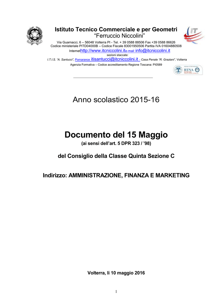 Istituto Tecnico Commerciale e per Geometri “Ferruccio Niccolini” Via Guarnacci, 6 – 56048 Volterra PI - Tel. + 39 0588 88506 Fax +39 0588 86626 Codice ministeriale PITD04000B – Codice Fiscale 83001950506 Partita IVA 01604880508 Internethttp://www.itcniccolini.ite-mail [email protected] sezioni staccate: I.T.I.S. “A. Santucci”, Pomarance [email protected] - Casa Penale “R. Graziani”, Volterra Agenzia Formativa – Codice accreditamento Regione Toscana: PI0589 Anno scolastico 2015-16 Documento del 15 Maggio (ai sensi dell’art. 5 DPR 323 / ’98) del Consiglio della Classe Quinta Sezione C Indirizzo: AMMINISTRAZIONE, FINANZA E MARKETING Volterra, li 10 maggio 2016 1 INDICE 1. Composizione della classe, p. 3 2. Composizione del Consiglio di classe dell’ultimo anno, p. 3 3. Profilo della classe, p. 4 4. Risultati dello scrutinio finale della classe Terza e Quarta, p.4 5. Continuità didattica nel triennio, p. 4 6. Frequenza alle lezioni, rapporti interpersonali, partecipazione al dialogo formativo e collabo- razione nello svolgimento delle attività studentesche, p. 5 7. Livello della preparazione iniziale della classe nell’ultimo anno, relativamente a conoscenze, competenze, capacità, p. 5 8. Obiettivi trasversali (obiettivi educativi e formativi; obiettivi cognitivi), p. 6 9. Competenze minime in uscita, p. 6 10. Profilo formativo della classe in uscita, p. 7 11. Argomenti/attività pluridisciplinari, p. 7 12. Attività di laboratorio programmate e realizzate nell’ultimo anno, p. 7 13. Attività extracurricolari programmate e realizzate, p. 7 14. Tipologia di prove, elaborati, esercitazioni realizzate durante l’ultimo anno per verifiche e prove di misurazione, p. 8 15. Criteri per le valutazioni intermedie e finali, p. 8 16. Attività di recupero e sostegno, p. 8 17. Simulazione della Terza Prova e risultati, p. 9 18. Criteri per il riconoscimento del Credito formativo, p. 10 19. Griglie di valutazione della Prima prova scritta: Italiano, p. 11 20. Griglia di valutazione della Seconda prova scritta: Economia Aziendale, p. 14 21. Griglie di valutazione della Terza prova scritta, p. 15 22. Griglia di valutazione del Colloquio pluridisciplinare, p. 17 23. Elenco degli Allegati, p. 18 24. Prospetto delle firme dei docenti del Consiglio di classe, p. 18 2 1. Composizione della classe La classe è composta da n. 11 studenti (8 femmine e 3 maschi) 1 Alfonsi Elisa 2 Bacci Antonio 3 Bertagni Sonia 4 Campatelli Gloria 5 Ferretti Martina 6 Lupi Francesca 7 Menicucci Lorenzo 8 Salvadori Damiano 9 Sauro Rossella 10 Stamilla Elisa 11 Tamburini Noemi 2. Composizione del Consiglio di classe dell’ultimo anno Docente Amidei Brunetta Veracini Roberto Righi Maurizio Osso Nuccio Stefanelli Francesco Zapparelli Giuseppe Vannozzi Massimo Pagni Gianni Disciplina Religione Italiano e Storia Inglese Francese Matematica Diritto ed Economia Politica Economia Aziendale Scienze Motorie 3 3. Profilo della classe Quasi tutti gli alunni hanno svolto l'intero percorso scolastico in questo Istituto. Solo due studenti, provenienti dal Liceo Classico di Volterra, si sono iscritti in terza, mentre un’ alunna si è trasferita ad altra scuola alla fine del terzo anno. Non si sono mai evidenziati problemi particolari di natura disciplinare, gli alunni hanno sempre manifestato negli anni un comportamento sostanzialmente corretto e rispettoso delle regole dell’Istituto. Per Italiano, Storia, Inglese, Religione e Scienze Motorie la classe è articolata con la quinta commerciale articolazione Sistemi Informativi Aziendali. 4. Risultati dello scrutinio finale della classe Terza e Quarta Anno scolastico 2013/2014 2014/2015 Classe Iscritti Terza Quarta 12 11 Sospensione del giudizio 2 2 Promossi Non ammessi 12 11 0 0 5. Continuità didattica nel triennio Materia Religione Italiano e Storia Inglese Francese Matematica Diritto e Economia Politica Economia Aziendale Scienze Motorie A.S. 2012/2013 x x x x x A.S. 2013/2014 x x x x x x x A.S. 2014/2015 x x x x x x x x La continuità didattica nel triennio ha riguardato tutte le discipline tranne Economia Aziendale, Diritto ed Economia Politica. In quarta, in particolare, si sono alternati, nel corso dell’ anno scolastico tre insegnanti di Economia Aziendale. 4 6. Frequenza alle lezioni, rapporti interpersonali, partecipazione al dialogo formativo e collaborazione nello svolgimento delle attività studentesche Quasi tutti gli alunni hanno frequentato con regolarità le lezioni, solo alcuni studenti hanno fatto registrare numerose assenze senza però superare il limite massimo consentito. Complessivamente gli alunni hanno mantenuto un comportamento corretto dimostrando un buon senso di responsabilità. La partecipazione al dialogo educativo è stata adeguata anche se non tutti gli alunni hanno dimostrato lo stesso impegno nello studio individuale e nell'approfondimento dei contenuti proposti nelle diverse discipline. Solo alcuni studenti non hanno saputo mantenere, soprattutto nel primo quadrimestre, un ritmo sufficientemente continuo nel lavoro e evidenziano ancora qualche difficoltà nelle attività di produzione e nella rielaborazione personale dei contenuti. 7.Livello della preparazione iniziale della classe nell’ultimo anno. Livello di partenza Ottimo Buono Discreto Sufficiente Mediocre Insufficiente Grav. Insufficiente Non valutabile N° studenti 3 5 1 2 NOTA Esplicativa Ottimo Buono/Discreto Sufficiente Mediocre Gli alunni partecipano costruttivamente alle lezioni cercando di approfondire gli argomenti e rielaborarli anche con spunti interdisciplinari. Dimostrano una visione critica e personale dei temi delle diverse discipline. Gli alunni seguono con impegno le lezioni, il loro metodo di studio è appropriato e il linguaggio corretto. Dimostrano conoscenze complete, che sanno applicare. Le conoscenze degli alunni sono per lo più complete, ma non approfondite. Si esprimono in modo semplice e senza errori e il metodo di studio è talvolta di tipo ripe