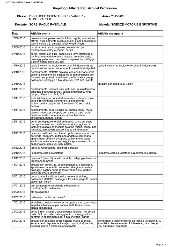 ISTITUTO DI ISTRUZIONE SUPERIORE Riepilogo Attività Registro del Professore Classe: 2BSC LICEO SCIENTIFICO "B. VARCHI" MONTEVARCHI Docente: SORBI PAOLO PASQUALE Anno: 2015/2016 Materia: SCIENZE MOTORIE E SPORTIVE Data Attività svolta 17/09/2015 presentazione personale disciplina, regole, valutazione attività, riscaldamento guidato alunni, gioco passaggi 20 tocchi, calcio a 5, palleggi volley e badminton riscaldamento es a coppie es propedeutici per fondamentali volley a coppie, partita corsa, slalom con birilli, saltelli,es a terra stretching e tonificazione addome dorso braccia, controllo palla, passaggi pallamano, tiro, tiro in sospensione, palleggio e tiro in corsa, dai e vai, 5c5 teoria il volley (ad esclusione schemi di ricezione). as teoria il volley (ad esclusione schemi di ricezione). coordinazione corsa, superamento cavallina,dodge ball riscaldamento, staffetta suicidio, con conduzione palla calcio, palleggio e tiro basket, es di coordinazione con funicella, sul posto in movimento, individuale a gruppi, pallamano, palleggio e tiro, dai e vai, 2c2, 5c5, partita studiare per compito su volley 23/09/2015 07/10/2015 14/10/2015 21/10/2015 21/10/2015 04/11/2015 Attività assegnata 09/12/2015 riscaldamento, funicella salti in 30 sec, in spostamento, palleggio passaggi basket, cambi di direzione, terzo tempo, difesa 1 c1, 2c2, 5c5 esercizi di respirazione diaframmatica e sternocostale, es di stretching per arti inferiori, allungamento ischiocrurali a coppie, test funicella in 30 sec. calcio seduto. riscaldamento, es di velocità sul campo volley, muro tecnica rincors es a coppie con e senza palla, es di ricezione costruzione attacco, autoschiacciata, schiacciata, battute, partita cenni su respirazione diaframmatica. corsa sul posto con spostamenti vari, andature su 4 appoggi, es di isometria globale,es mobilità colonna (cigno, sfinge, pos raccolta), acrosposrt posizioni base e intermedie ricerca spazi liberi da soli e a coppie deambulando ne correndo, andature, imitazione andature compagno, spostamenti difensivi a coppie, pallamano passaggi soottomano/alla mano, passaggi e spostamento, tiro in sospensione, dai e vai, 5c5, partita teoria la respirazione, calcio a5 e basket 23/12/2015 l apparato cardiocircolatorio 23/12/2015 03/02/2016 calcio a 5 (maschi), anelli, capriole, pallaprigioniera con tappetoni (femmine) circuito con cerchi, es. di coordinazione, e giocoleria, spostamenti in avanti con cerchio alla gamba, volley palleggi e bagher sopra la testa valutazione, partica calcio a5 (M), e absket (F) corsa gradoni, salti, es tonificazione e stretching, pallamano staffetta, passaggi a tre e tiro, paqrtita, partita calcio, test volley test su apparato circolatorio e respiratorio, riscaldamento, pallamano bls spiegazione 03/02/2016 pallamano partita con terza D 17/02/2016 stretching, postura, volley es a coppie a muro, per colpo su palla schiacciata, per battuta, battuta-ricezionealzata-schiacciata corsa 5 min, allunghi, scivolamento laterale, 1c1 senza palla, 1c1 con palla, passaggi e tiro, passaggi a tre i centrale in spostamento,dai e tira, incrocio, partita circuito per equilibrio coordinazione (ruota capriola, per martedi prossimo ricerca su tecnica stretching, 10 superamento tappetone, trave)acrosport, dodghe ball, esercizi a piacere e muscoli interessati, fare disegno esercizi sbarra e traslocazioni parallele (nel quaderno, comprarlo) 11/11/2015 18/11/2015 25/11/2015 02/12/2015 13/01/2016 20/01/2016 27/01/2016 24/02/2016 02/03/2016 l apparato cardiocircolatorio e respiratorio studiare Pag. 1 di 2 ISTITUTO DI ISTRUZIONE SUPERIORE Riepilogo Attività Registro del Professore Classe: 2BSC LICEO SCIENTIFICO "B. VARCHI" MONTEVARCHI Docente: SORBI PAOLO PASQUALE Anno: 2015/2016 Materia: SCIENZE MOTORIE E SPORTIVE Data Attività svolta 09/03/2016 nuoto in piscina, analisi situazione iniziale, respirazione ricerca: il crawl, movimento gambe, braccia e al bordo, capriole in acqua, seduti sul fondo, respirazione (per martedi prossimo) galleggiamento e scivolamento, esercizi per movimento gambe, braccia e respirazione crawl, tuffi nuoto, esercizi per bracciate movimento arti inferiori e studiare crawl e dorso tecnica (anche su internet ok) respirazione (crawl per dorso), es di apnea e recupero materiale dal fondo, staffetta, tuffi attivita in piscina crawl, dorso, rana, tuffi virata 16/03/2016 23/03/2016 13/04/2016 Attività assegnata 18/05/2016 allenamento per test di cooper, tecnica del tiro a studiare cap 21 pag 276 canestro esercitazione e valutazione, visione di video relativi al nuoto, tuffo di partenza, crawl e dorso. crawl, per bracciate respirazione e gambe, dorso, gambe e braccia, apnea, test finale corsa 6 min. es di stretching e mobilità articolare braccia e gambe, calcio (melina), partita, volley partita attivo di classe studiare mobilità articolare, cos'è, fattori, come si allena, lo stretching tecnica, il pnf cos è, il riflesso da stiramento attivita allo stadio. test di cooper 25/05/2016 test di cooper, pallamano e basket, test scritto sul nuoto 01/06/2016 correzione test nuoto, test di cooper e basket residui, calcio a5 e basket dodge ball, bowling, volley, calcio a5, test residui 20/04/2016 27/04/2016 27/04/2016 08/06/2016 Pag. 2 di 2