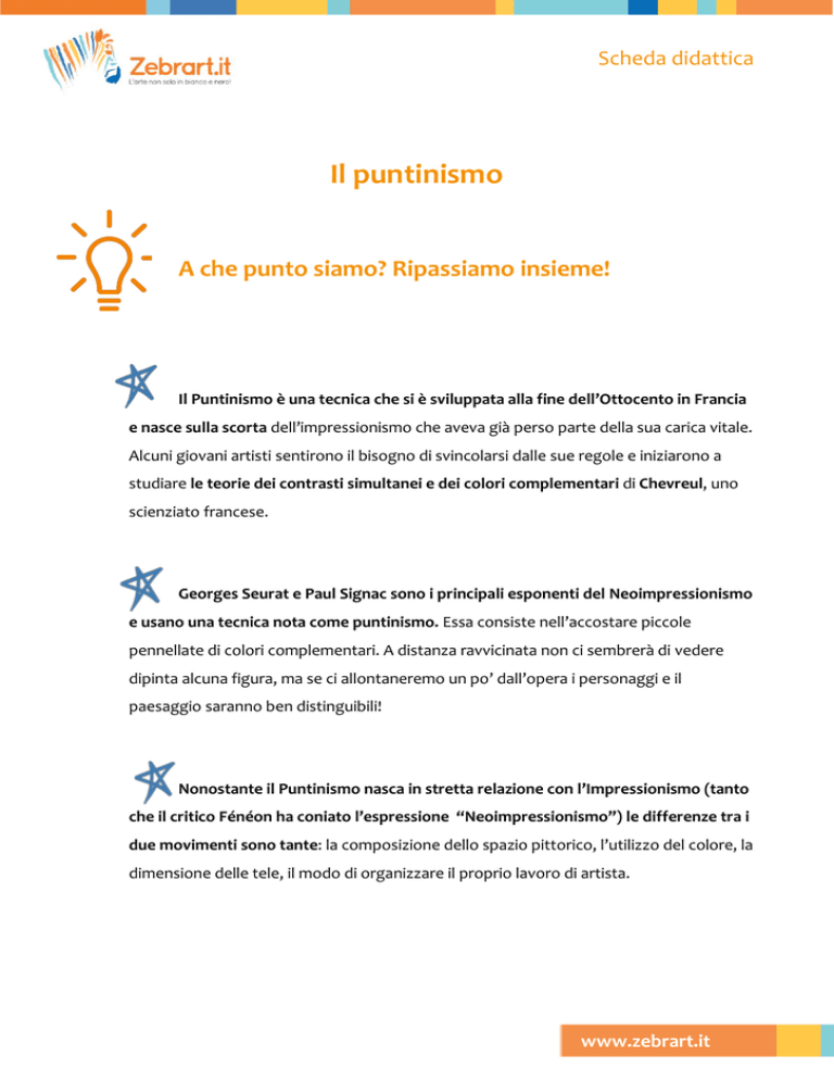 Scheda didattica Il puntinismo A che punto siamo? Ripassiamo insieme! Il Puntinismo è una tecnica che si è sviluppata alla fine dell’Ottocento in Francia e nasce sulla scorta dell’impressionismo che aveva già perso parte della sua carica vitale. Alcuni giovani artisti sentirono il bisogno di svincolarsi dalle sue regole e iniziarono a studiare le teorie dei contrasti simultanei e dei colori complementari di Chevreul, uno scienziato francese. Georges Seurat e Paul Signac sono i principali esponenti del Neoimpressionismo e usano una tecnica nota come puntinismo. Essa consiste nell’accostare piccole pennellate di colori complementari. A distanza ravvicinata non ci sembrerà di vedere dipinta alcuna figura, ma se ci allontaneremo un po’ dall’opera i personaggi e il paesaggio saranno ben distinguibili! Nonostante il Puntinismo nasca in stretta relazione con l’Impressionismo (tanto che il critico Fénéon ha coniato l’espressione “Neoimpressionismo”) le differenze tra i due movimenti sono tante: la composizione dello spazio pittorico, l’utilizzo del colore, la dimensione delle tele, il modo di organizzare il proprio lavoro di artista. www.zebrart.it Scheda didattica Dipingiamo un paesaggio con la tecnica del puntinismo! Abbiamo visto che la tecnica del puntinismo consiste nel dipingere con dei piccolissimi puntini colorati. I colori devono essere messi uno accanto all’altro senza lasciare spazi bianchi e devono essere complementari tra loro! Considerando il cerchio dei colori di Chevreul, che riporta l’uno di fronte all’altro i colori complementari, facciamo diventare un normale paesaggio… un bellissimo quadro puntinista! Osserva attentamente questo dipinto, di Edward Hopper, The long leg (1930): www.zebrart.it Scheda didattica E adesso prova a ridipingerlo usando la tecnica puntinista! www.zebrart.it
