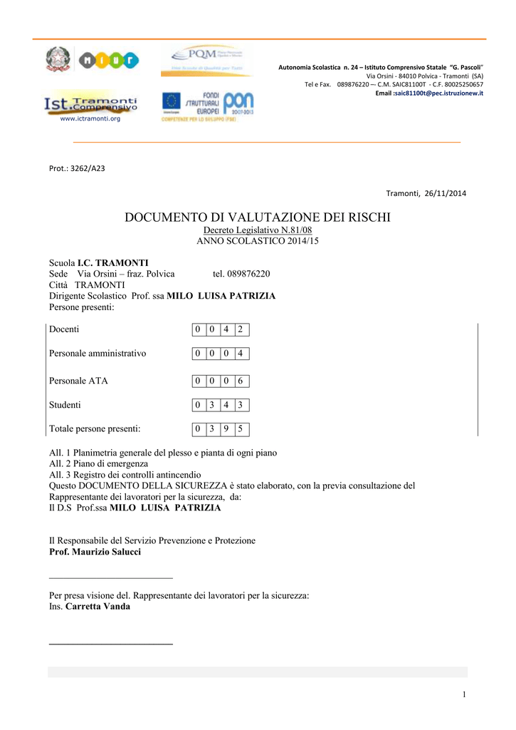 Autonomia Scolastica n. 24 – Istituto Comprensivo Statale “G. Pascoli” Via Orsini - 84010 Polvica - Tramonti (SA) Tel e Fax. 089876220 –- C.M. SAIC81100T - C.F. 80025250657 Email :[email protected] www.ictramonti.org Prot.: 3262/A23 Tramonti, 26/11/2014 DOCUMENTO DI VALUTAZIONE DEI RISCHI Decreto Legislativo N.81/08 ANNO SCOLASTICO 2014/15 Scuola I.C. TRAMONTI Sede Via Orsini – fraz. Polvica tel. 089876220 Città TRAMONTI Dirigente Scolastico Prof. ssa MILO LUISA PATRIZIA Persone presenti: Docenti 0 0 4 2 Personale amministrativo 0 0 0 4 Personale ATA 0 0 0 6 Studenti 0 3 4 3 Totale persone presenti: 0 3 9 5 All. 1 Planimetria generale del plesso e pianta di ogni piano All. 2 Piano di emergenza All. 3 Registro dei controlli antincendio Questo DOCUMENTO DELLA SICUREZZA è stato elaborato, con la previa consultazione del Rappresentante dei lavoratori per la sicurezza, da: Il D.S Prof.ssa MILO LUISA PATRIZIA Il Responsabile del Servizio Prevenzione e Protezione Prof. Maurizio Salucci __________________________ Per presa visione del. Rappresentante dei lavoratori per la sicurezza: Ins. Carretta Vanda __________________________ 1 Descrizione dei criteri seguiti nella valutazione dei rischi: IL CRITERIO DI VALUTAZIONE DEL RISCHIO Il rischio viene misurato con la relazione: R = P x M La probabilità di incidente (P) viene valutata in funzione della situazione osservata, delle modalità con cui si svolgono le operazioni, dalla frequenza dell’esposizione, dall’eventuale analisi statistica, in: 1. 2. 3. 4. Bassa Modesta Elevata Molto Elevata L’entità o mafgnitudo del possibile danno (M) in: 1. 2. 3. 4. Lieve - infortunio o esposizione con effetti di inabilità rapidamente reversibili Medio – infortunio o esposizione con effetti di inabilità reversibile Grave – infortunio e esposizione con effetti di inabilità lentamente reversibile Gravissimo- infortunio o esposizione con effetti letali o invalidità totale Il processo di Trattamento del rischio comporta tre fasi fondamentali vedi Fig.1: 1. Identificazione del rischio 2. Valutazione del rischio 3. Definizione degli interventi e delle loro priorità. Identificazione del rischio Definizione delle scale semiqualitative di valutazione e matrice del rischio Valutazione del rischio stima delle probabilità dell’evento stima della magnitudo del danno Collocazione nella matrice Definizione delle priorità di intervento Fig. 1 - Il trattamento del rischio 2 Per la fase dell’identificazione del rischio possono essere agevolmente utilizzate le check-list che consentono un controllo puntuale e sistematico dei vari ambienti e delle varie situazioni. Per la fase di valutazione del rischio è necessario seguire tre passaggi fondamentali: 1. definizione delle scale semiqualitative di valutazione e matrice del rischio (a monte di qualsiasi processo di trattamento dei rischi) vedi tabb. 1 e 2; 2. stima della probabilità del verificarsi dell’evento e contemporanea stima della magnitudo del danno; 3. Calcolo dell’indice di rischio con la relazione: R=PxMdove: R è l’indice di rischio M è la stima della magnitudo P è la stima della probabilità del verificarsi dell’evento Per la fase di definizione degli interventi è necessario scegliere tra le due strade possibili (vedi fig. 2): 1. Protezione: cioè diminuire l’entità del danno 2. Prevenzione: cioè diminuire la probabilità di evento Tab. 1 - Scala semiqualitativa delle Probabilità dell’evento (P) VALORE LIVELLO CRITERI - Esiste una correlazione diretta tra mancanza rilevata ed il verificarsi del danno ipotizzato per i lavoratori. 4 Elevata - Si sono già verificati danni per la stessa mancanza rilevata, nella stessa scuola o in situazioni operative simili. - Il verificarsi del danno conseguente la mancanza rilevata non susciterebbe alcun stupore tra gli operatori - La mancanza rilevata può provocare un danno, anche se non in modo automatico o diretto .. 3 M. alta - E' noto qualche episodio in cui alla mancanza ha fatto seguire un danno. - Il verificarsi del danno ipotizzato, susciterebbe una moderata sorpresa. - La mancanza rilevata può provocare un danno solo in circostanze sfortunate 2 M. bassa - Sono noti solo rarissimi episodi già verificatisi. - Il verificarsi del danno ipotizzato susciterebbe grande sorpresa. - La mancanza rilevata può provocare un danno per la concomitanza di più eventi poco probabili indipendenti. 1 Bassa - Non sono noti episodi già verificatisi. - Il verificarsi del danno susciterebbe incredulità. 3 Tab. 2 - Scala semiqualitativa dell'entità del danno o magnitudo (M) VALORE LIVELLO 4 Ingente CRITERI - Infortunio o episodio di esposizione con effetti letali o di invalidità totale - Esposizione cronica con effetti letali e/o totalmente invalidanti 3 - Infortunio o episodio di esposizione acuta con effetti di invalidità parziale Notevole - Esposizione cronica con effetti irreversibili e/o parzialmente invalidanti 2 - Infortunio o episodio di esposizione acuta con inabilità reversibile Modesta - Esposizione cronica con effetti reversibili 1 Trascurabile - Infortunio o episodio di esposizione acuta con inabilità rapidamente reversibile - Esposizione cronica con effetti rapidamente reversibili Probabilità 4-Elevata 4 3-Medio-Alta 3 6 9 2-Medio-Bassa 2 4 6 8 12 Modesta Attenzione 1 1-Trascurabile 12 8 Modesta Attenzione Ritenibile 1-Bassissima 16 Alta Attenzione 2 2-Modesta 3 3-Notevole 4 Magnitudo 4-Ingente Fig. 2 - Matrice del rischio La valutazione numerica del rischio permetterà di definire la priorità e la programmazione temporale degli interventi di protezione e prevenzione da adottare; più specificamente: 4 R>8 Azioni correttive indilazionabili 4<R<8 Azioni correttive necessarie da programmare con urgenza 2<R<3 Azioni corrispettive e/o migliorative da programmare con urgenza R=1 Azioni migliorative da valutare in fase di programmazione OBIETTIVI DELLA VALUTAZIONE L’obiettivo della valutazione dei rischi è di consentire al dato