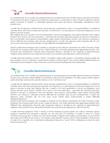 Cervello Destro/Estroverso Le caratteristiche di un cavallo con predominanza di comportamenti da cervello destro estroverso includono il nervosismo frenetico, la paura e la tendenza a impennarsi o a prendere la mano. Questi cavalli sono spesso gestiti cercando di “tenerli” e costringerli quando sono presi dal panico (martingale, chiudibocca, morsi punitivi, ecc). I cavalli da CD agiscono istintivamente, senza pensare, esattamente come si comporterebbero in ambiente naturale, dove non hanno tempo per pensare: al momento in cui percepiscono il pericolo reagiscono con la paura e cercano la fuga. Nel migliore dei casi, i cavalli in CD sono spaventati e insicuri; nel peggiore, sono spesso descritti come “pazzi”! Quello che è certo è che sono pericolosi… pericolosi da montare, pericolosi quando si trovano in situazioni a loro non familiari. Sono paurosi, claustrofobici, super-reattivi, ipersensibili, emotivi, non riescono a pensare e hanno difficoltà ad accettare ogni piccolo cambiamento. I cavalli che agiscono sotto l’impulso del CD non sono sicuri: hanno poco autocontrollo e molte difficoltà nell’apprendimento. Questi cavalli hanno bisogno che li aiutiate a costruire la loro fiducia; necessitano di molta “toccata e fuga” piuttosto che di essere spinti oltre le loro “soglie di fiducia”, e di molte ripetizioni per apprendere poiché sono intimoriti dai cambiamenti. Quando però acquistano fiducia e serenità la loro capacità di apprendimento migliora molto, perché la loro capacità di pensare non è più bloccata dalla paura o dal nervosismo. I cavalli estroversi tendono a essere “carichi”, eccitabili e rapidi nelle reazioni, e richiedono risposte rapide dai loro cavalieri e da chi li gestisce, i quali devono aiutarli a interrompere i loro schemi dettati dalla frenesia e a indirizzare la loro energia in modo costruttivo: ciò li fa calmare focalizzando la loro attenzione. Cervello Destro/Introverso Le caratteristiche di un cavallo con predominanza di comportamenti da cervello destro introverso includono l’essere teso, ombroso, imprevedibile e la tendenza a bloccarsi ed “esplodere”. Di solito questi cavalli vengono spinti ad andare avanti anche quando esitano e non si sentono sicuri. I cavalli da CD agiscono istintivamente, senza pensare, esattamente come si comporterebbero in ambiente naturale, dove non hanno tempo per pensare: al momento in cui percepiscono il pericolo reagiscono con la paura e cercano la fuga. Nel migliore dei casi, i cavalli in CD sono spaventati e insicuri; nel peggiore, sono spesso descritti come “pazzi”! Quello che è certo è che sono pericolosi… pericolosi da montare, pericolosi quando si trovano in situazioni a loro non familiari. Sono paurosi, claustrofobici, super-reattivi, ipersensibili, emotivi, non riescono a pensare e hanno difficoltà ad accettare ogni piccolo cambiamento. I cavalli che agiscono sotto l’impulso del CD non sono sicuri: hanno poco autocontrollo e molte difficoltà nell’apprendimento. Questi cavalli hanno bisogno che li aiutiate a costruire la loro fiducia; necessitano di molta “toccata e fuga” piuttosto che di essere spinti oltre le loro “soglie di fiducia”, e di molte ripetizioni per apprendere poiché sono diffidenti dei cambiamenti. Quando però acquistano fiducia e serenità la loro capacità di apprendimento migliora molto, perché la loro capacità di pensare non è più bloccata dalla paura o dal nervosismo. I cavalli introversi appaiono “lenti” e assorti, e hanno bisogno di essere gestiti con calma e lentezza: spesso vengono scambiati per tranquilli e testardi, ma nel caso del CD introverso il cavallo è come se si fosse “rinchiuso nel suo guscio”, mentre il CS introverso tende a “tagliarvi fuori” dalla sua attenzione, un po’ come il teen-ager che fa finta di non sentirvi. Con questi cavalli dovrete riuscire a fare il meno possibile, a volte anche a lungo, fino a quando non si sentiranno abbastanza fiduciosi a “uscire” (CD) o abbastanza curiosi da voler essere coinvolti (CS). Cervello Sinistro/Introverso Le caratteristiche di un cavallo con predominanza di comportamenti da cervello sinistro introverso includono l’essere annoiato, disinteressato, demotivato, pigro, testardo e la tendenza a sgroppare. I cavalli in CS introverso, semplicemente, vincono il gioco evitando di rispondere alle richieste fino a quando non vi arrendete. I cavalli in CS non hanno paura delle persone, hanno fiducia in sé stessi, sono abbastanza poco sensibili, giocosi, esuberanti, dominanti e spesso tendono a mordicchiare tutto e tutti. Nel migliore dei casi possono essere “invadenti” e disobbedienti, nel peggiore possono diventare aggressivi. Ricordate: questi cavalli possono essere pericolosi quando non si fidano o non amano le persone. Con i cavalli in CS dovrete diventare molto più “interessanti” e stimolanti: hanno bisogno di cose da fare, preferiscono giocare e si annoiano facilmente (e poi reagiscono) con quei cavalieri che si fissano sul perfezionamento di una manovra, poiché avendo così tanta fiducia imparano molto velocemente. I cavalli introversi appaiono “lenti” e assorti, e hanno bisogno di essere gestiti con calma e lentezza: spesso vengono scambiati per tranquilli e testardi, ma nel caso del CD introverso il cavallo è come se si fosse “rinchiuso nel suo guscio”, mentre il CS introverso tende a “tagliarvi fuori” dalla sua attenzione, un po’ come il teen-ager che fa finta di non sentirvi. Con questi cavalli dovrete riuscire a fare il meno possibile, a volte anche a lungo, fino a quando non si sentiranno abbastanza fiduciosi a “uscire” (CD) o abbastanza curiosi da voler essere coinvolti (CS). Cervello Sinistro/Estroverso Le caratteristiche di un cavallo con predominanza di comportamenti da cervello sinistro estroverso includono l’essere dispettoso, “carico”, ostinato, disobbediente, dominante, e la tendenza a mordicchiare o mordere cose e perso