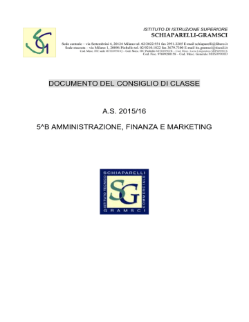 ISTITUTO DI ISTRUZIONE SUPERIORE SCHIAPARELLI-GRAMSCI Sede centrale – via Settembrini 4, 20124 Milano tel. 02/2022.931 fax 2951.2285 E-mail [email protected] Sede staccata – via Milano 1, 20096 Pioltello tel. 02/9210.1822 fax 3679.7300 E-mail [email protected] Cod. Mecc. ITC sede MITD09901Q – Cod. Mecc. ITC Pioltello MITD09902R – Cod. Mecc. Liceo Linguistico MIPS09901X Cod. Fisc. 97699280158 – Cod. Mecc. Generale MIIS09900D DOCUMENTO DEL CONSIGLIO DI CLASSE A.S. 2015/16 5^B AMMINISTRAZIONE, FINANZA E MARKETING INDICE - STORIA DELLA CLASSE PRESENTAZIONE DELLA CLASSE PROFILO FORMATIVO DEL CORSO OBIETTIVI DEL CONSIGLIO DI CLASSE TIPOLOGIE DI VERIFICHE E SIMULAZIONI D’ESAME CRITERI DI VALUTAZIONE GRIGLIA PER LA VALUTAZIONE DELLA PRIMA PROVA GRIGLIA PER LA VALUTAZIONE DELLA PRIMA PROVA PER DSA GRIGLIA PER LA VALUTAZIONE DELLA SECONDA PROVA GRIGLIA PER LA VALUTAZIONE DELLA SECONDA PROVA PER DSA GRIGLIA PER LA CORREZIONE DELLA TERZA PROVA GRIGLIA PER LA CORREZIONE DELLA TERZA PROVA PER DSA ATTIVITA’ INTEGRATIVE, CURRICOLARI ED EXTRACURRICOLARI PROGRAMMI DISCIPLINARI SVOLTI pag. 3 pag. 4 pag. 5 pag. 6 pag. 7 pag. 8 pag. 9 pag. 10 pag. 11 pag. 12 pag. 13 pag. 14 pag. 15 pag. 18 ALLEGATI - TERZE PROVE SOMMINISTRATE 2 STORIA DELLA CLASSE a.s. 2013– 2014(classe III) iscritti: 27 1 alunno ritirato durante l’anno promossi: 23 di cui 14 nella seconda sessione di scrutinio non promossi: 3 a.s. 2014–2015 (classe IV) iscritti: 28 2 alunni ritirati durante l’anno promossi: 20 di cui 11 nella seconda sessione di scrutinio non promossi: 6 di cui 3 nella seconda sessione di scrutinio e 1 alunna non scrutinata per assenze a.s. 2014 - 2015 (classe V) iscritti: 26 di cui 2 provenienti da altri istituti e 4 alunni ripetenti 3 ritirati durante l’anno CONTINUITA’ DIDATTICA DEI DOCENTI Materia 2013/2014 2014/2015 2015/2016 ITALIANO SALA MALUCCHI MALUCCHI STORIA SALA MALUCCHI MALUCCHI INGLESE BERTOTTI BERTOTTI BERTOTTI SPAGNOLO CACCIATORE CALZINI CALZINI MATEMATICA ZAVATARELLI ZAVATARELLI ZAVATARELLI ECONOMIA AZIENDALE CIRIGLIANO ROMEO LODOVICI DIRITTO-ECONOMIA POLITICA- SCIENZE DELLE FINANZE RANDAZZO CORTESE EDUCAZIONE FISICA DAL BEN BRUGNONE SANTAGATA RELIGIONE GARAVELLI GARAVELLI GARAVELLI CORTESE MODSC4.2-D 3 PRESENTAZIONE DELLA CLASSE V B AFM 1. SITUAZIONE INIZIALE La classe inizialmente era formata da 26 studenti di cui 20 provenienti dalla classe precedente , 2 studenti provenienti da altre scuole e 4 studenti ripetenti provenienti dal nostro istituto. I docenti riconoscono alla classe una crescita nella formazione personale, testimoniata da un comportamento corretto nelle relazioni interpersonali. La classe non è mai stata coinvolta in situazioni che abbiano portato all’adozione di provvedimenti disciplinari, quali ammonizioni o sospensioni. Nel corrente anno scolastico un certo numero di studenti ha mantenuto un atteggiamento diligente e un impegno costante sia in classe sia a casa, seguendo il regolare svolgimento dei programmi delle varie discipline e raggiungendo risultati buoni . Altri hanno seguito e partecipato alle lezioni proposte in classe in modo meno attivo e con un impegno discontinuo ottenendo risultati non omogenei e al di sotto delle loro possibilità . I docenti hanno preferito privilegiare il normale svolgimento del programmazione previsto per ogni materia, ritenendo indispensabile fornire agli studenti una base di informazioni e conoscenze la più completa e ampia possibile, non mancando però di suggerire e rilevare possibili raccordi tra le varie discipline . La classe tuttavia ha risposto parzialmente a queste sollecitazioni Alcuni alunni del gruppo classe hanno effettuato numerose assenze o ritardi durante l’anno scolastico e sono stati avvisati dell’attuale normativa vigente che prevede l’impossibilità di accedere agli esami di Stato qualora l’alunno effettui assenze in misura superiore al consentito dalla normativa. Le lingue studiate sono due: inglese e spagnolo. Nel corso del triennio la continuità didattica è stata assicurata solo in poche discipline. 2. STRATEGIE DI RECUPERO Fin dai primi mesi di scuola gli insegnanti hanno lavorato sul recupero di argomenti fondamentali del programma della classe precedente . Per rimediare alle carenze evidenziate da alcuni studenti e rafforzare le motivazioni allo studio sono state approntate iniziative di recupero in itinere per alcune discipline e corsi di recupero per altre. Al termine del percorso di recupero i docenti hanno provveduto a verificare la preparazione degli alunni e il superamento delle lacune. 3. SITUAZIONE DI ARRIVO Per quanto riguarda i risultati ottenuti, al termine del corrente anno scolastico, la classe si articola su tre livelli di preparazione: - una prima fascia, composta da un gruppo di studenti diligenti , in possesso di buone conoscenze e competenze e che ha raggiunto risultati buoni; - una seconda fascia, a cui appartiene la maggior parte degli alunni, che raggiunge un livello di preparazione complessivamente sufficiente ; - una terza fascia che ha dimostrato un impegno incostante e che dispone, quindi, di una preparazione frammentaria. 4 PROFILO FORMATIVO DEL CORSO INDIRIZZO AMMINISTRAZIONE, FINANZA E MARKETING Il Diplomato in “Amministrazione, Finanza e Marketing” ha competenze generali nel campo dei macrofenomeni economici nazionali ed internazionali, della normativa civilistica e fiscale, dei sistemi e processi aziendali (organizzazione, pianificazione, programmazione, amministrazione, finanza e controllo), degli strumenti di marketing, dei prodotti assicurativo-finanziari e dell’economia sociale. Integra le competenze dell’ambito professionale specifico con quelle linguistiche e informatiche per operare nel sistema informativo dell’azienda e contribuire sia all’innovazione sia al miglioramento organizzativo e tecnologico dell’impresa inserita nel contesto internazionale. QUADRO DELLE COMPETENZE Competenze culturali e strumentali di tipo trasversale Il diplom